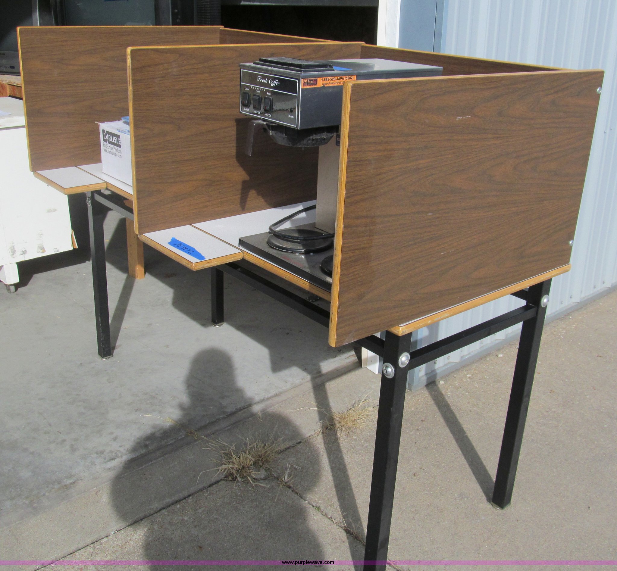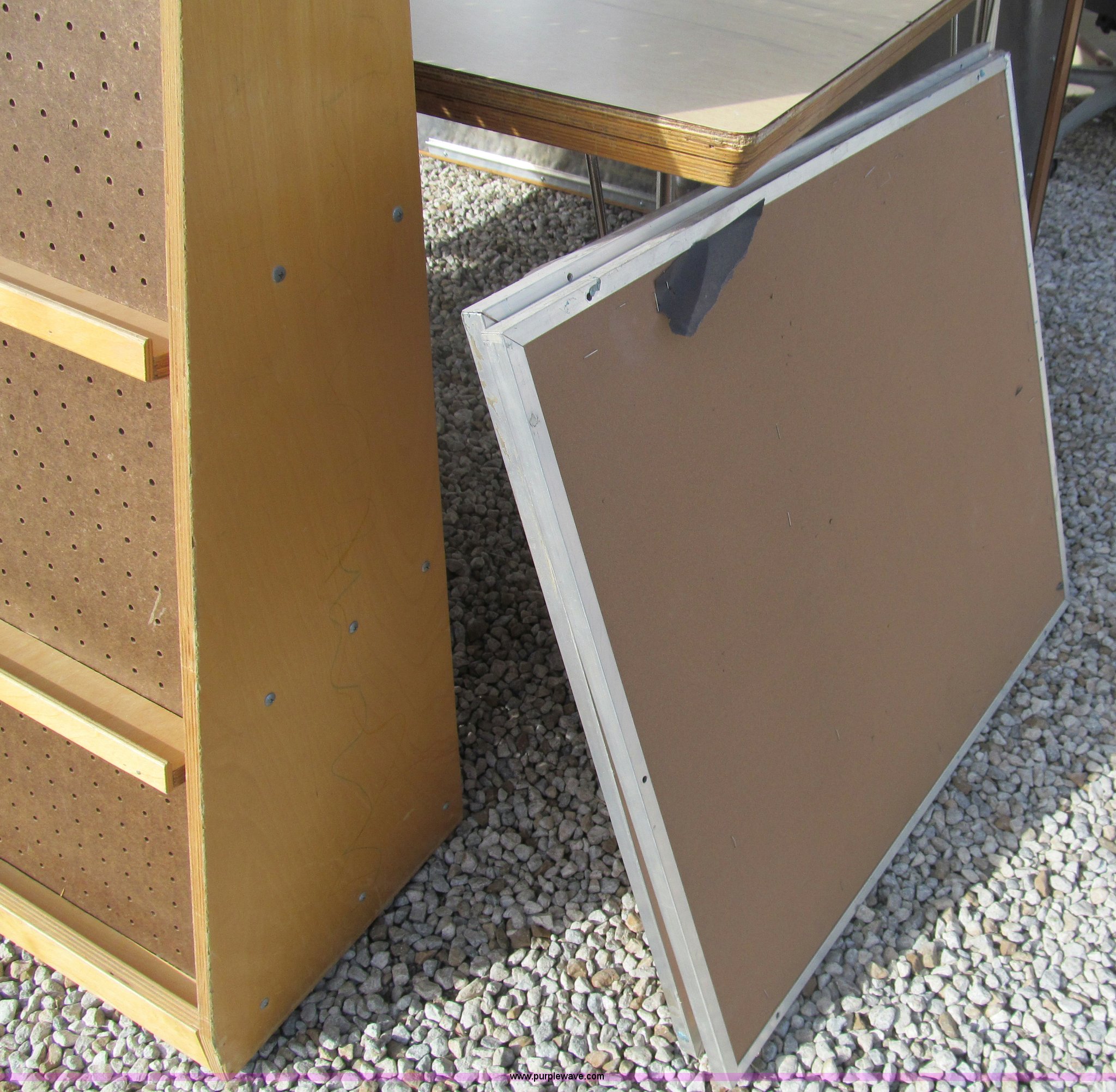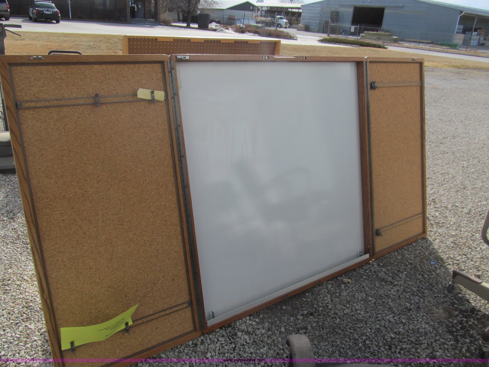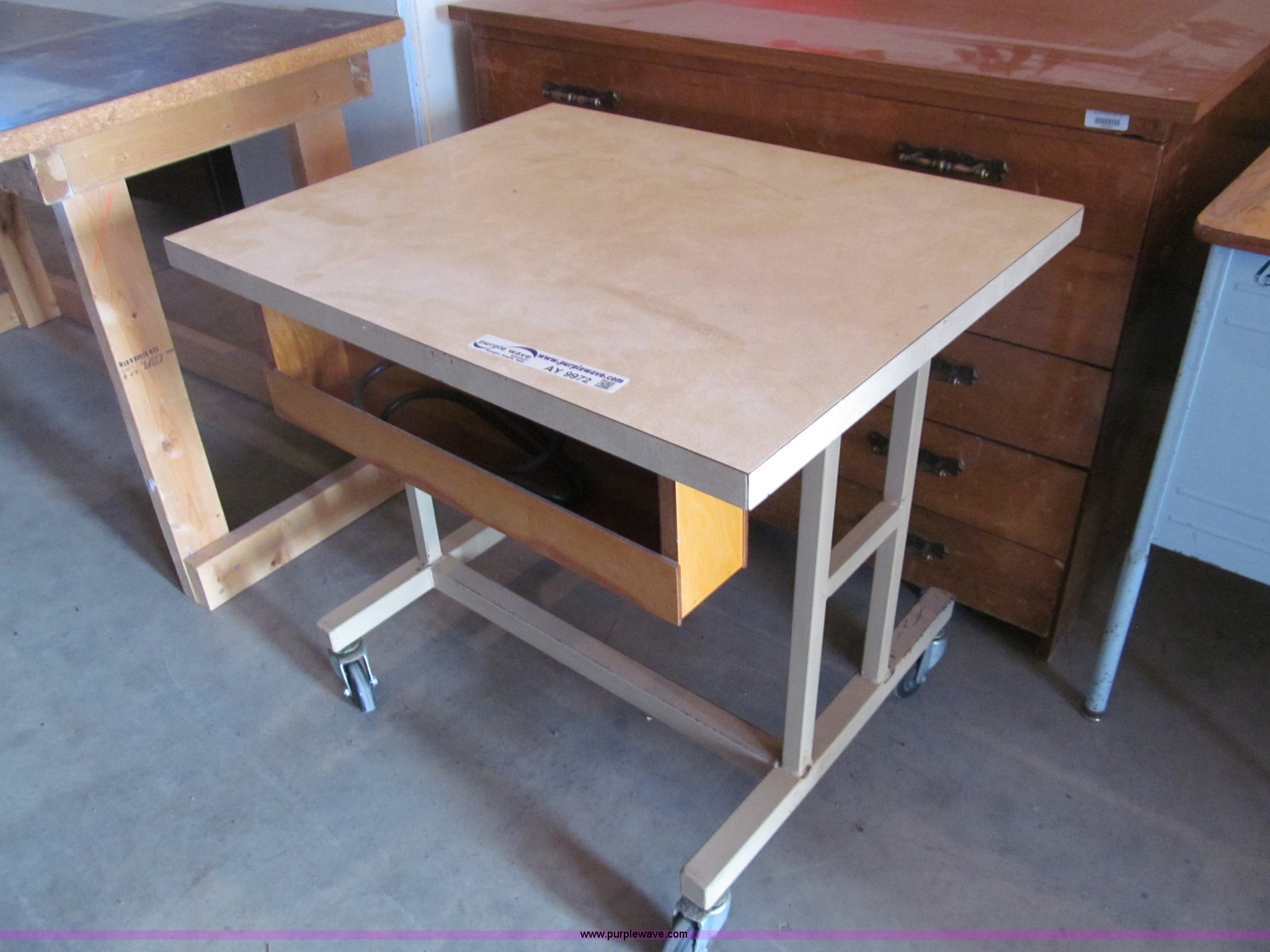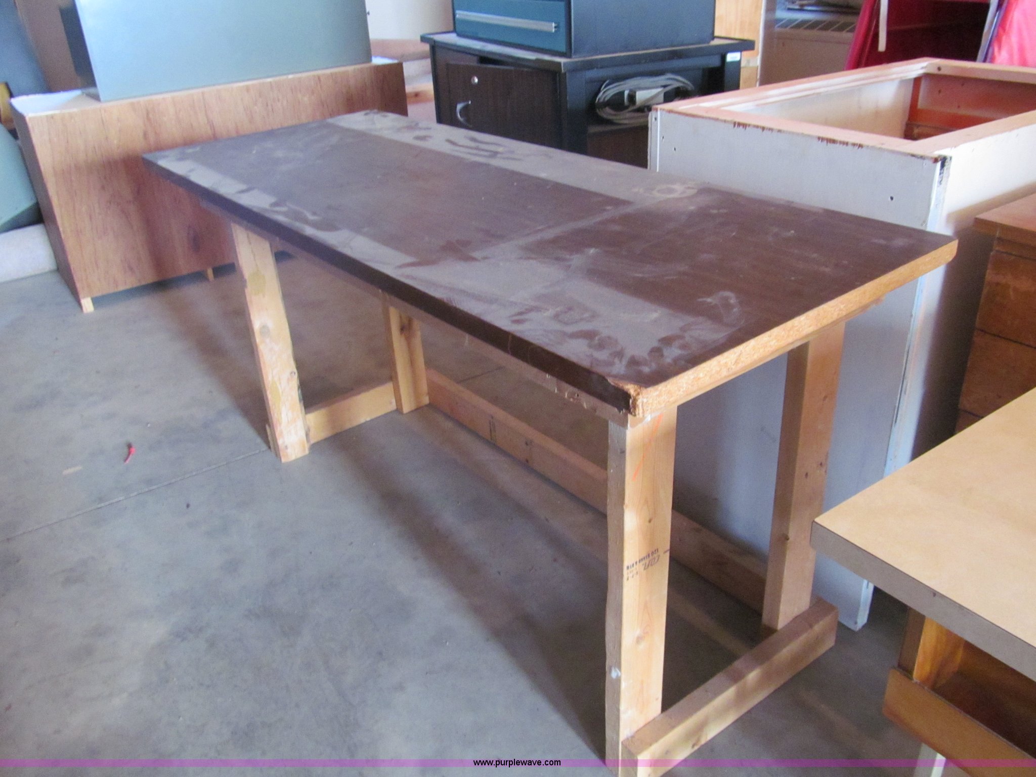 Purple Wave is selling a used Furniture in Kansas. This item is a Assorted wood desks and tables with the following: Rolling blueprint cabinet, Laminate top desk, Student desk, Roll around table, Wood lower cabinet, Long top wood table, Student activity table, Magazine rack, (2) display boards, Oak white board cabinet, Student privacy work center