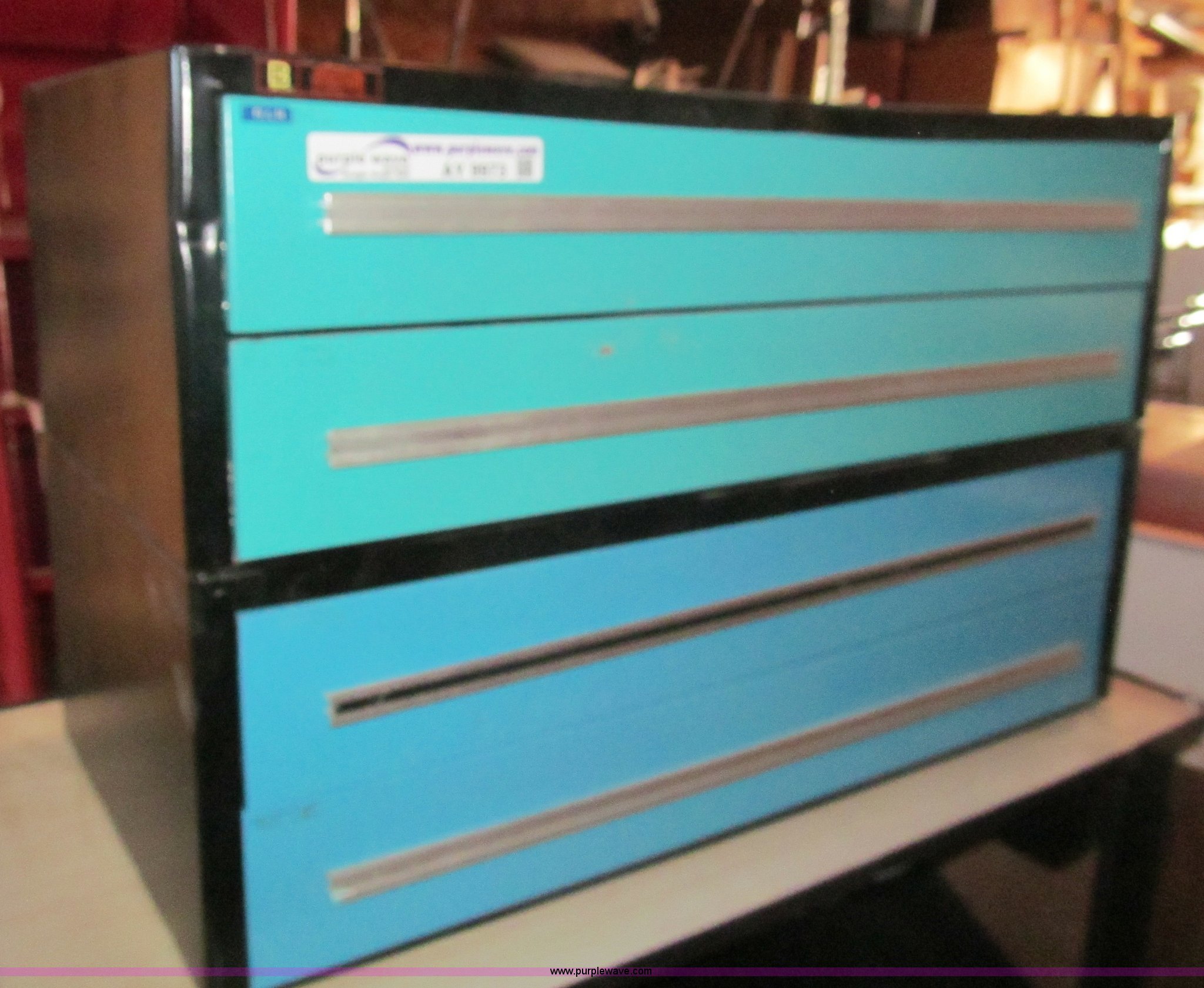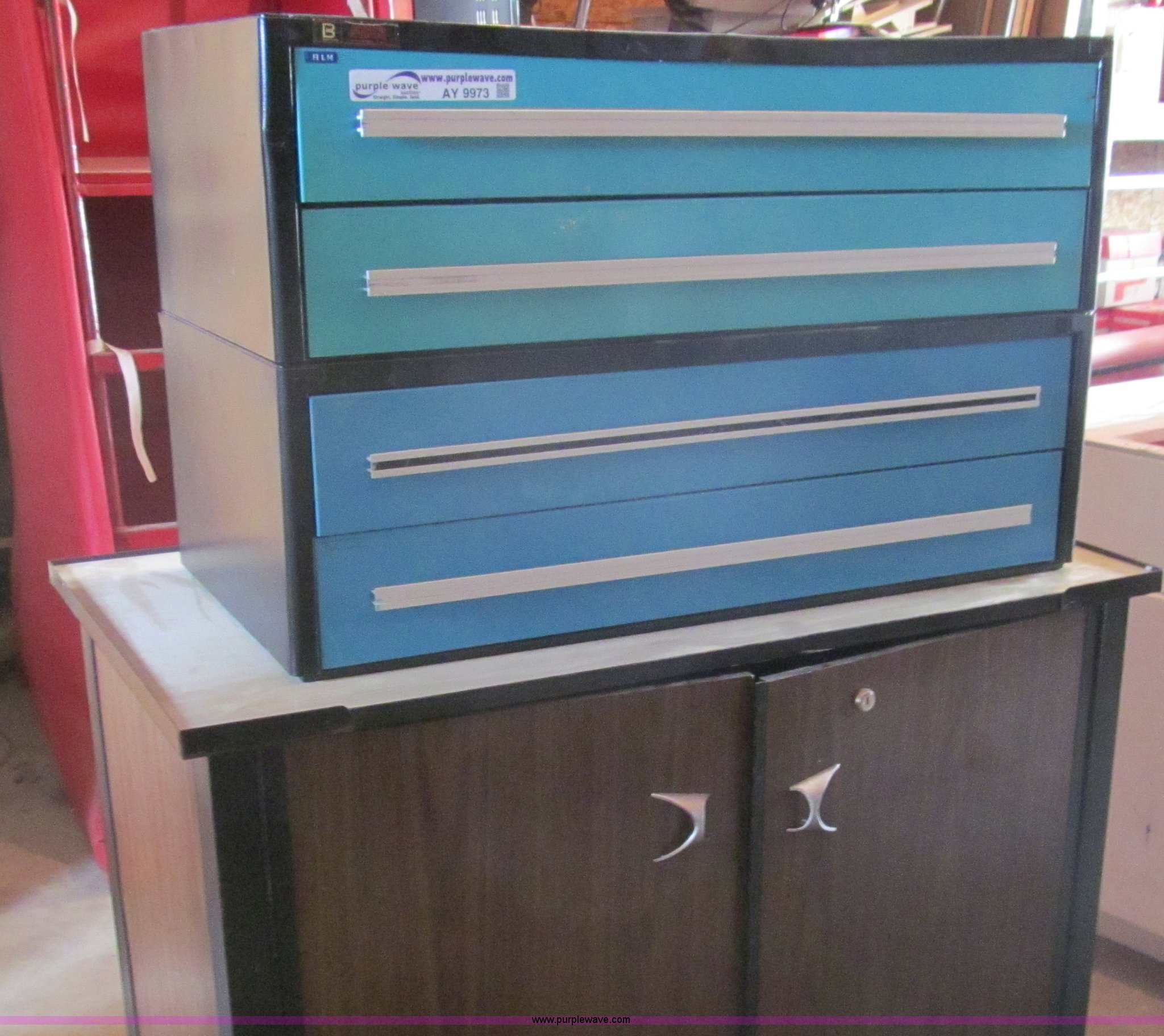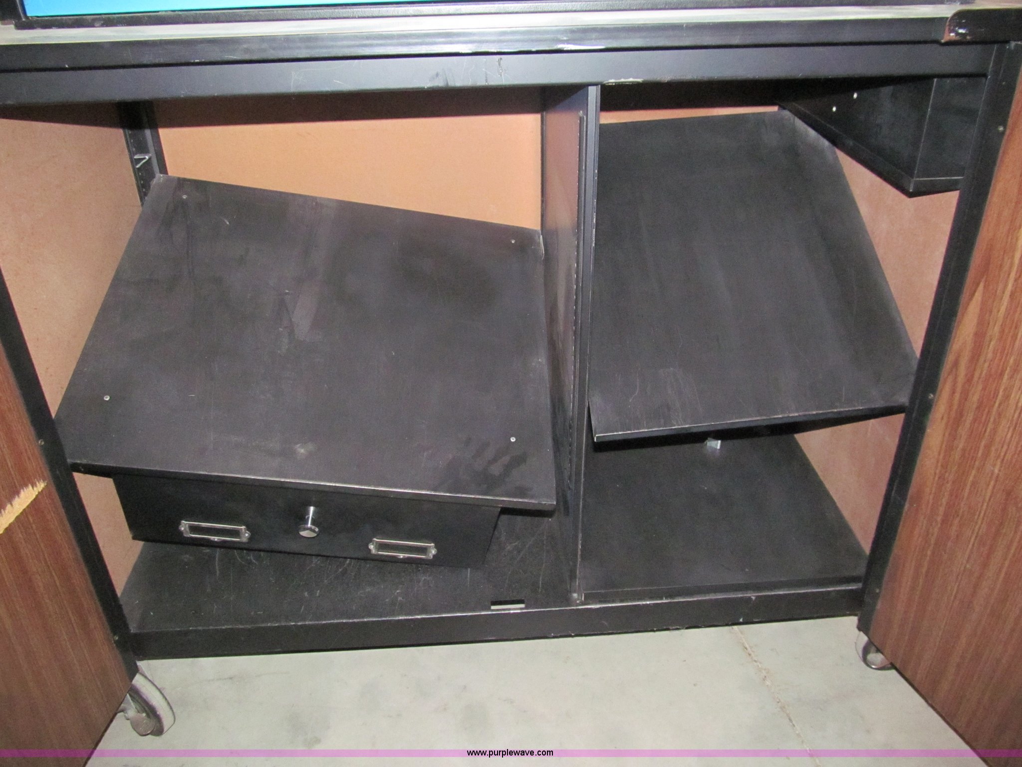 Purple Wave is selling a used Office Supplies and Equip. in Kansas. This item is a Rolling media cart with the following: Electrical outlet hookup, Four drawer metal file cabinet