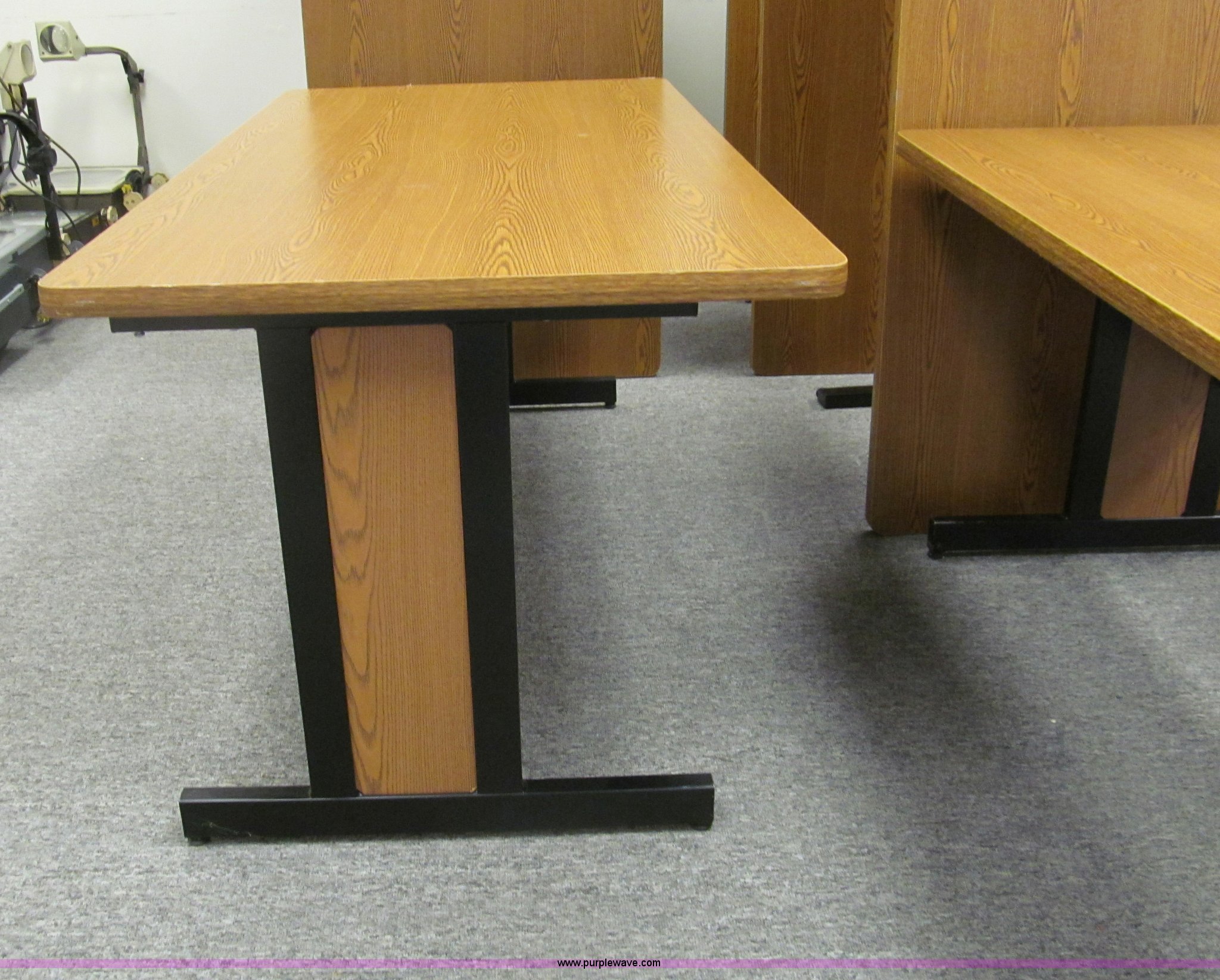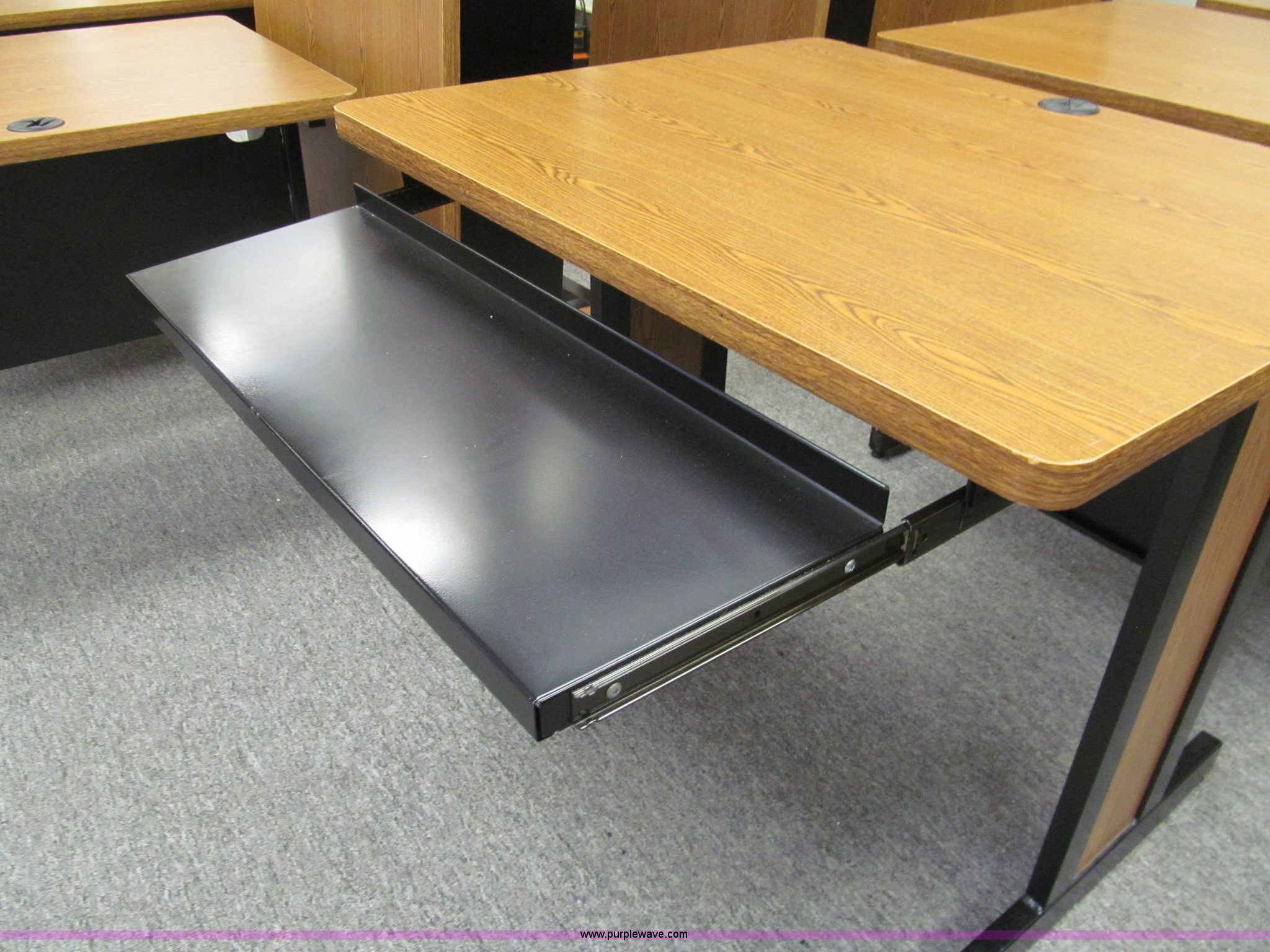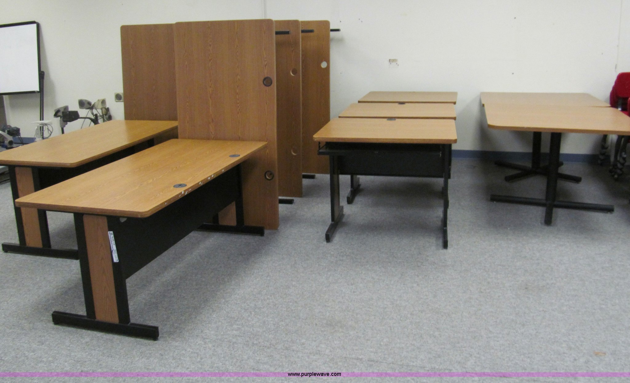 Purple Wave is selling a used Furniture in Kansas. This item is a Assorted furniture with the following: (3) computer desks, 60"L x 30"W x 26"H, (4) computer desks, 60"L x 30"W x 26"H, Cable holes, (3) computer desks, 36"L x 30"W x 30"H, Cord holes, Keyboard tray, (2) wood tables, 42" x 42" x 29", (3) computer tables, 54" x 27" x 26", Casters, Four drawer metal file cabinet