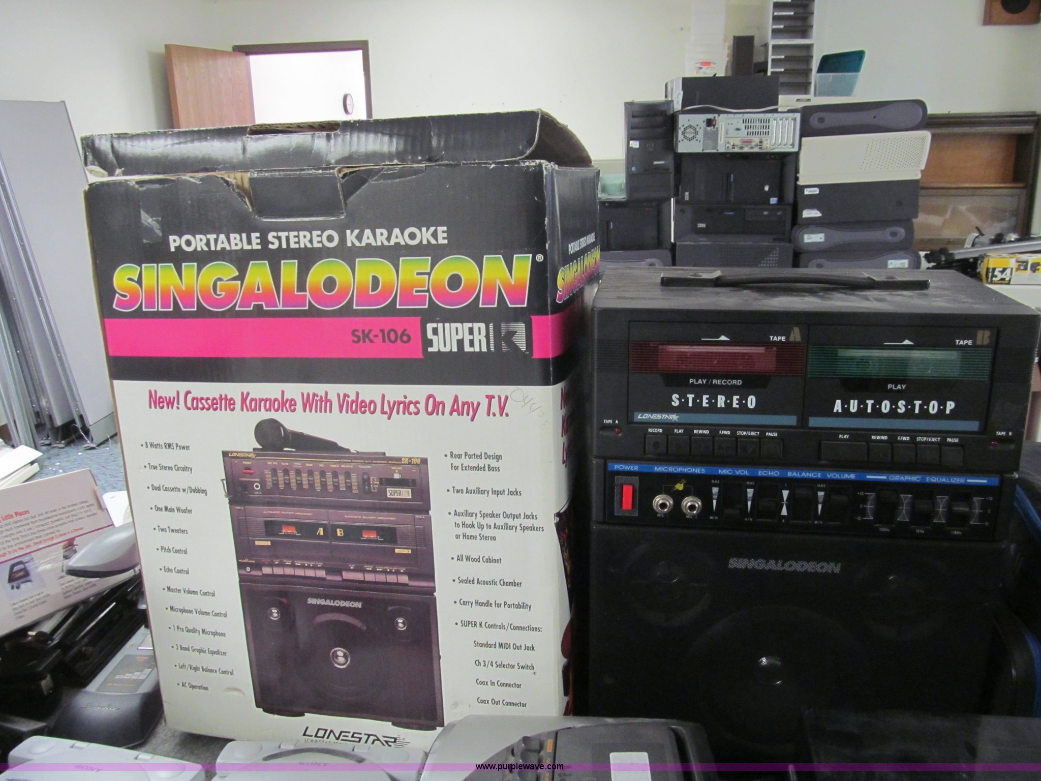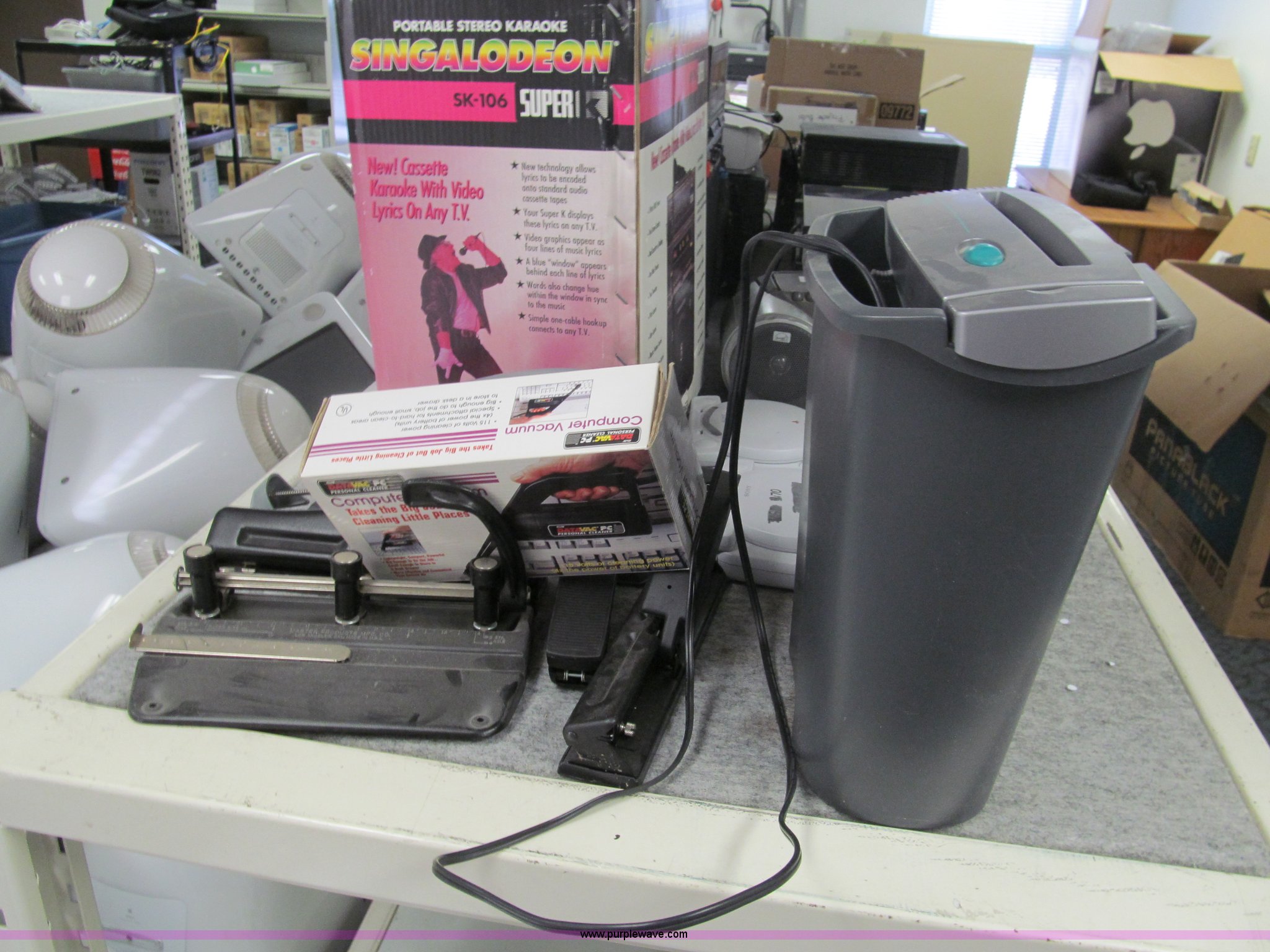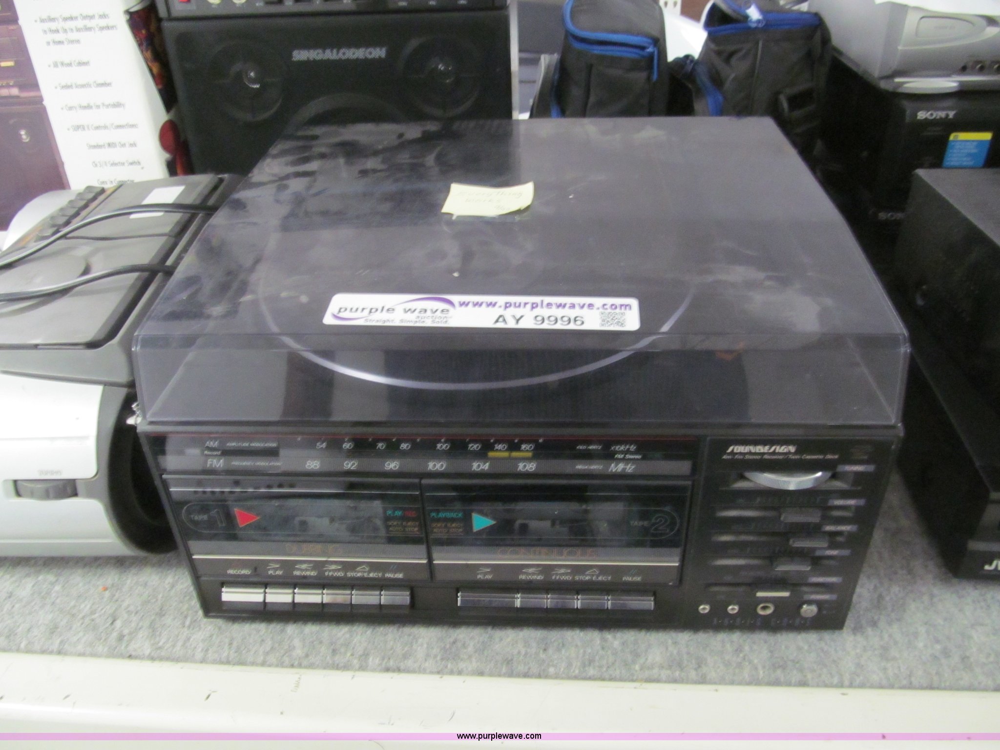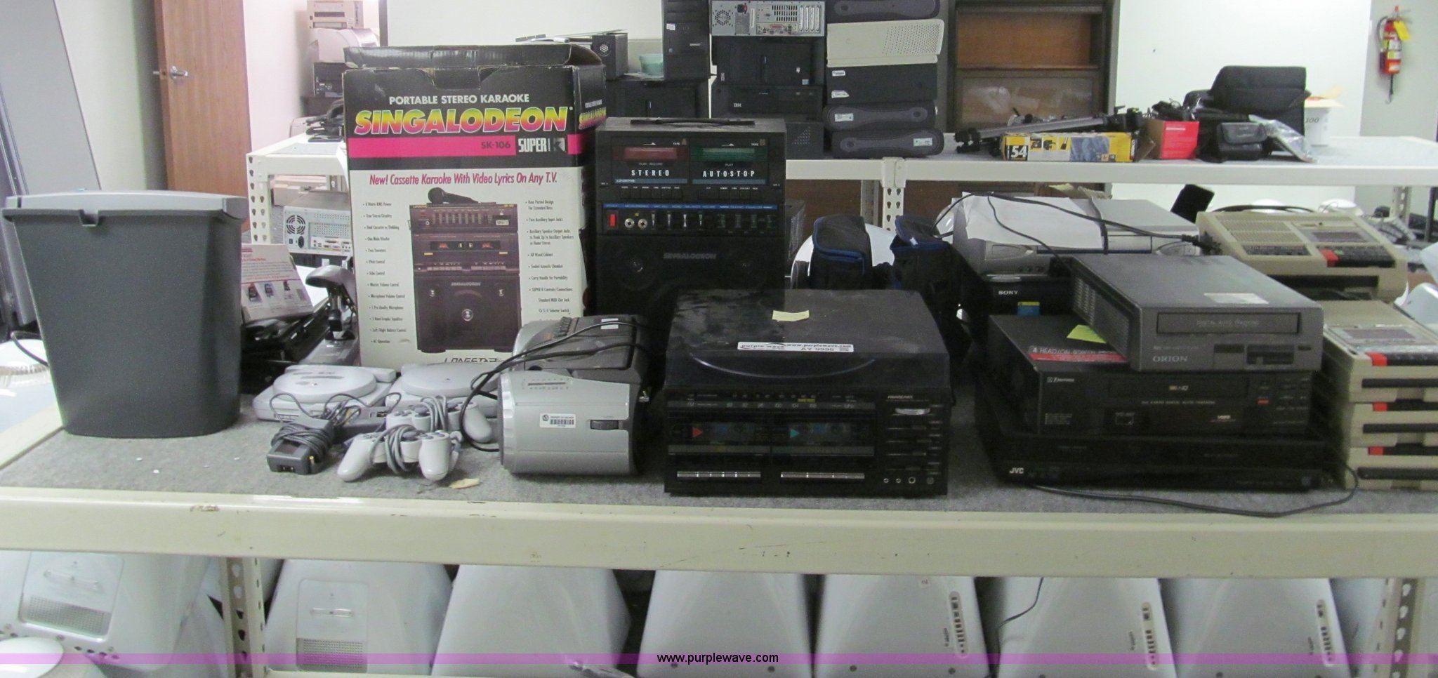 Purple Wave is selling a used Electronics in Kansas. This item is a Assorted electronics with the following: (2) portable karaoke stereo machines, (2) Sony PS ones, (5) VHS players, DVD/VHS player, Soundesign twin cassette deck, Sharp stereo, Fellowes paper shredder