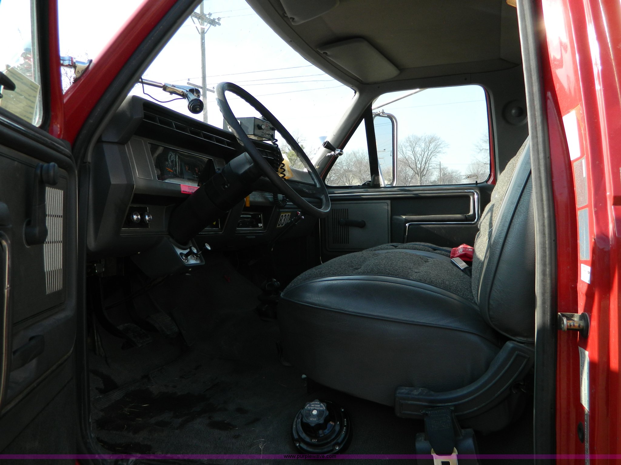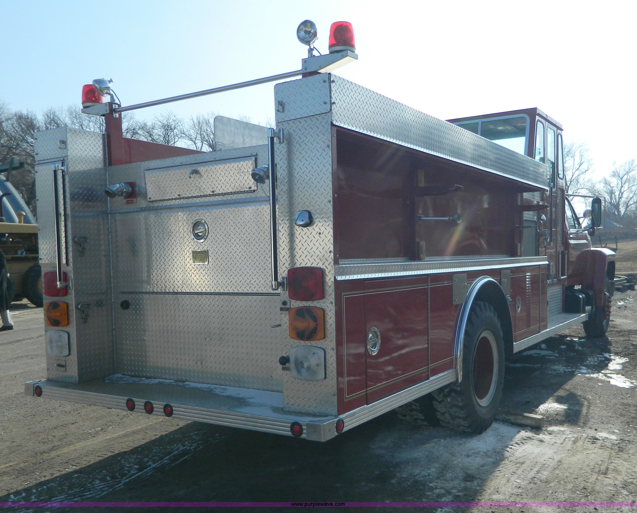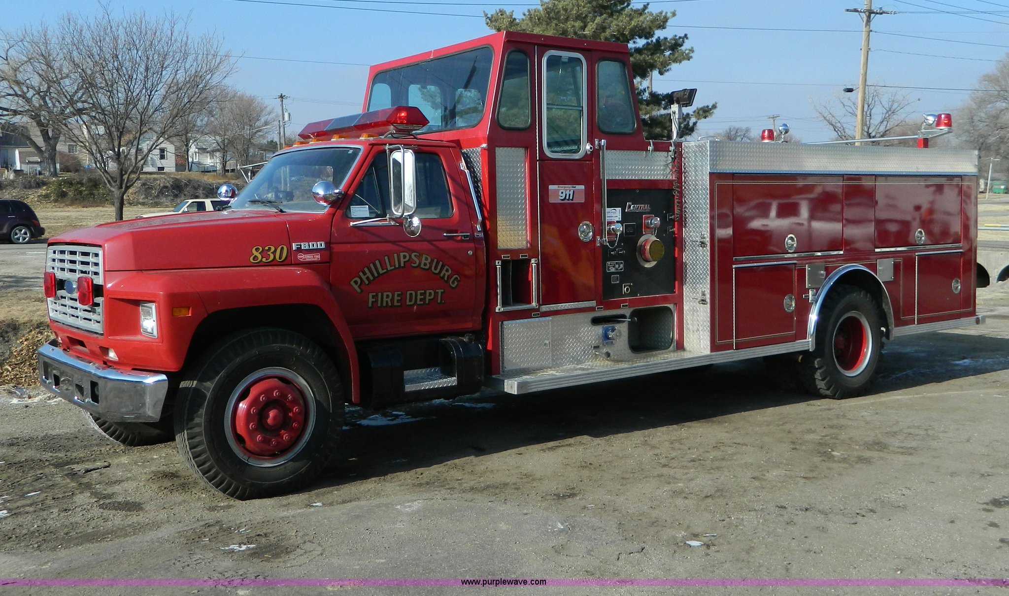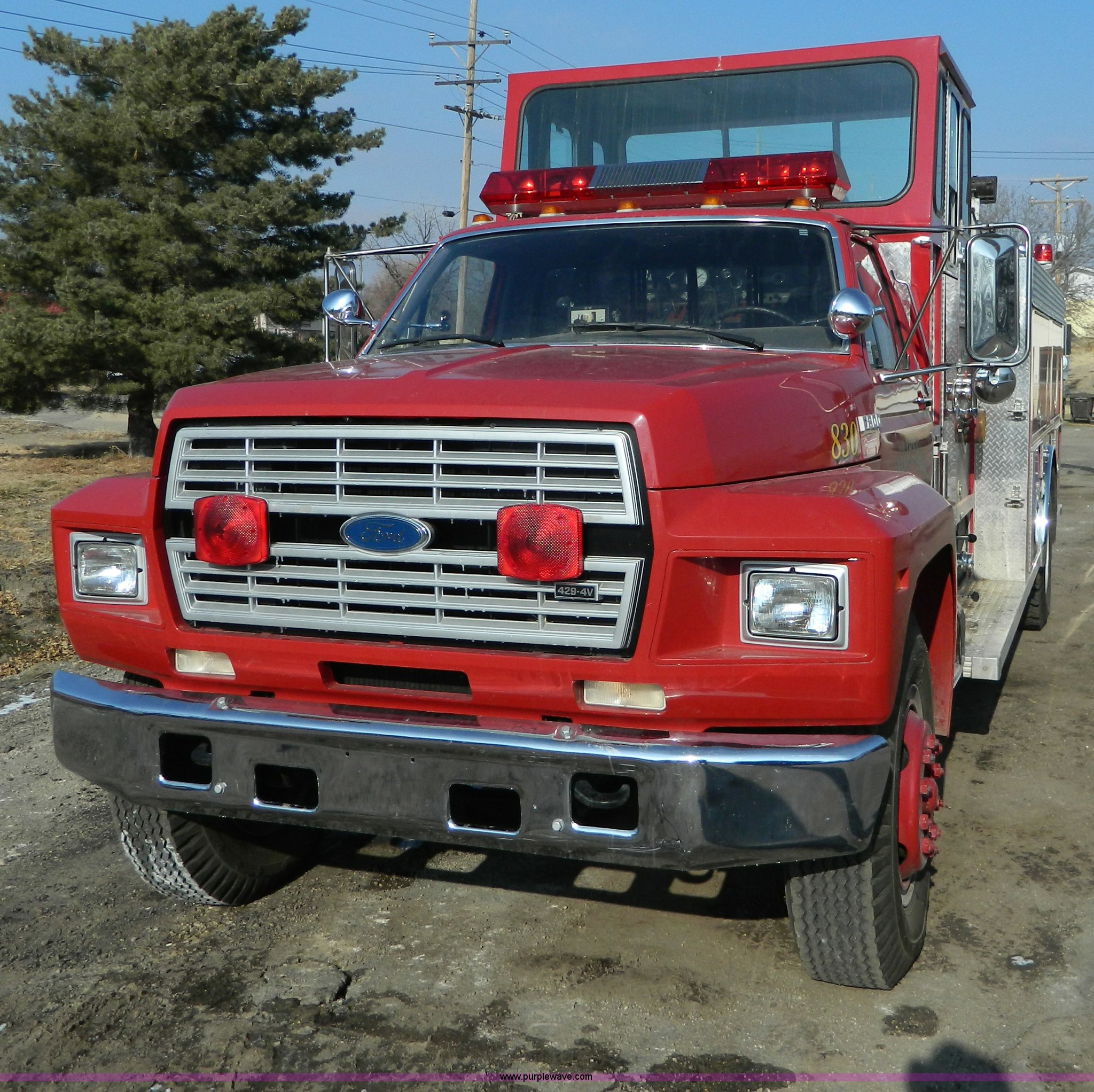Purple Wave is selling a used Fire Truck or Emergency Vehicle in Kansas. This item is a 1988 Ford F800 pumper fire truck with the following: 4,149 miles on odometer, 7.0L V8 gas engine, Five speed manual transmission, Two speed rear end, Heat, Central States 29' body, Darley 1,250 gpm pump, Canopy cab 108" ground to top, Rear hose reel, Dyna Pro Gas 4500E generator, (2) 1.5" hose cross lays, (2) 6" steamer inlets, Deck monitor, Foam eductor, Electronic siren, Side and rear 2.5" discharge piping, Rear compartment 1.5" pre-connect hose, 1,000 gallon booster tank, Aluminum hose bed, Dupont Urethane paint, Force XL light bar, (2) post mount spotlights in cab, 225" wheelbase, 10.00-20 front tires, 11.00-20 rear tires, GVWR 30,000 lbs