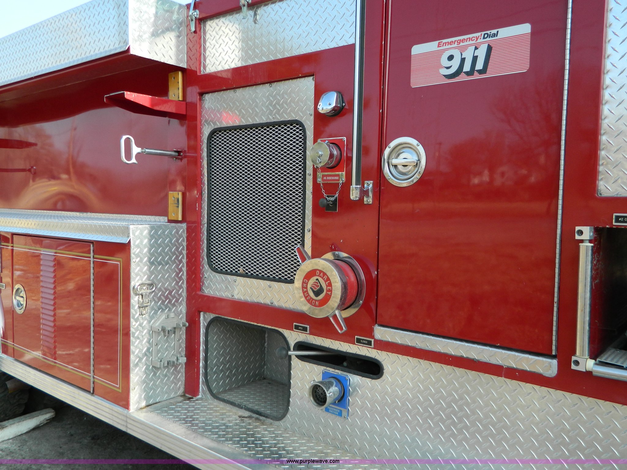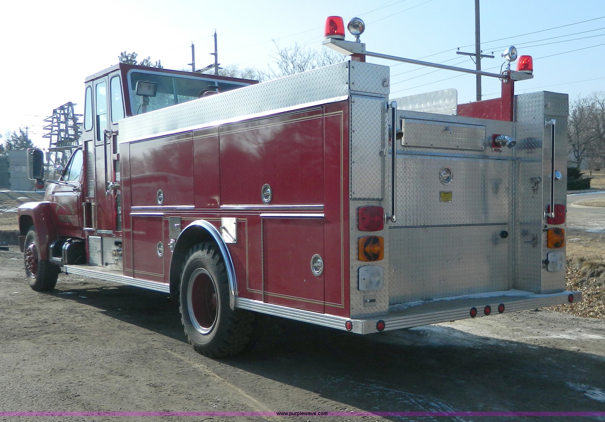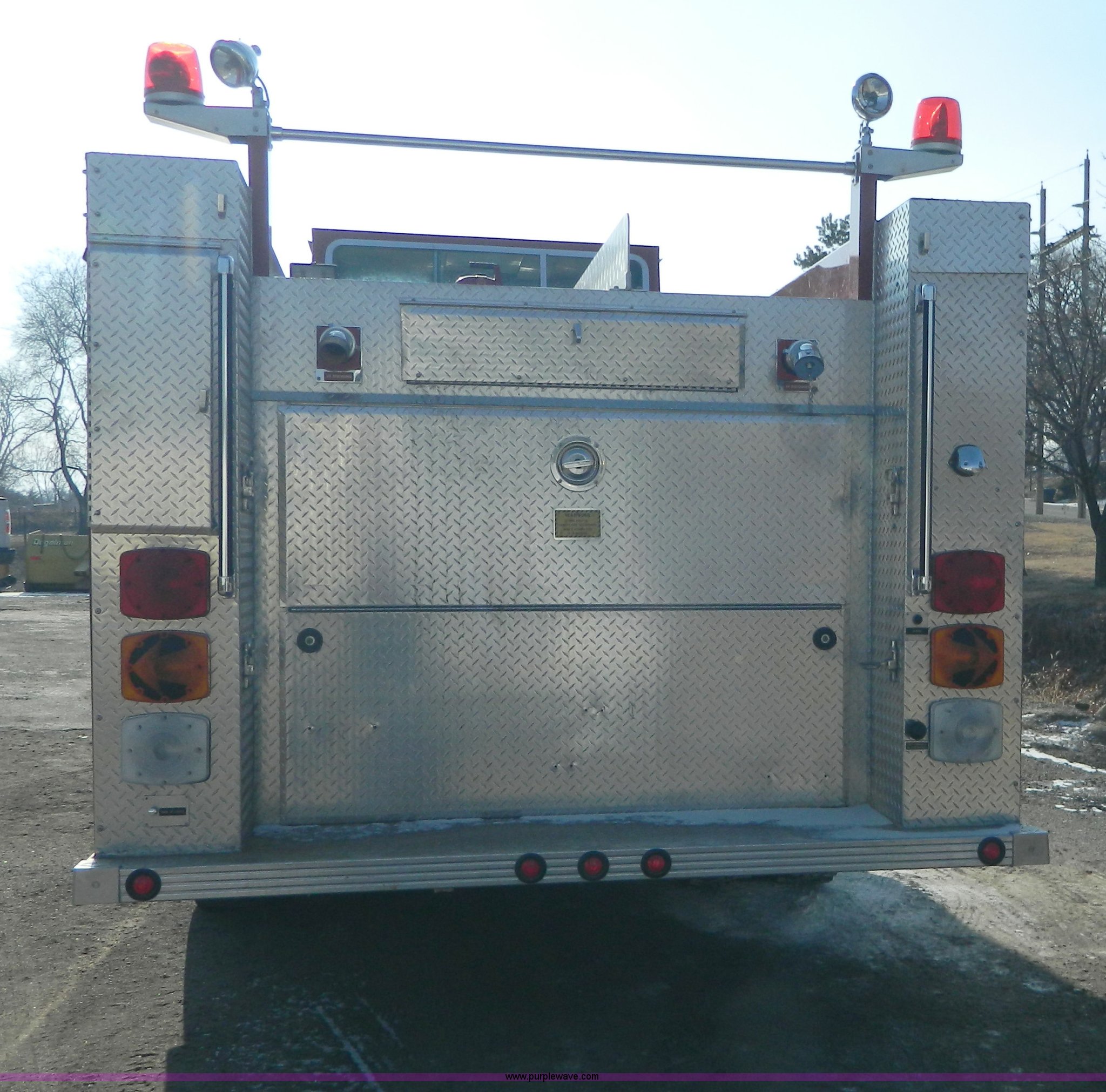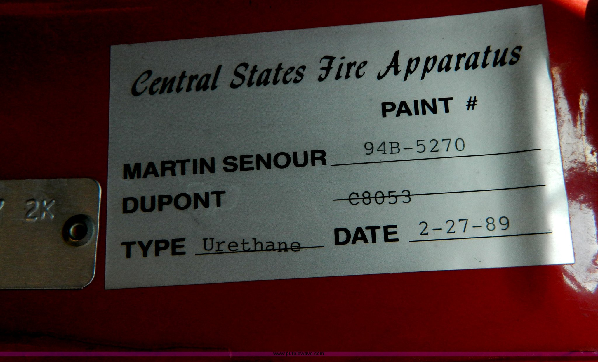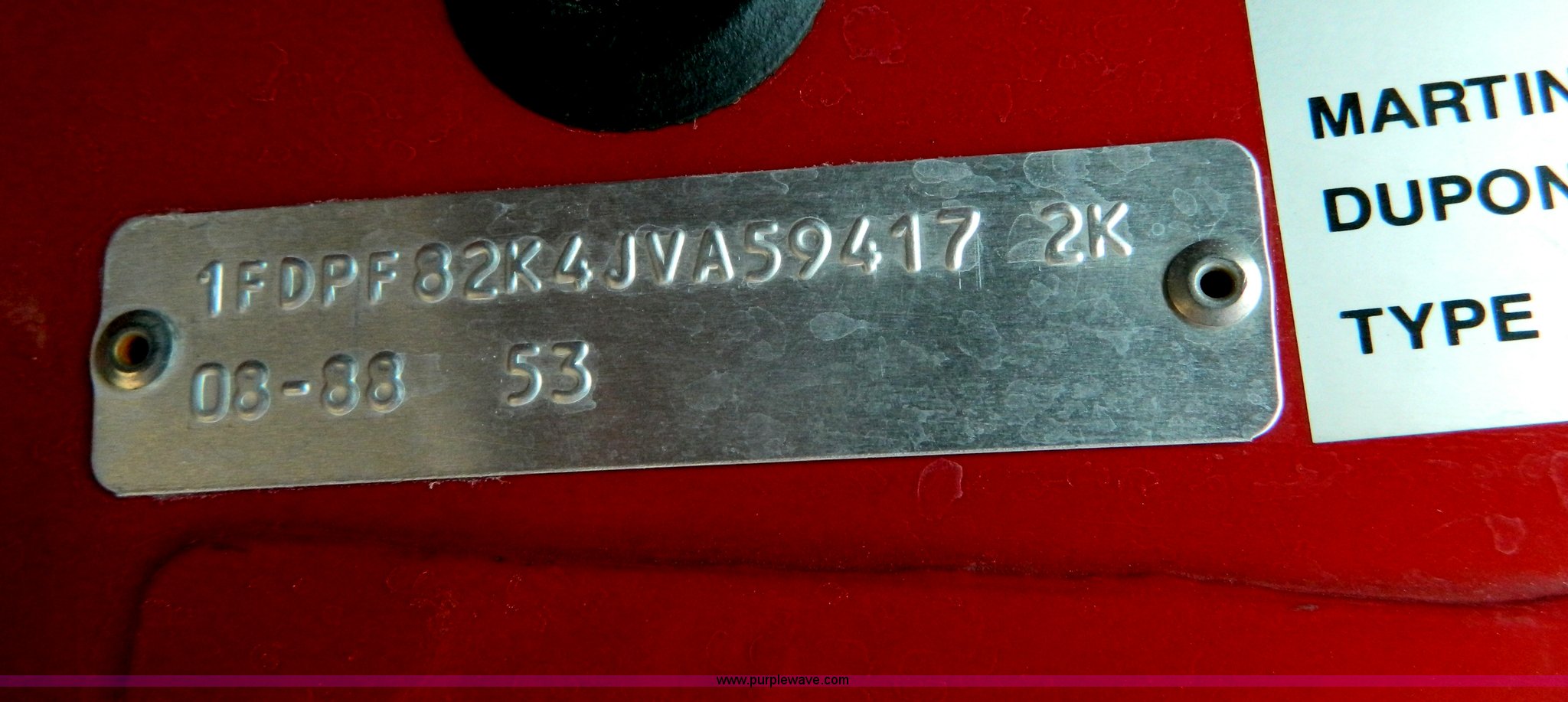 Purple Wave is selling a used Fire Truck or Emergency Vehicle in Kansas. This item is a 1988 Ford F800 pumper fire truck with the following: 4,149 miles on odometer, 7.0L V8 gas engine, Five speed manual transmission, Two speed rear end, Heat, Central States 29' body, Darley 1,250 gpm pump, Canopy cab 108" ground to top, Rear hose reel, Dyna Pro Gas 4500E generator, (2) 1.5" hose cross lays, (2) 6" steamer inlets, Deck monitor, Foam eductor, Electronic siren, Side and rear 2.5" discharge piping, Rear compartment 1.5" pre-connect hose, 1,000 gallon booster tank, Aluminum hose bed, Dupont Urethane paint, Force XL light bar, (2) post mount spotlights in cab, 225" wheelbase, 10.00-20 front tires, 11.00-20 rear tires, GVWR 30,000 lbs