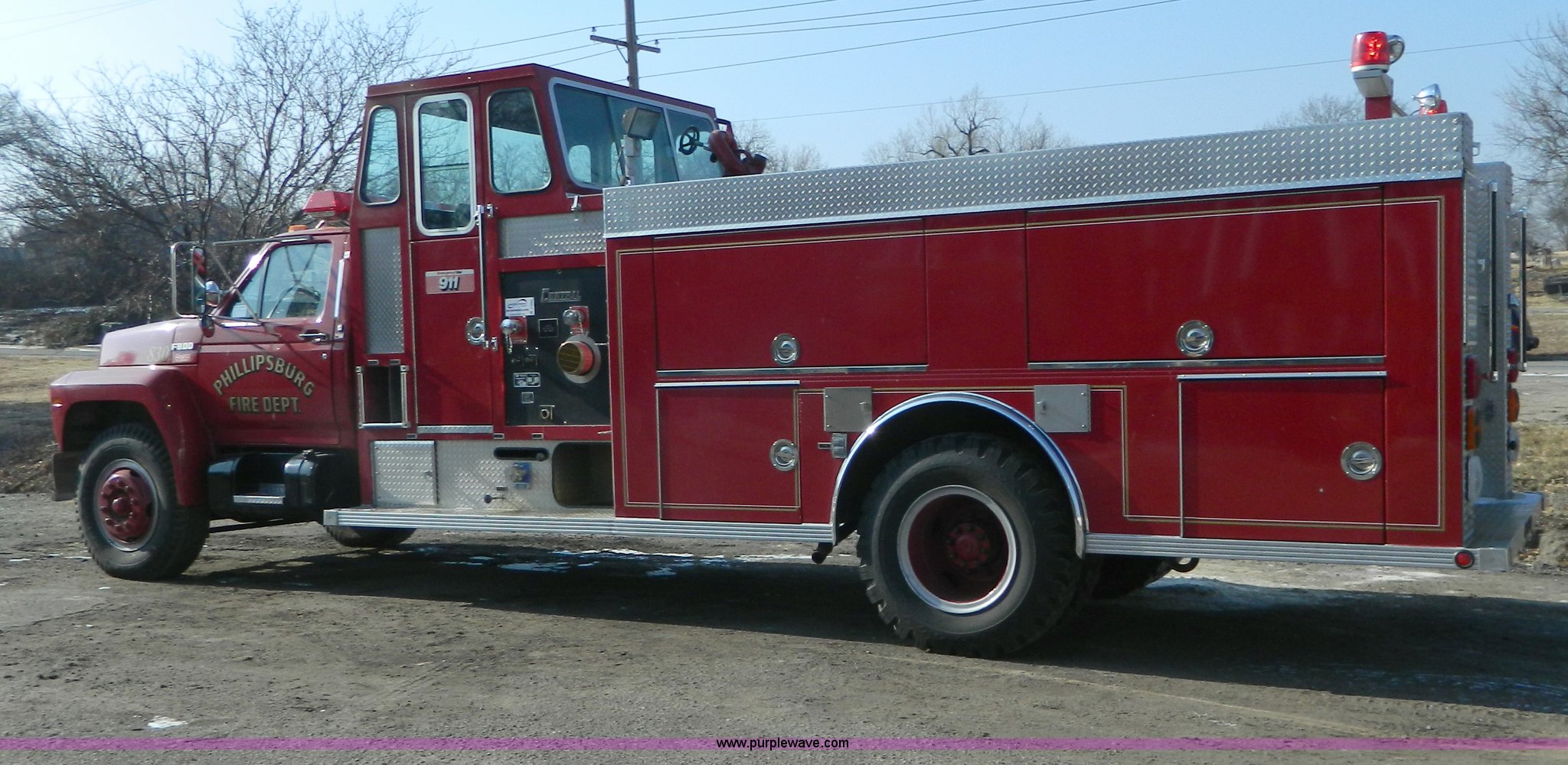 1988 Ford F800 pumper fire truck. 4,149 miles on odometer, 7.0L V8 gas engine, Five speed manual transmission, Two speed rear end, Heat, Central States 29' body Darley 1,250 gpm pump, Canopy cab 108" ground to top, Rear hose reel, Dyna Pro Gas 4500E generator, (2) 1.5" hose cross lays , (2) 6" steamer inlets, Deck monitor, Foam eductor, Electronic siren, Side and rear 2.5" discharge piping, Rear compartment 1.5" pre-connect hose, 1,000 gallon booster tank, Aluminum hose bed, Dupont Urethane paint, Force XL light bar, (2) post mount spotlights in cab, 225" wheelbase, 10.00-20 front tires, 11.00-20 rear tires, GVWR 30,000 lbs. 1FDPF82K4JVA59417. City of Phillipsburg. 945 Second. Phillipsburg, KS 67661