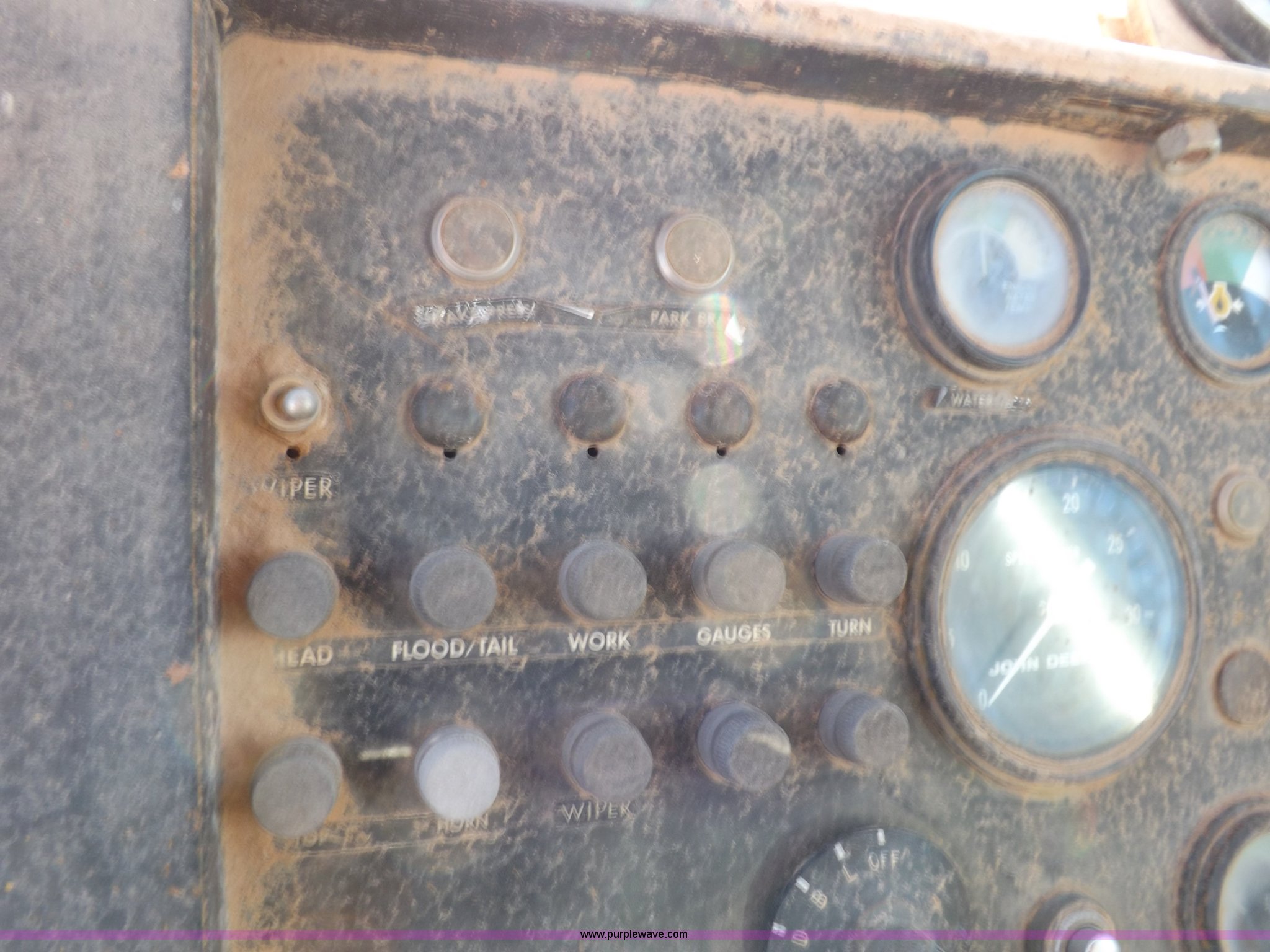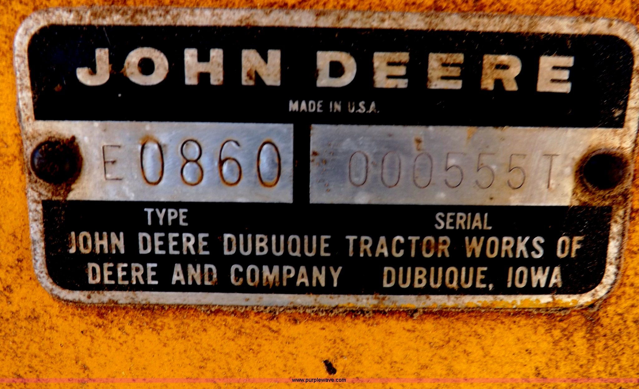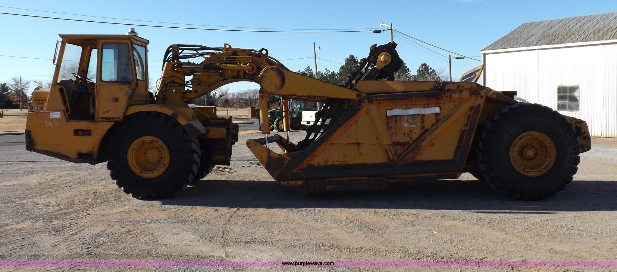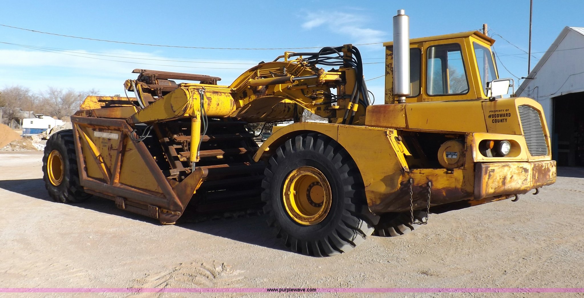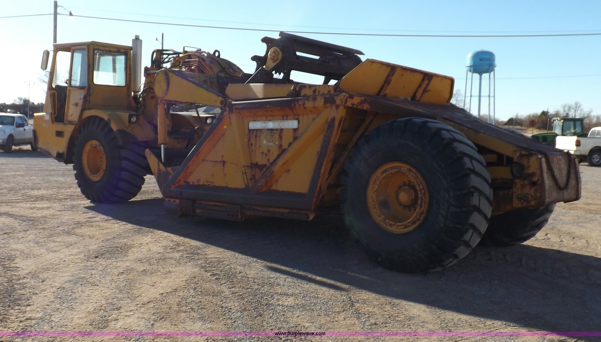 Purple Wave is selling a used Elevating Scraper in Oklahoma. This item is a 1971 John Deere 860 elevating scraper with the following: 1,252 hours on first hour meter, 840 hours on second hour meter, Detroit 6057N six cylinder diesel engine, Powershift transmission, 5F-1R gears, Differential lock, Heat, Air suspension seat, 15 cu. yd. capacity, 8'9"W three section reversible cutting edge, Hydraulic lift, gate, and elevator controls, Elevator reverse, Hydraulic brakes, 16.5-25 tires, Recently replaced three tires, 42,300 lbs. base operating weight, 36'L x 9.5'W x 11'2"H overall, Recently replaced batteries, Turn cylinder mounts repaired, Ritto bowl arm repaired, Elevator chains not in sync, Lights damaged, Cracked door glass, Rust, Sheet metal damage, Serial 000555T