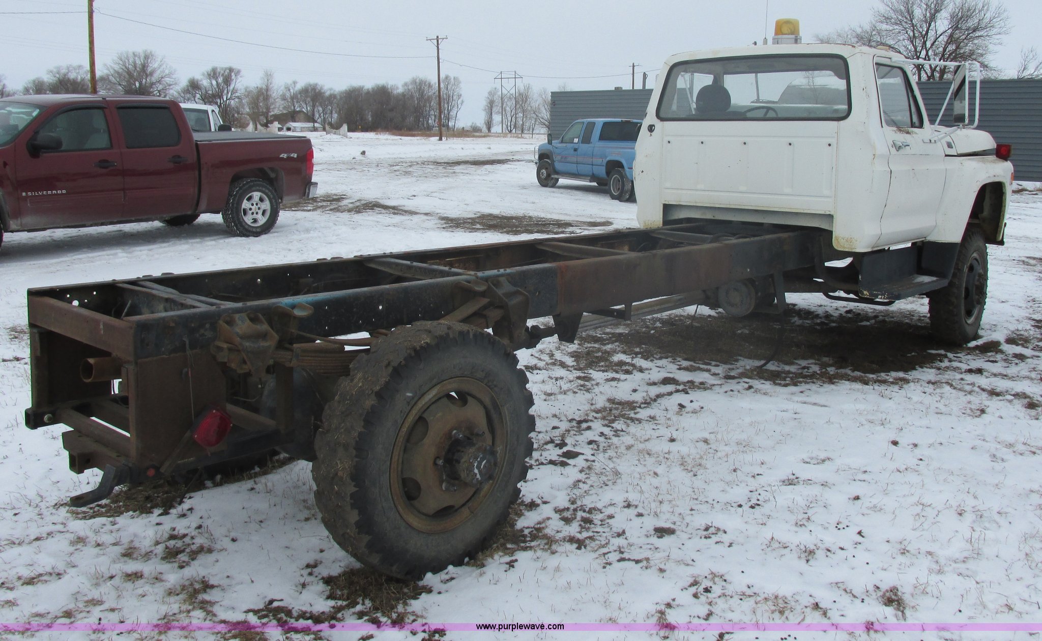 Purple Wave is selling a used Truck Chassis in South Dakota. This item is a 1977 Ford F600 truck cab and chassis with the following: 55,635 actual miles, Ford 361 C.I.D. gas engine, Allison automatic transmission, Four wheel drive, Heat, Non-operational, Stretched frame, Spring suspension, 218" wheelbase, 8.25-20 tires, Dual rear tires included, Seat unattached, Molding removed, Rust