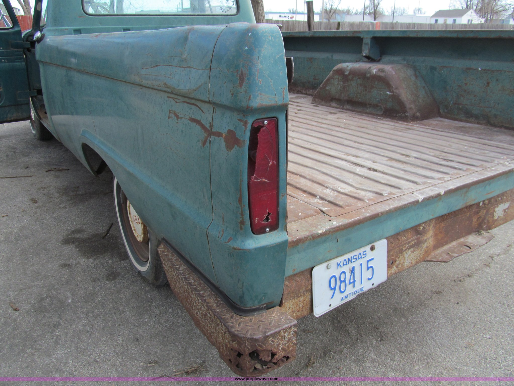 Purple Wave is selling a used Compact Pickup or Van in Kansas. This item is a 1965 Ford F100 pickup truck with the following: 76,563 miles on odometer, Not Actual Mileage, Six cylinder gas engine, Four speed manual transmission, Heat, AM/FM, Manual windows and locks, Vinyl interior, Long bed, Twin I beam, 129" wheelbase, P205/75R15 tires, GVWR 5,000 lbs, No tailgate