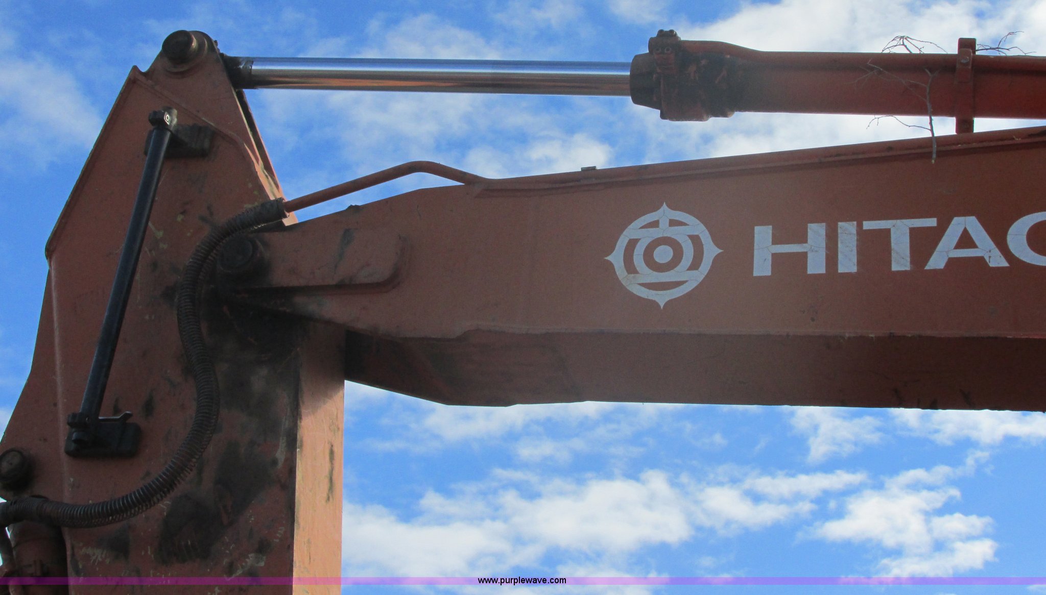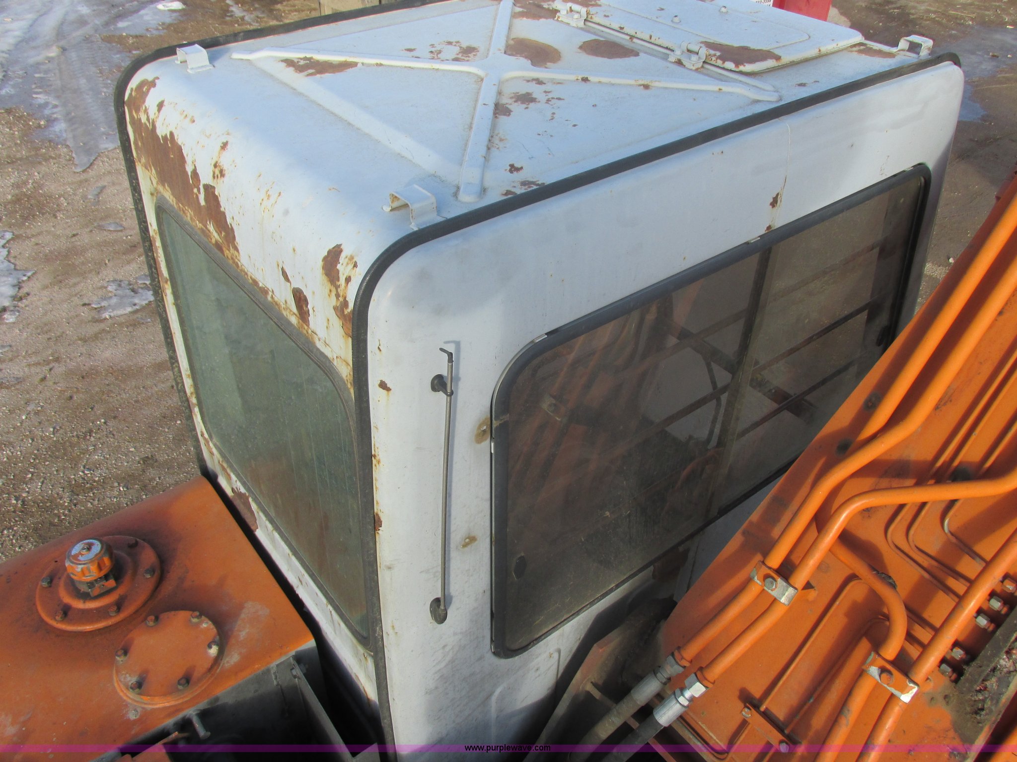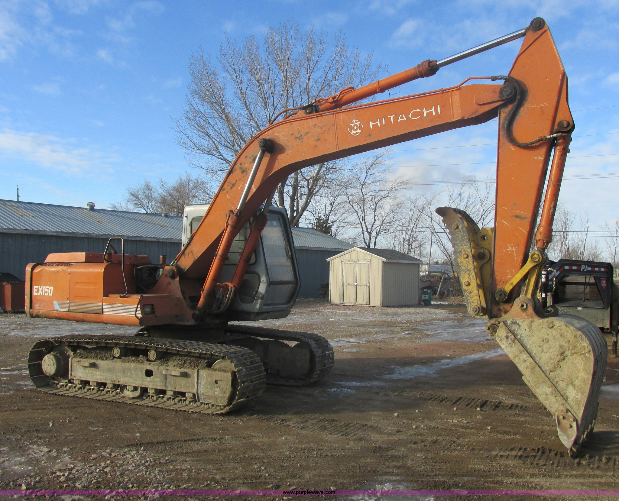 Purple Wave is selling a used Hydraulic Excavator in South Dakota. This item is a 1989 Hitachi EX150 excavator with the following: 8,282 hours on meter, Hours may vary, still in use, Isuzu diesel engine, 91 HP, EROPS, Top hatch opening, AM/FM/cassette, Electronic total control system, 8.5'L stick, Mechanical thumb, 40" five tooth bucket, Bolt-on scraper edge, 24" tracks, 32,800 lbs. base operating weight, Surface rust, Body damage, Service record available upon request, Serial 133-1026