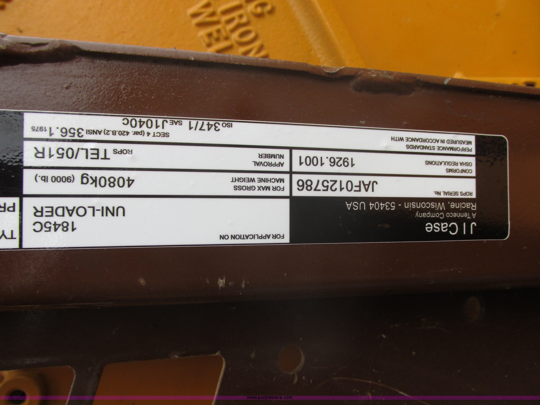 Purple Wave is selling a used Skid Steer Loader in South Dakota. This item is a 1994 Case 1845C skid steer with the following: 1,335 hours on meter, Case 4-290 239 C.I.D. four cylinder diesel engine, 57 HP, Hydrostatic transmission, ROPS, Hand and foot controls, Block heater, Manual quick coupler, Front and rear work lights, 72"W bucket, Bolt-on cutting edge, 12-16.5 tires, 6,185 lbs. base operating weight, Serial JAF0125786