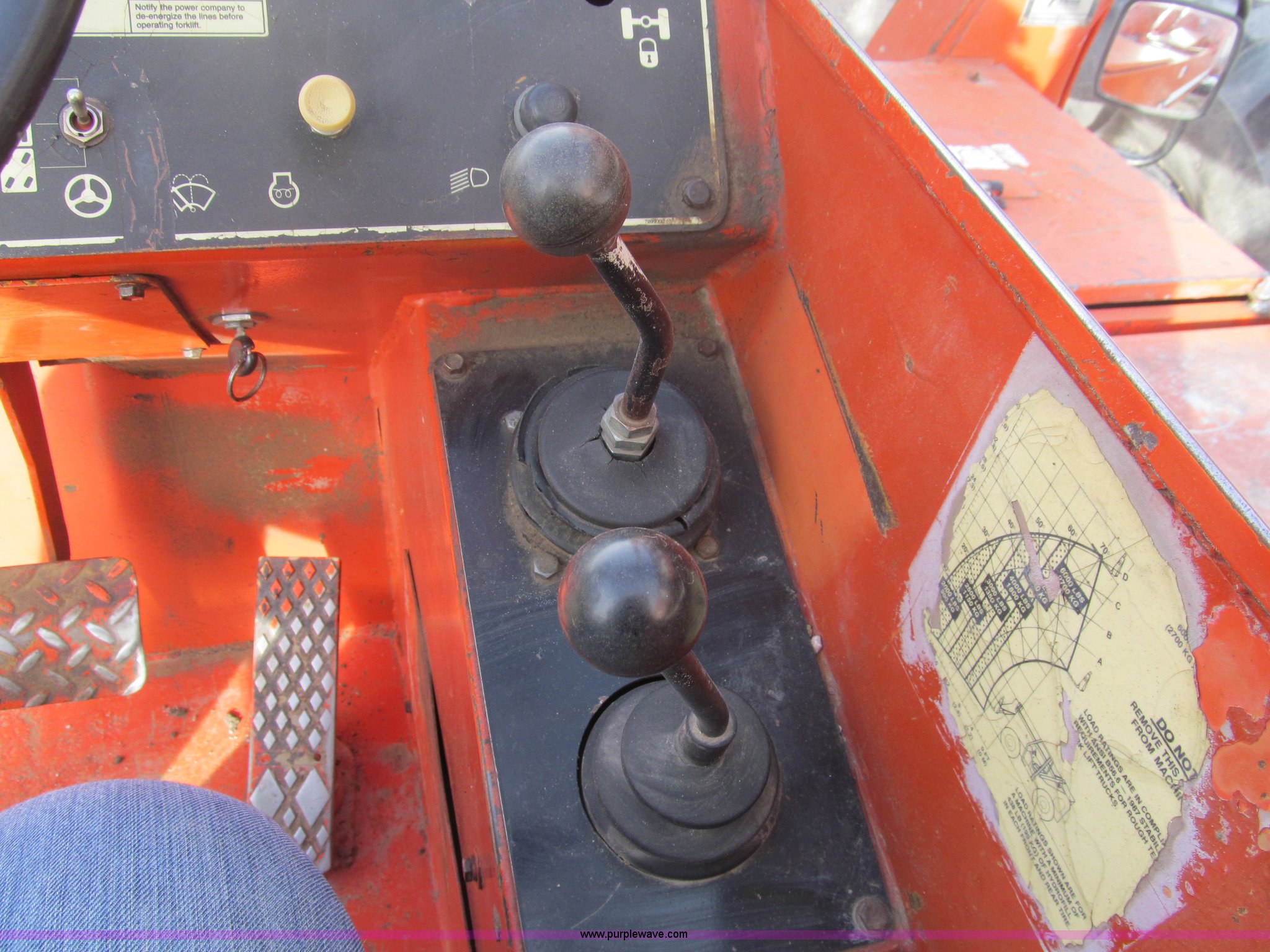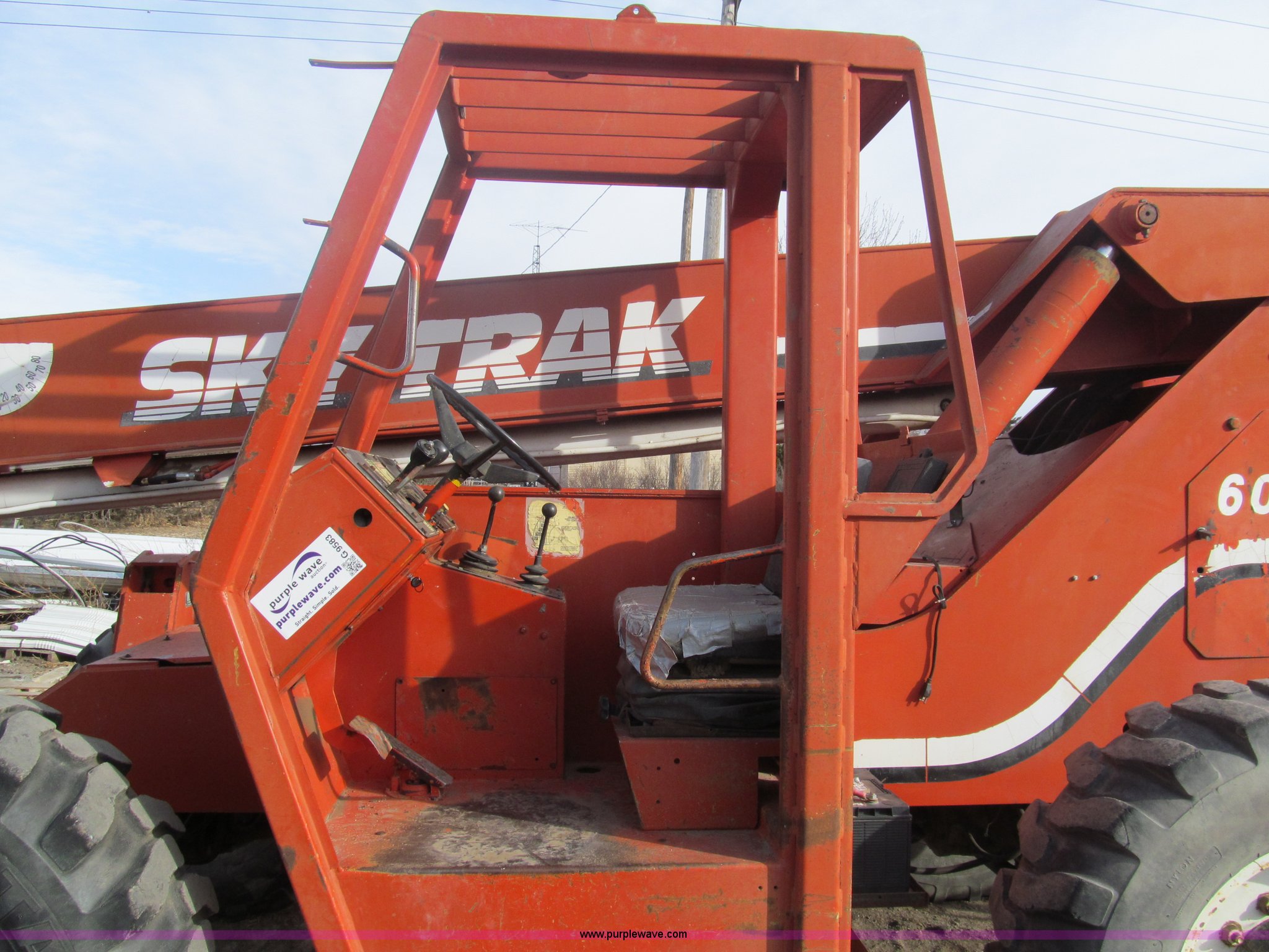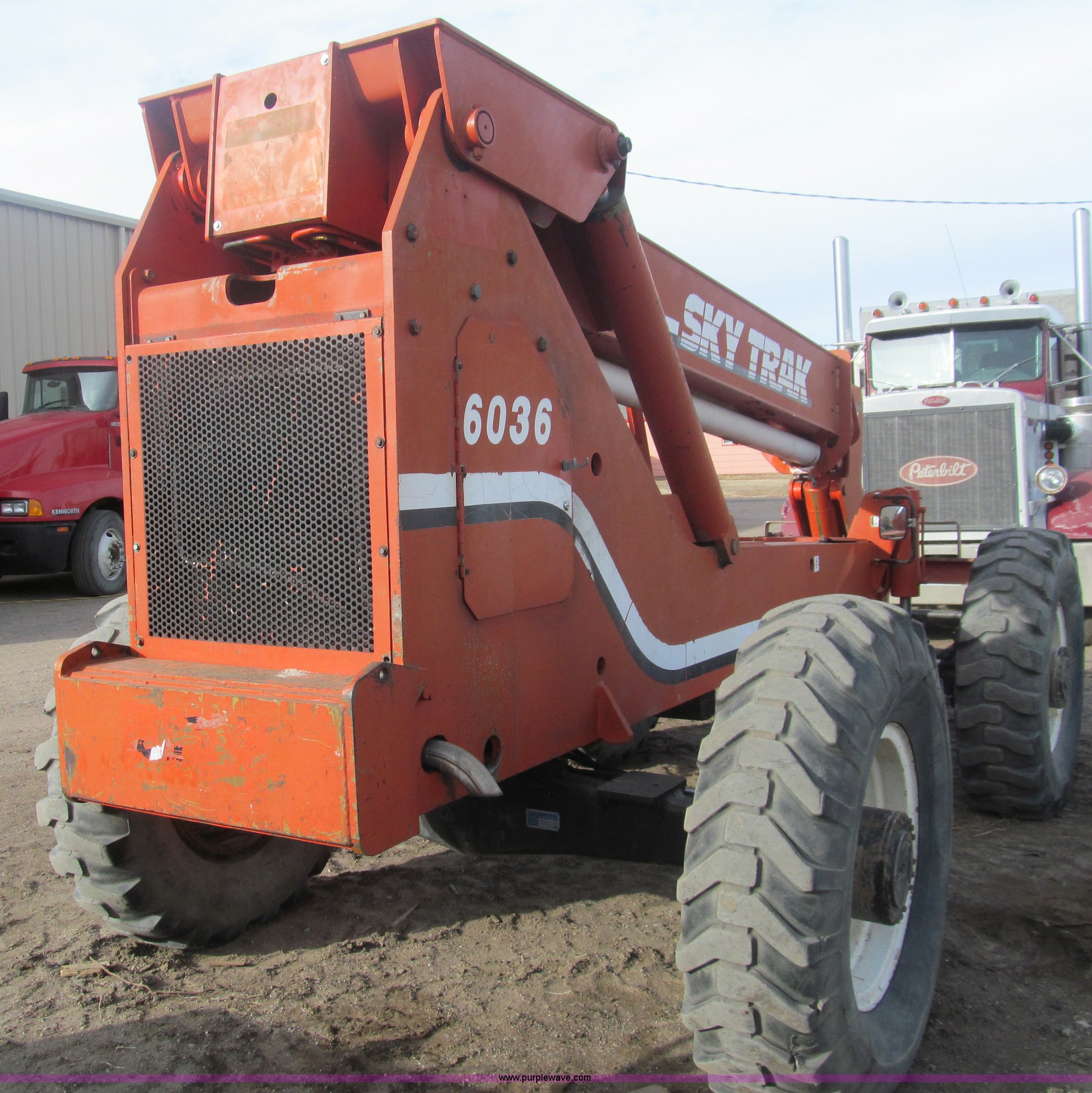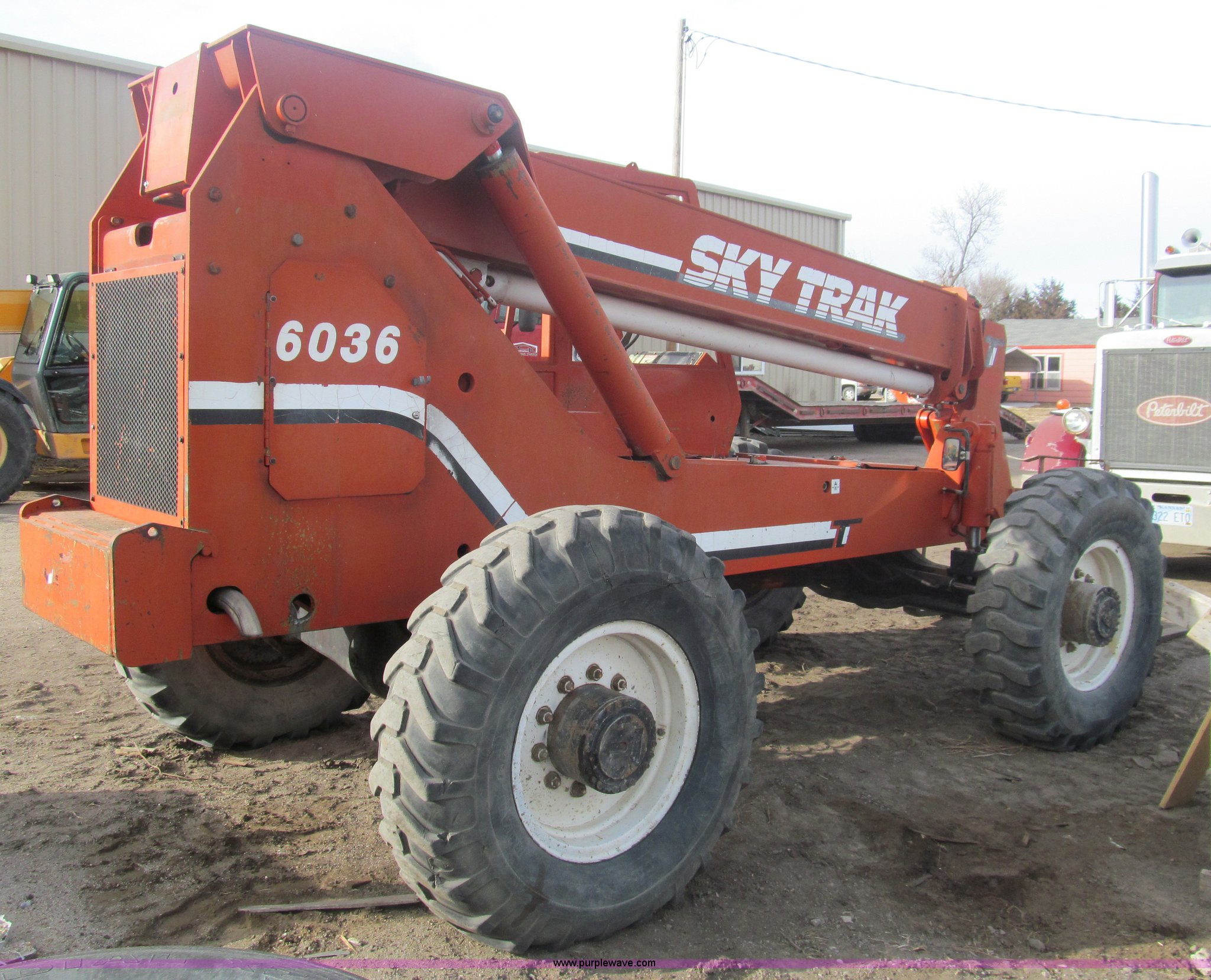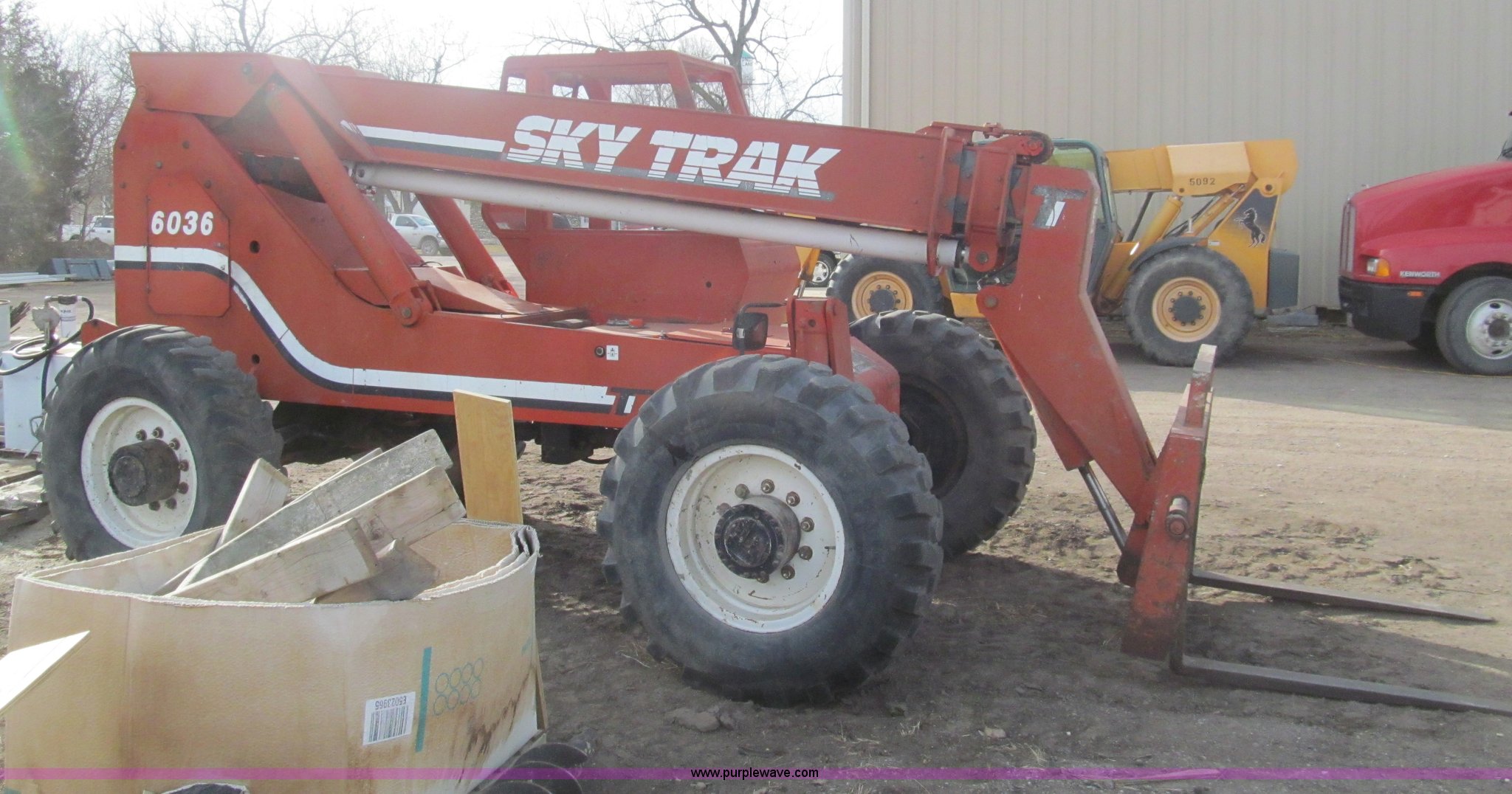 Purple Wave is selling a used Telehandler in Kansas. This item is a 1990 SkyTrac 6036 telehandler with the following: 2,101 hours on meter, Cummins four cylinder diesel engine, Powershift transmission, 3F-3R gears, Four wheel drive, Circle steer, Off-set OROPS, 6,000 lbs lift capacity, 36' max lift height, Pallet fork attachment, 48"L forks, Hydraulic leveling, 13.00-24TG tires, 18,560 lbs. base operating weight, Serial 9C0580