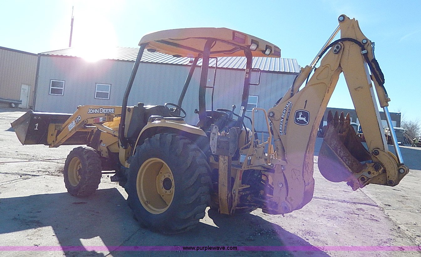 Purple Wave is selling a used Tractor Loader Backhoe in Kansas. This item is a 2006 John Deere 110 backhoe with the following: 1,102 hours on meter, Yanmar four cylinder diesel engine, 41 HP, Three speed hydrostatic transmission, Four wheel drive, OROPS, Spring suspension seat, Two stick backhoe controls, Front and rear work lights, Three point, 540 PTO, John Deere 72" loader bucket, Manual quick coupler, Auxiliary hydraulics, 24" backhoe bucket, Manual quick coupler, 11-16.5 front tires, 17.5-24 rear tires, 7,600 lbs. base operating weight, Serial LV0110T510506
