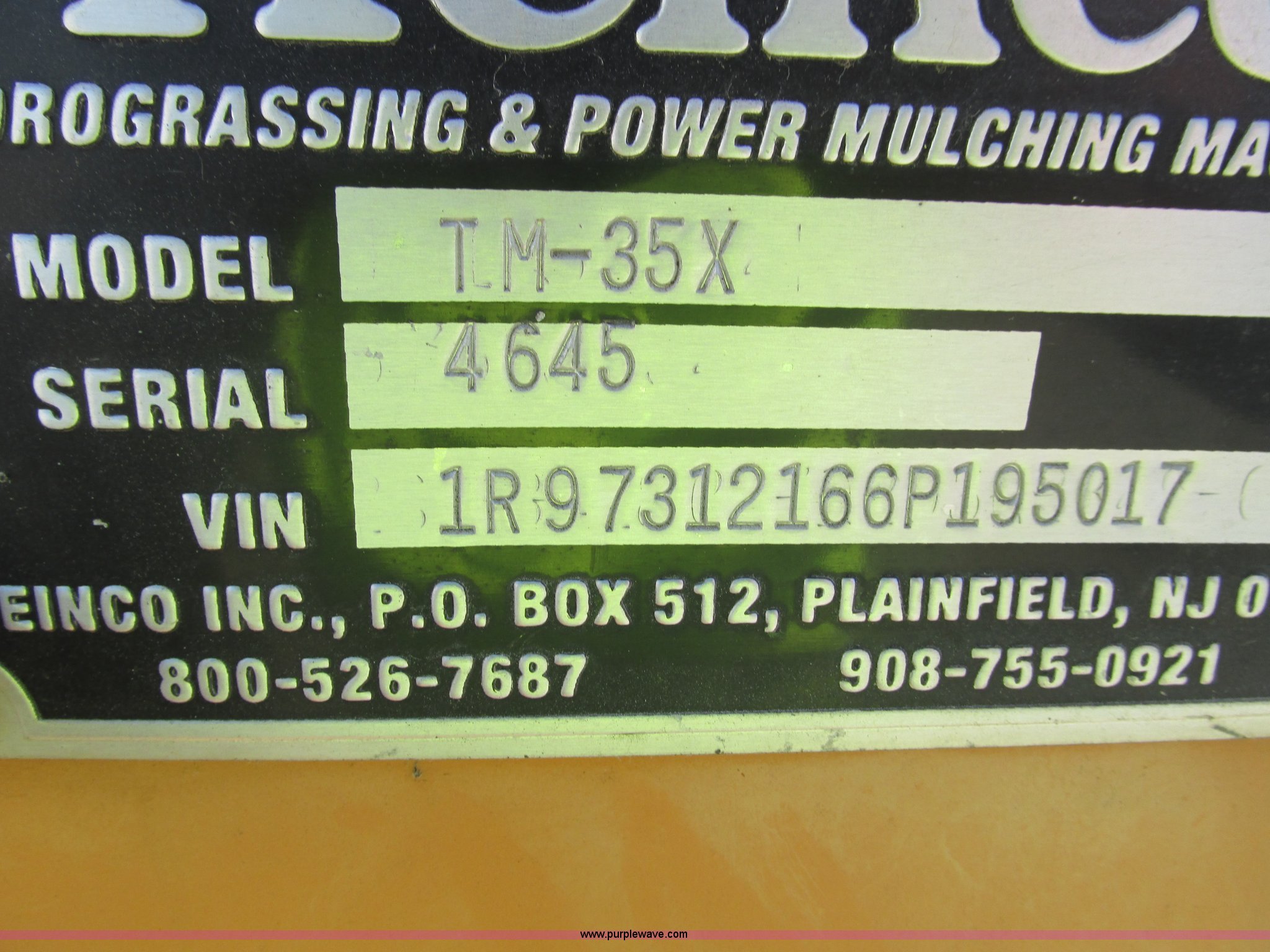 Purple Wave is selling a used Trailer Other in Missouri. This item is a Reinco TM-35X straw blower with the following: 125 hours on meter, Trailer mounted mulcher, Kubota four cylinder diesel engine, 34 HP, 65' discharge distance, Seven tons per hour capacity, Manual feed, Direct drive, 360 degree rotation, 60 degree articulation, Serial 4645, EIN 701279RA