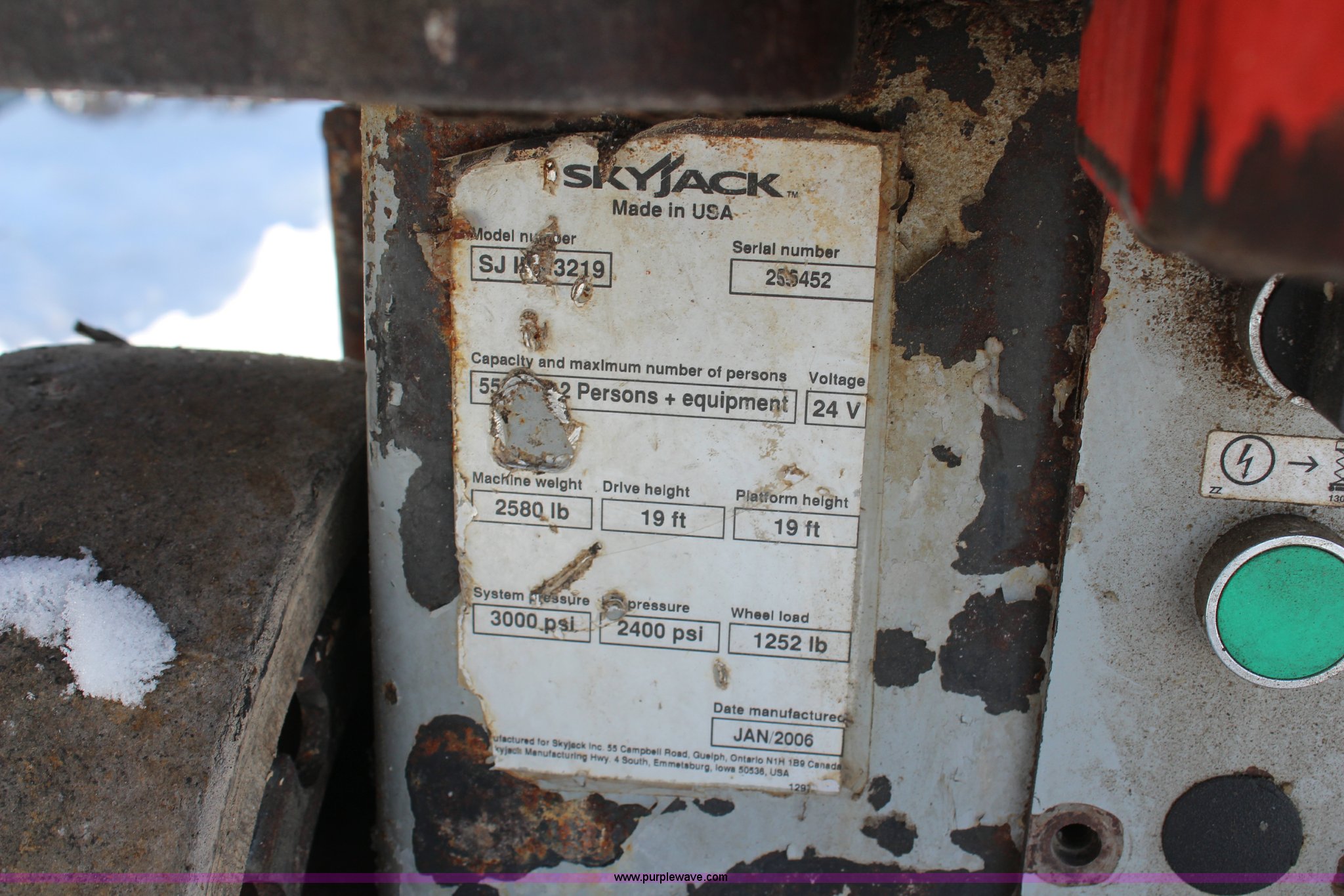 Purple Wave is selling a used Scissor or Vertical Lift in Missouri. This item is a 2006 Skyjack SJ111 3219 electric scissor lift with the following: 459 hours on meter, 19' platform height, 24V, 550 lbs max capacity, 1,580 lbs machine weight, Unit is non-operational, Serial 255452, EIN 616899RA