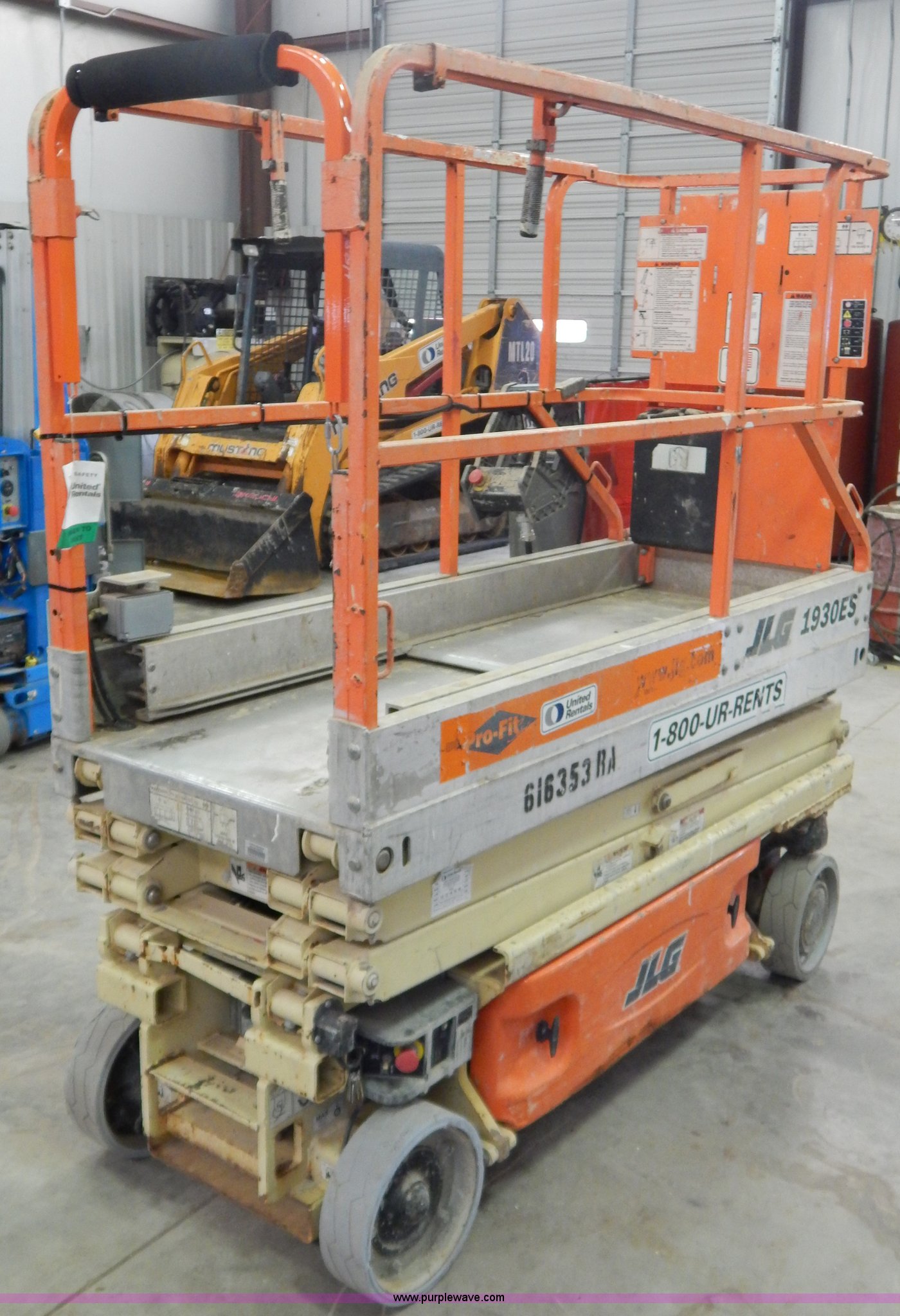 2006 JLG 1930ES electric scissor lift. 343 hours on meter, 19' maximum lift height, 500 lbs maximum lift capacity, 6'L x 30" platform 40" slide-out extension, 42"H side rails, Power to platform, Platform and ground controls, Solid non-marking tires, Recently replaced batteries, Serial 200147713, EIN 616353RA. View item removal requirement and like-kind exchange information. United Rentals - Corbin. 912 W Cumberland Gap Parkway. Corbin, KY 40701