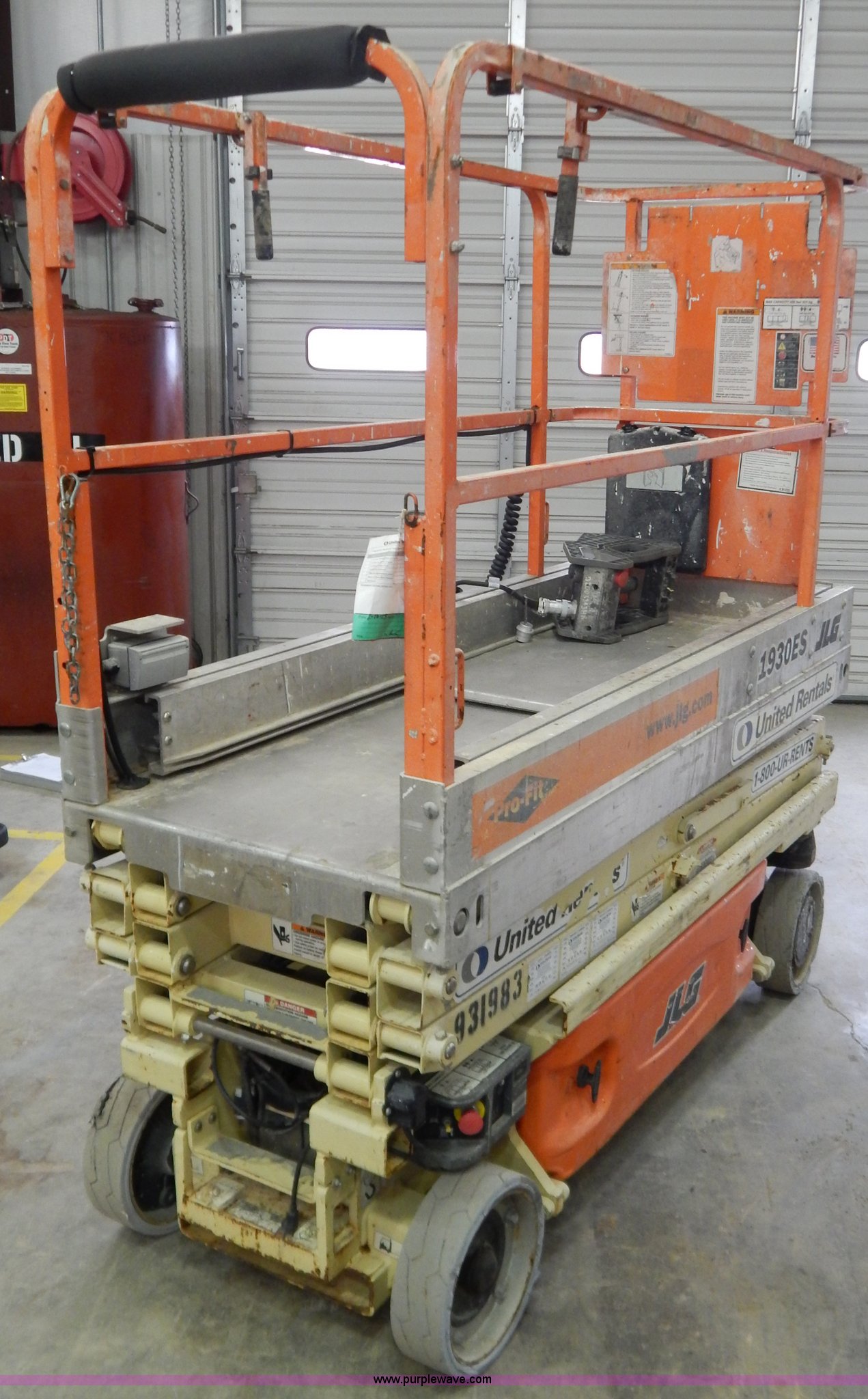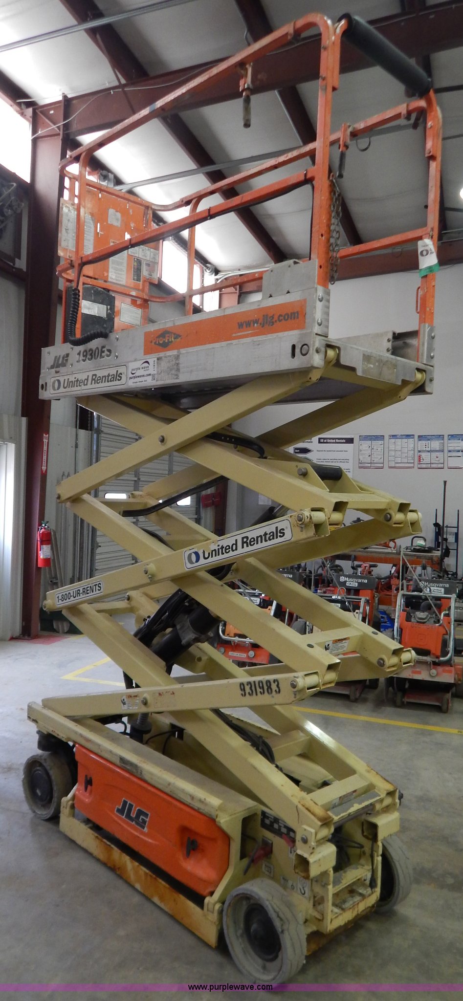 2007 JLG 1930ES electric scissor lift. 197 hours on meter, 19' maximum lift height, 500 lbs maximum lift capacity, 6'L x 30"W platform 40" slide-out extensions, 12"H side rails, Power to platform, On board battery charger, Solid non-marking tires, Recently replaced batteries, Serial 200162928, EIN 931983. View item removal requirement and like-kind exchange information. United Rentals - Corbin. 912 W Cumberland Gap Parkway. Corbin, KY 40701
