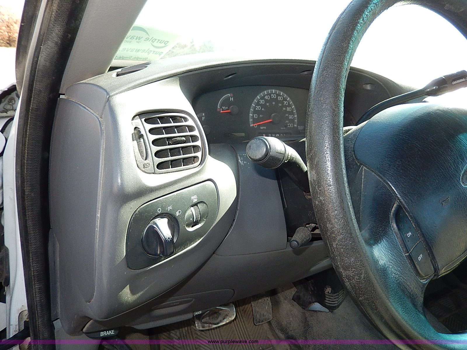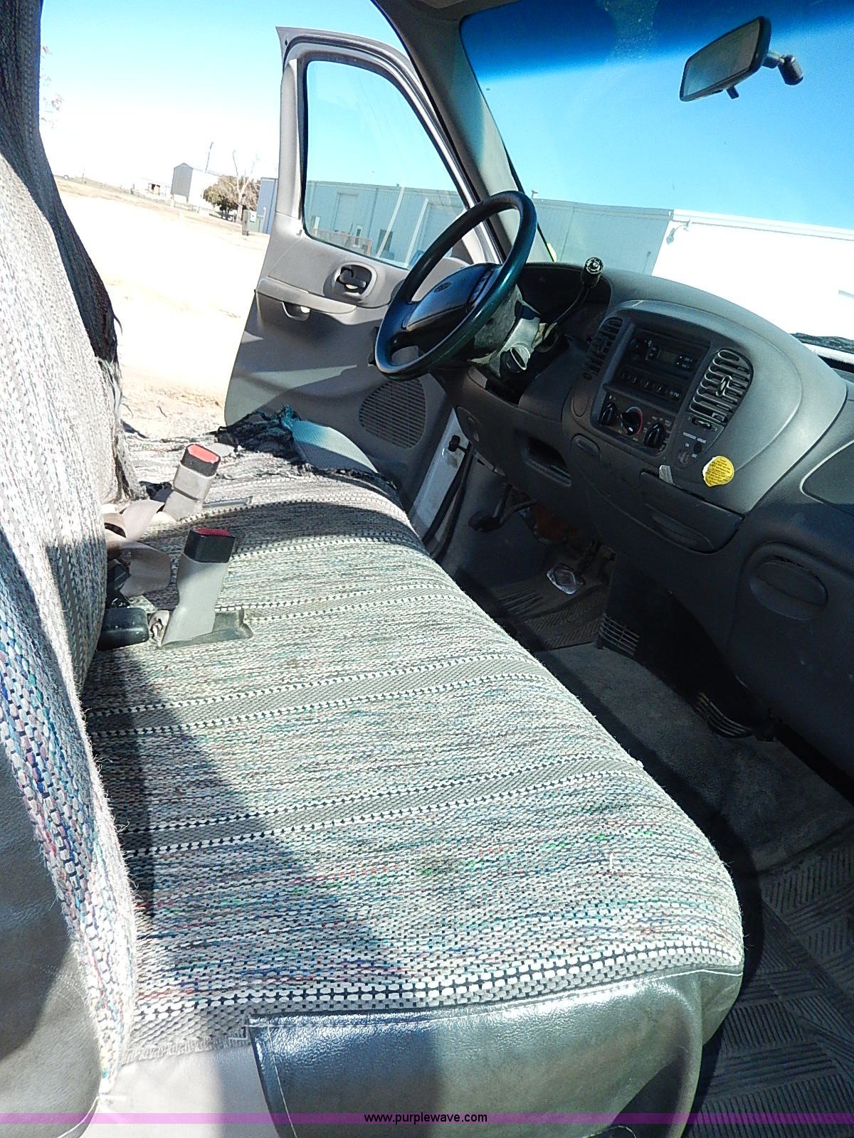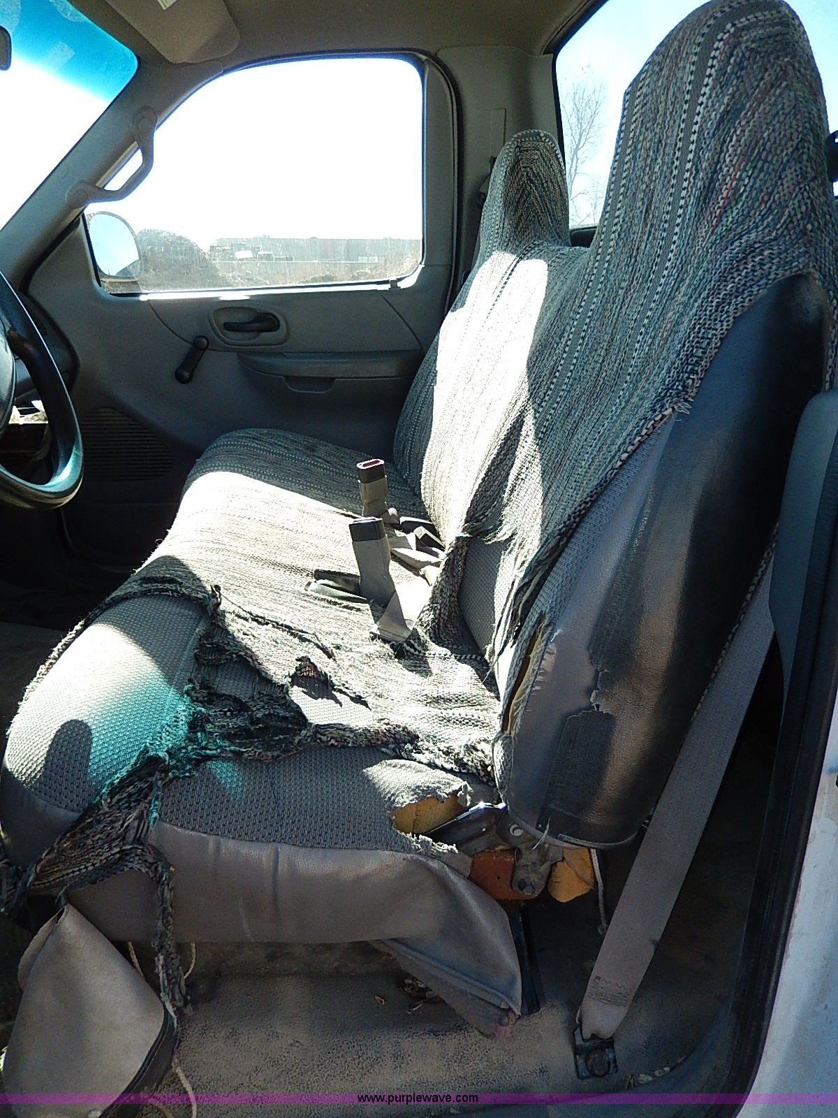 Purple Wave is selling a used Passenger Vehicle in Kansas. This item is a 1999 Ford F150 XL pickup truck with the following: 104,097 miles on odometer, 4.6L V8 SOHC 16V gas engine, Automatic transmission, AC and heat, Tilt, Cruise, AM/FM/cassette, Manual windows and locks, Cloth interior, Long bed, Bed mat, 255/70R16 tires, Engine uses oil, Third gear inoperable, Interior/exterior cosmetic damage, Dents and scratches, Rust, Ball not included, Heater and radiator repaired in 2012
