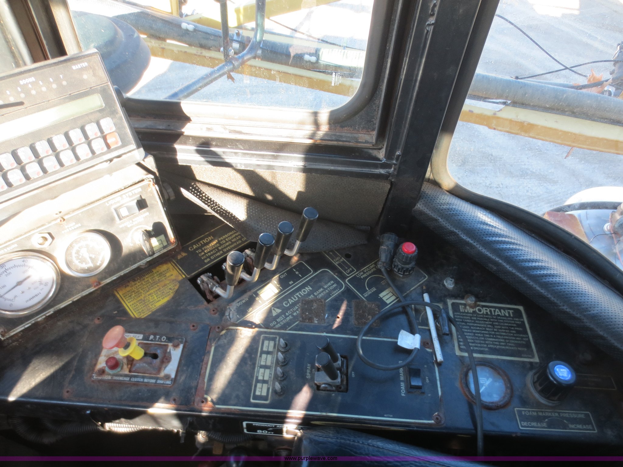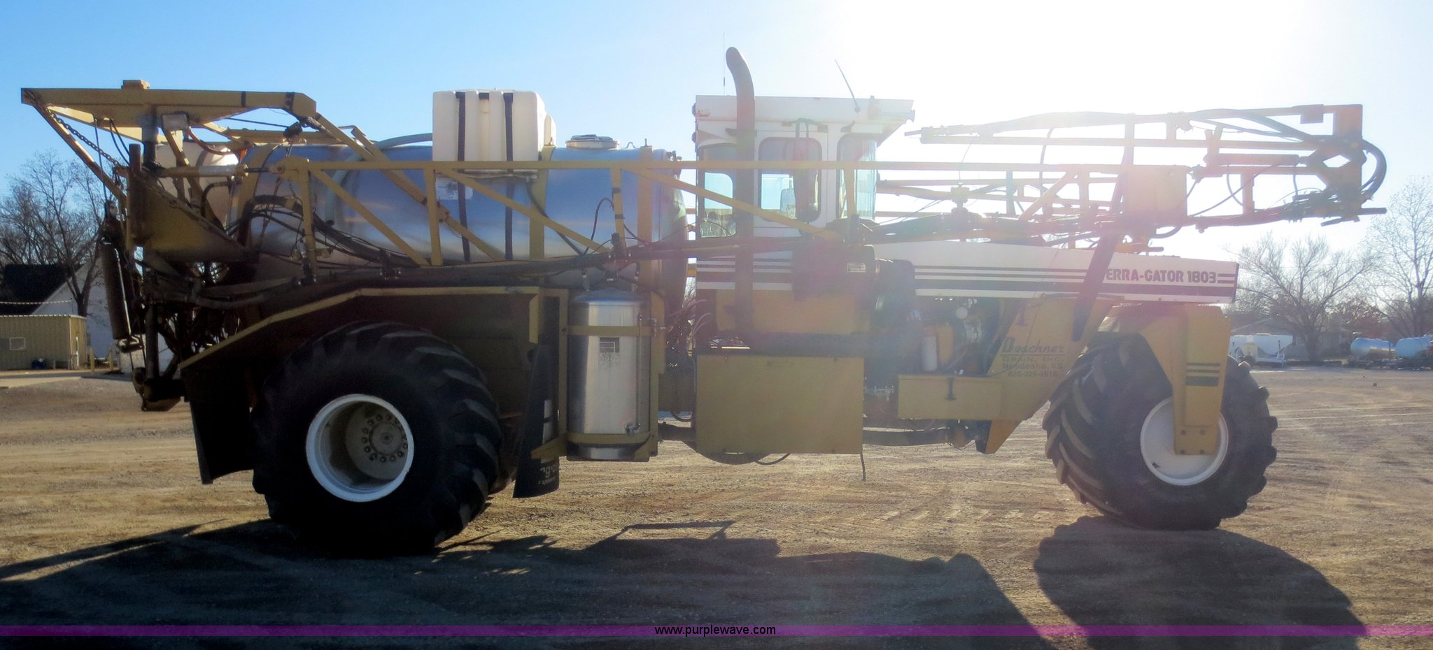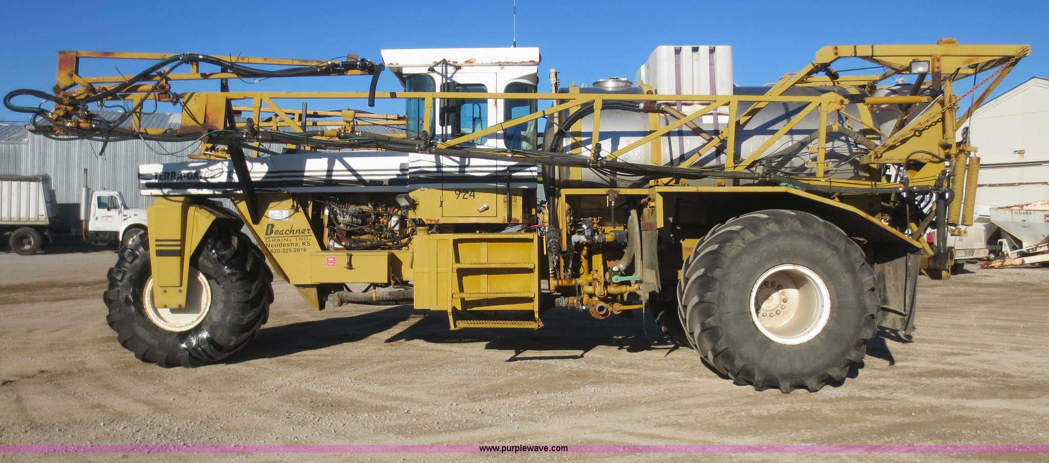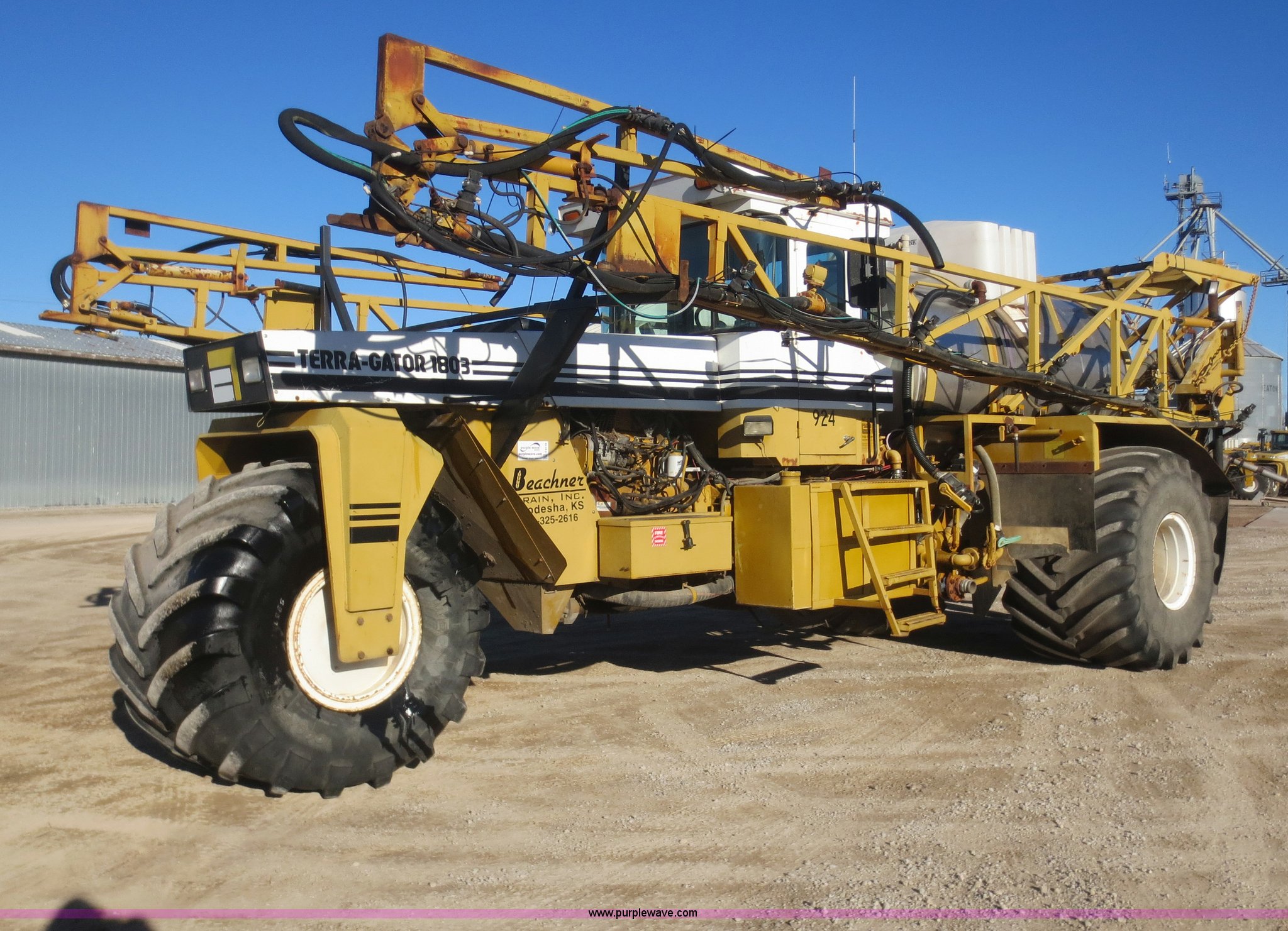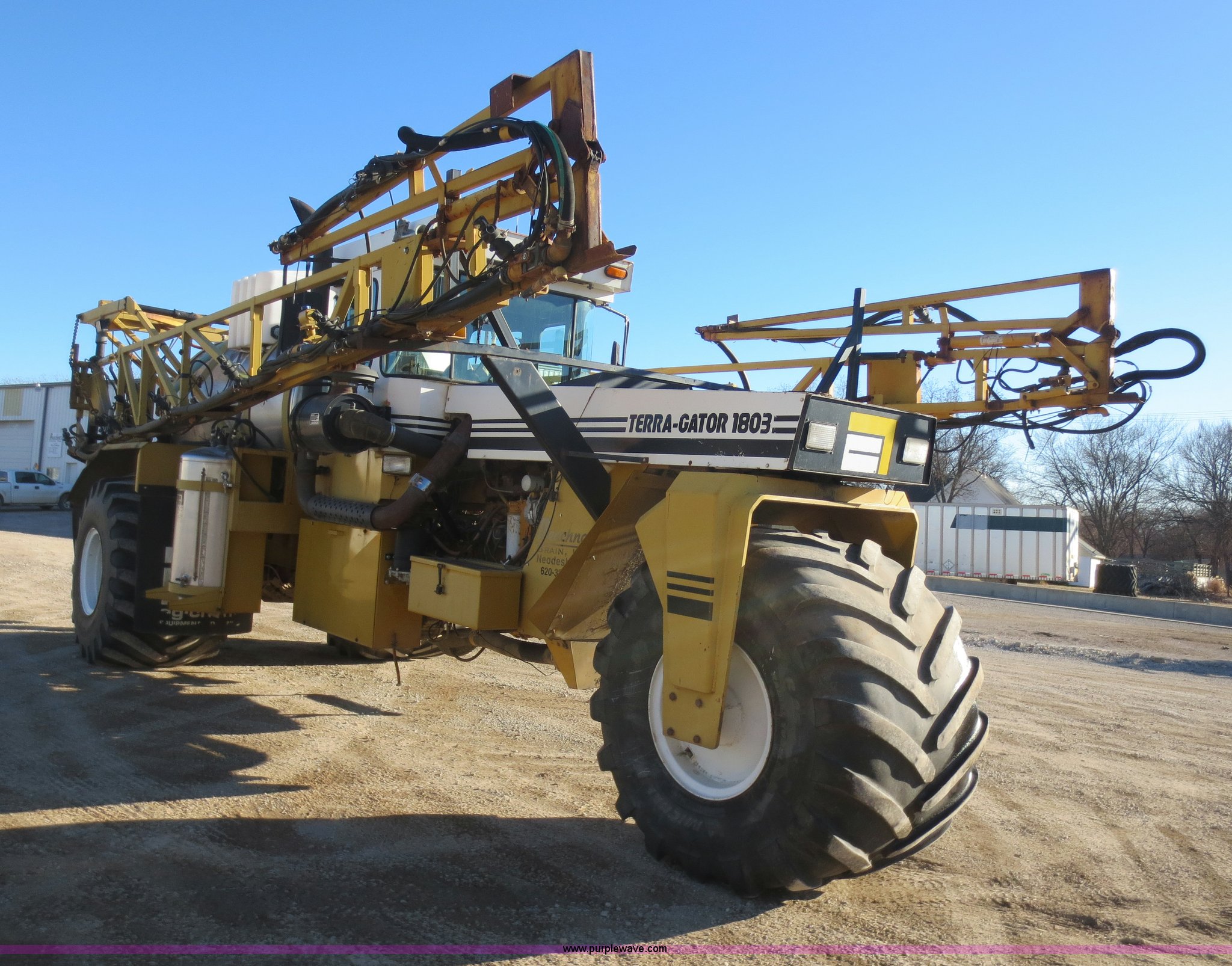 Purple Wave is selling a used Applicator Self Propelled in Kansas. This item is a 1994 Ag-Chem TerraGator 1803 self-propelled sprayer with the following: 48,351 miles on odometer, 5,499 hours on meter, Cummins 8.3L six cylinder diesel engine, Engine overhauled at 5,099 hours, Manual transmission, 18 gears, 1,800 gallon spray tank capacity, 200 gallon rinse tank, Induction tank, Raven spray control system, Hydraulic height adjustment, Hydraulic folding boom, 80' boom width, Four boom sections, 30" nozzle spacing, Approximately 100 hours on air compressor, Air suspension seat, AC and heat, AM/FM, Work lights, Radar ground speed sensor, Manuals, 66 x 43.00-25 tires, Batteries replaced 12/30/13, Raven GPS is not included, Serial 1831924, Unit# 924