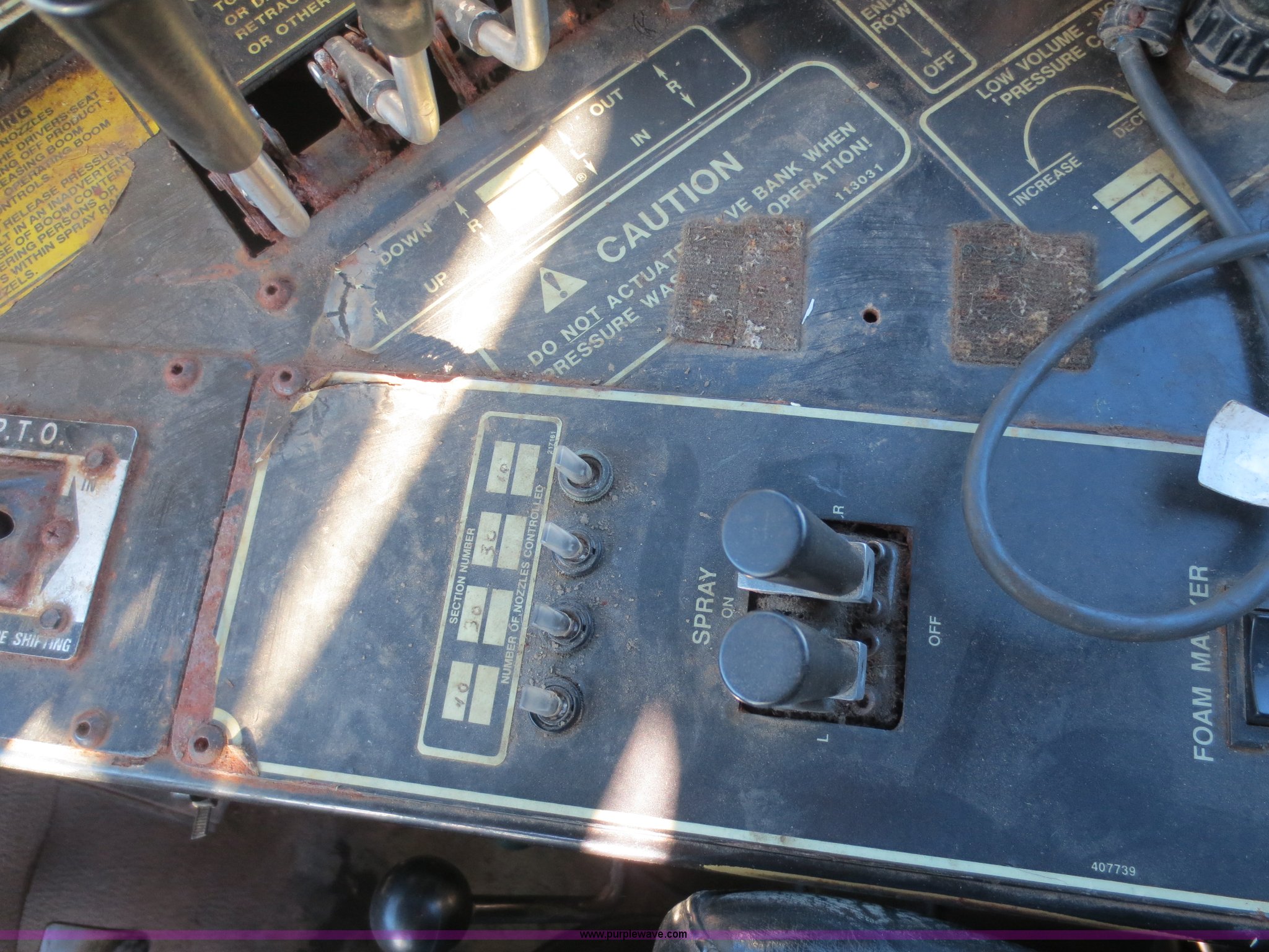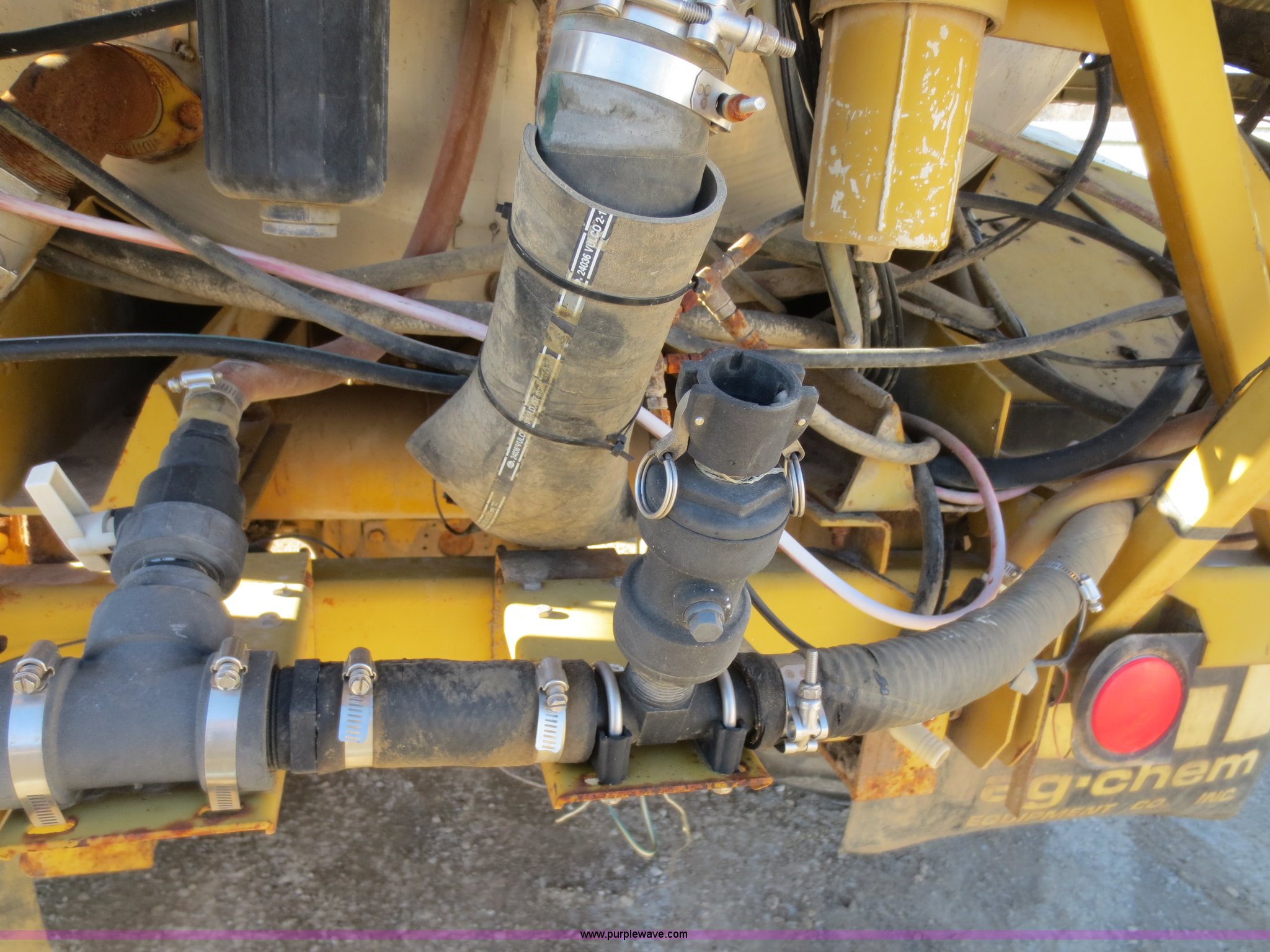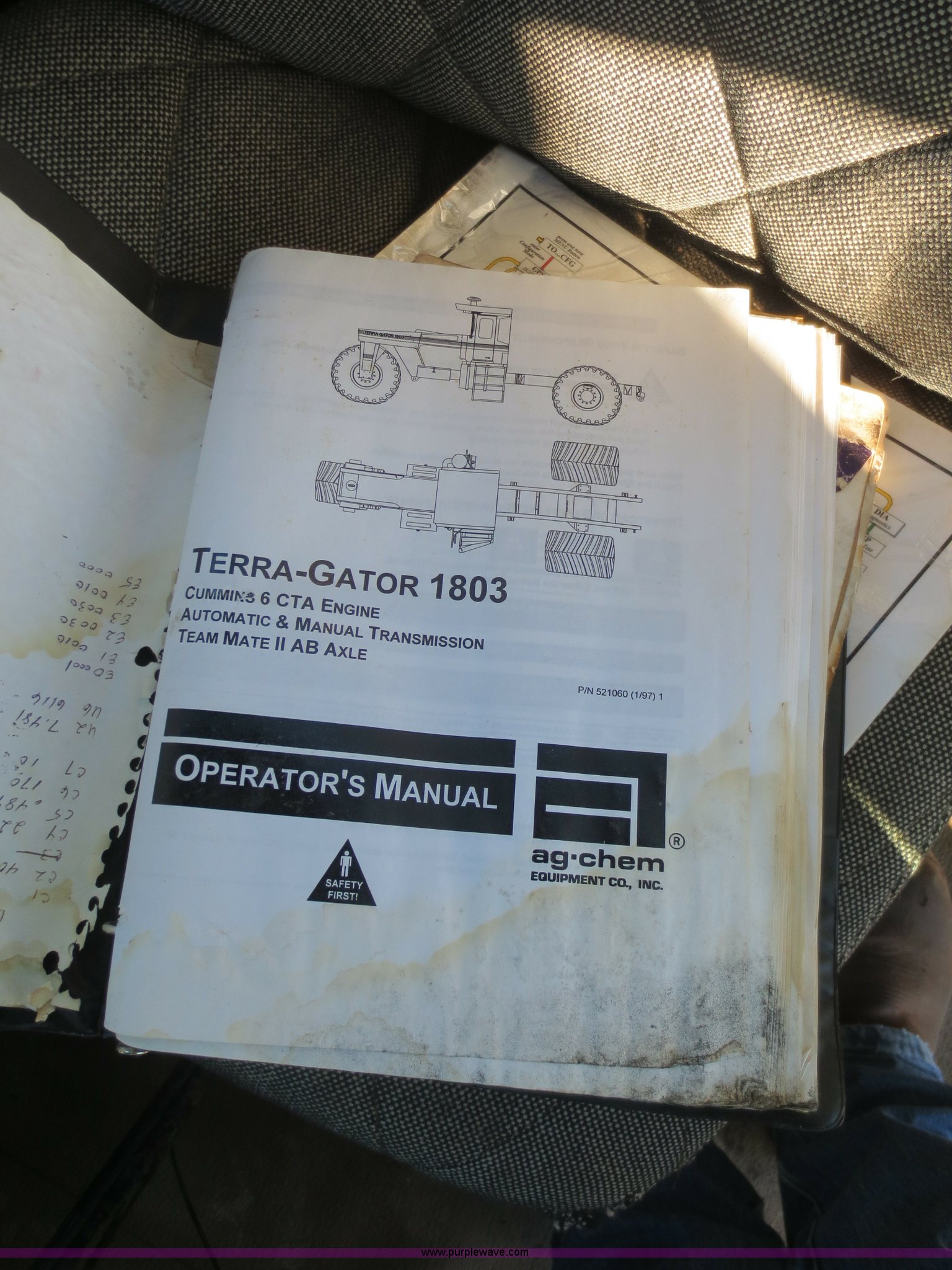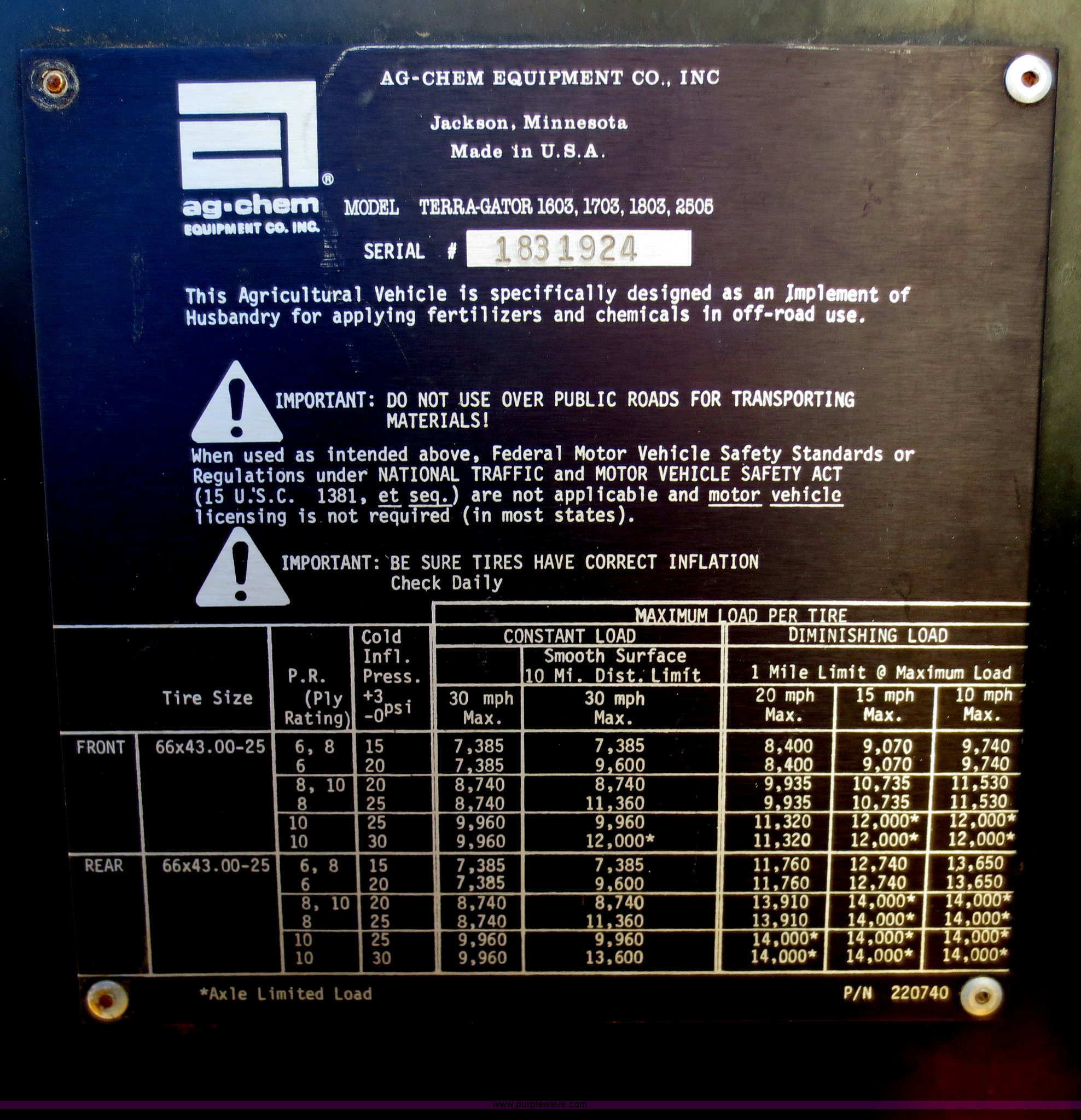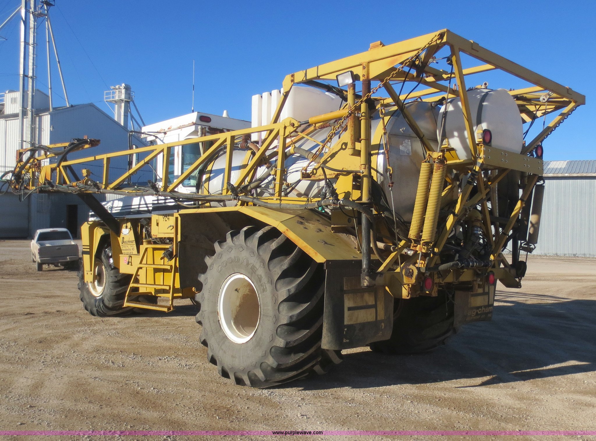 Purple Wave is selling a used Applicator Self Propelled in Kansas. This item is a 1994 Ag-Chem TerraGator 1803 self-propelled sprayer with the following: 48,351 miles on odometer, 5,499 hours on meter, Cummins 8.3L six cylinder diesel engine, Engine overhauled at 5,099 hours, Manual transmission, 18 gears, 1,800 gallon spray tank capacity, 200 gallon rinse tank, Induction tank, Raven spray control system, Hydraulic height adjustment, Hydraulic folding boom, 80' boom width, Four boom sections, 30" nozzle spacing, Approximately 100 hours on air compressor, Air suspension seat, AC and heat, AM/FM, Work lights, Radar ground speed sensor, Manuals, 66 x 43.00-25 tires, Batteries replaced 12/30/13, Raven GPS is not included, Serial 1831924, Unit# 924
