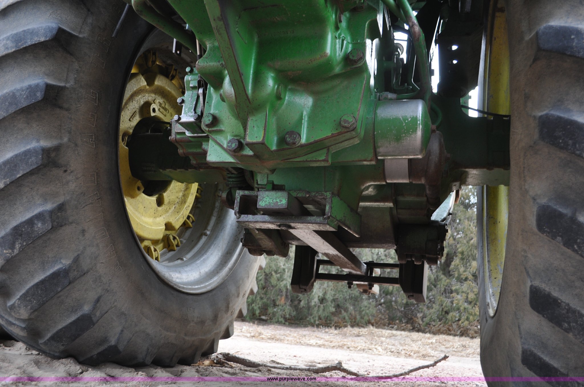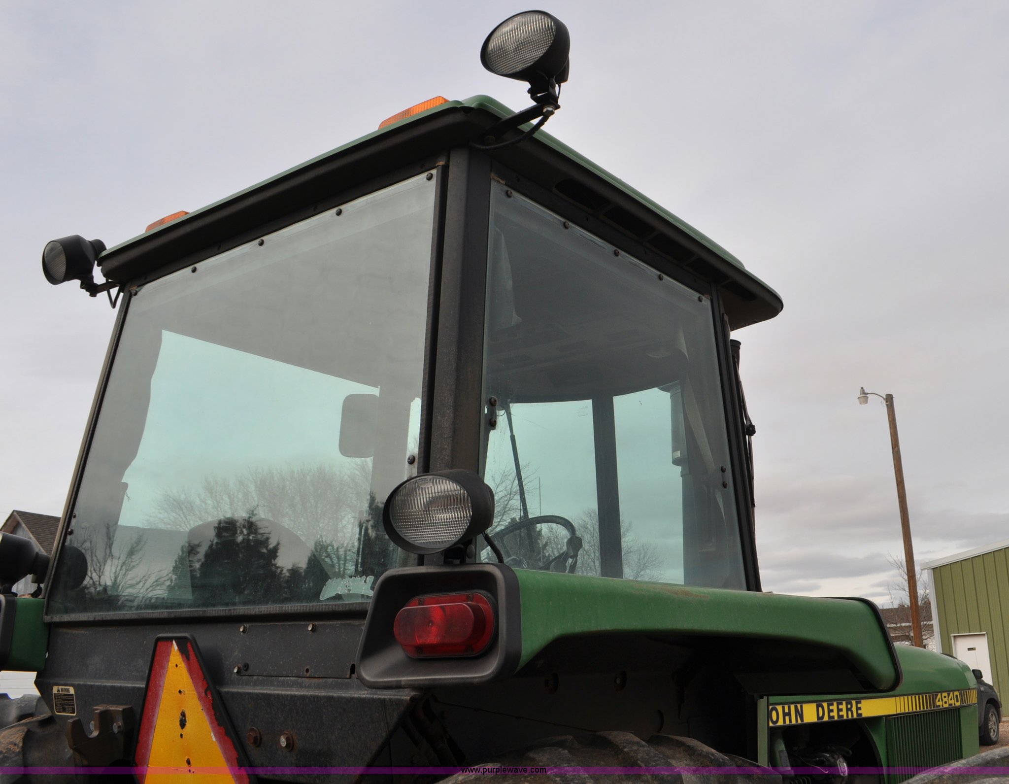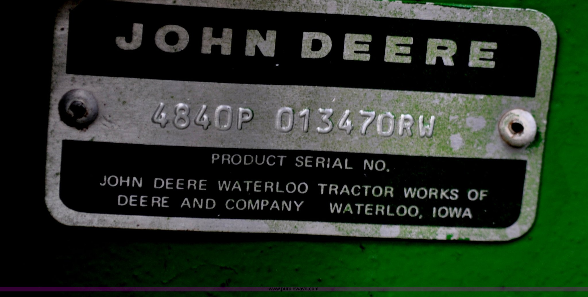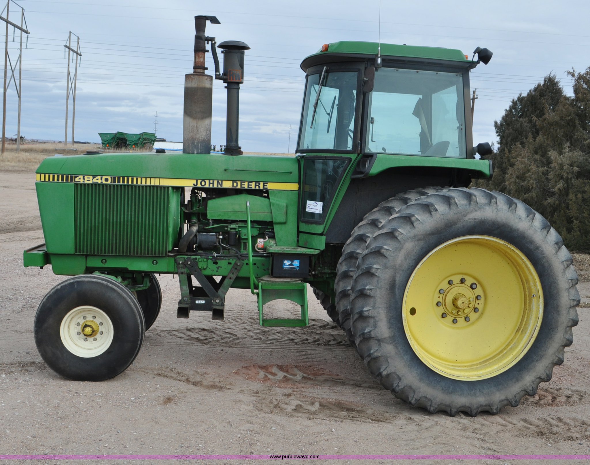 Purple Wave is selling a used Tractor in Nebraska. This item is a 1982 John Deere 4840 tractor with the following: 5,827 hours on replaced hour meter, John Deere six cylinder diesel engine, 180 HP, Powershift transmission, 8F-4R gears, Differential lock, AC and heat, AM/FM/CD, Spring suspension seat, Tilt steering wheel, Three point, Three point quick attach, Draw bar, 1000 PTO, (3) rear hydraulic remotes, 103 gallon fuel tank, 11.00-16 front tires, 18.4-38 dual rear tires, Noise in rear end, possible spider gear issue, Serial 4840P013470RW