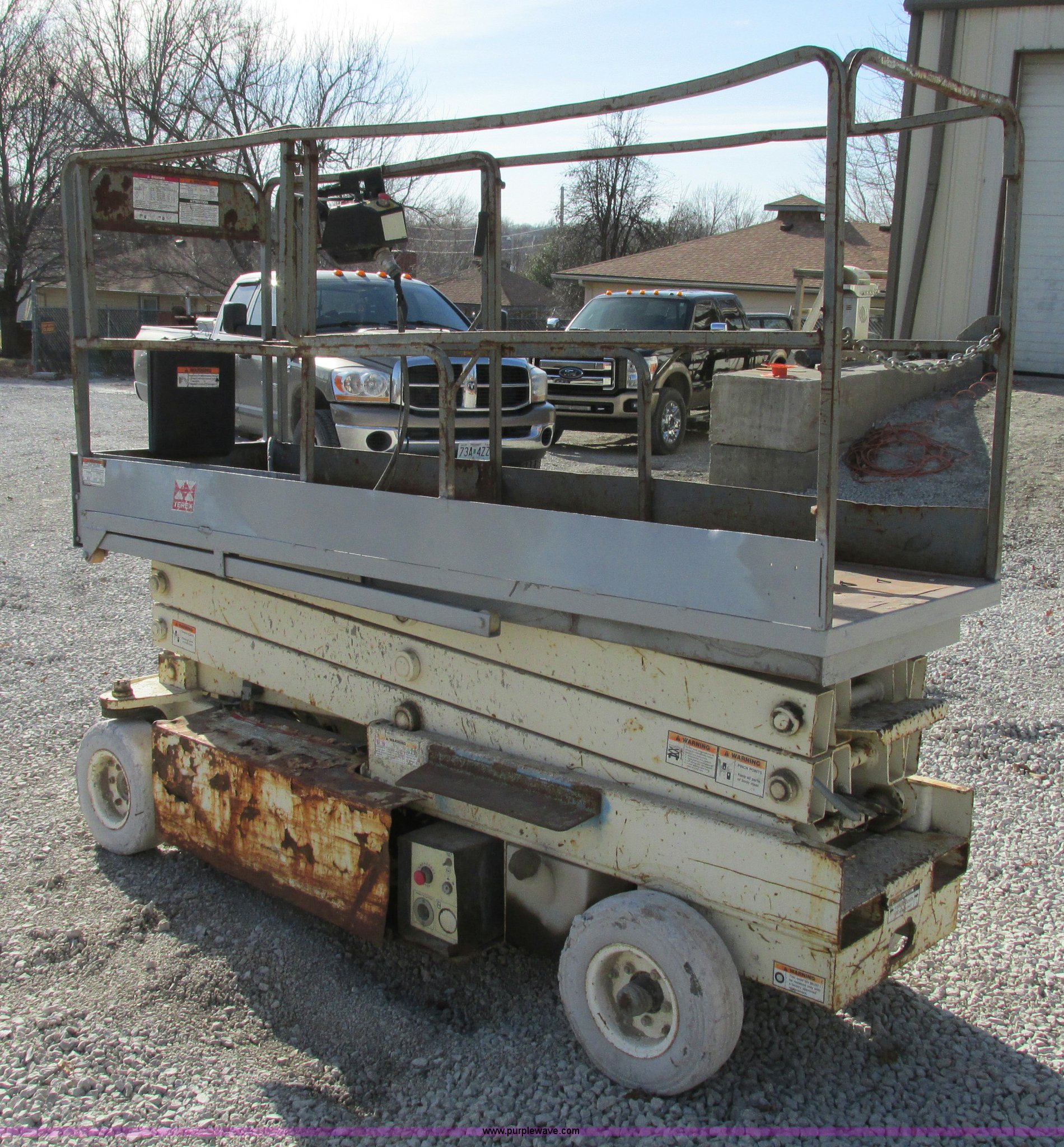 Purple Wave is selling a used Scissor or Vertical Lift in Missouri. This item is a Terex TS20 scissor lift with the following: 800 lbs lift capacity, 20' lift height, 32"W, 96"L, 36" platform slide-out, Fork pockets, 24V system, On-board charger, Non-marking tires, Batteries are dead, Unknown operating condition