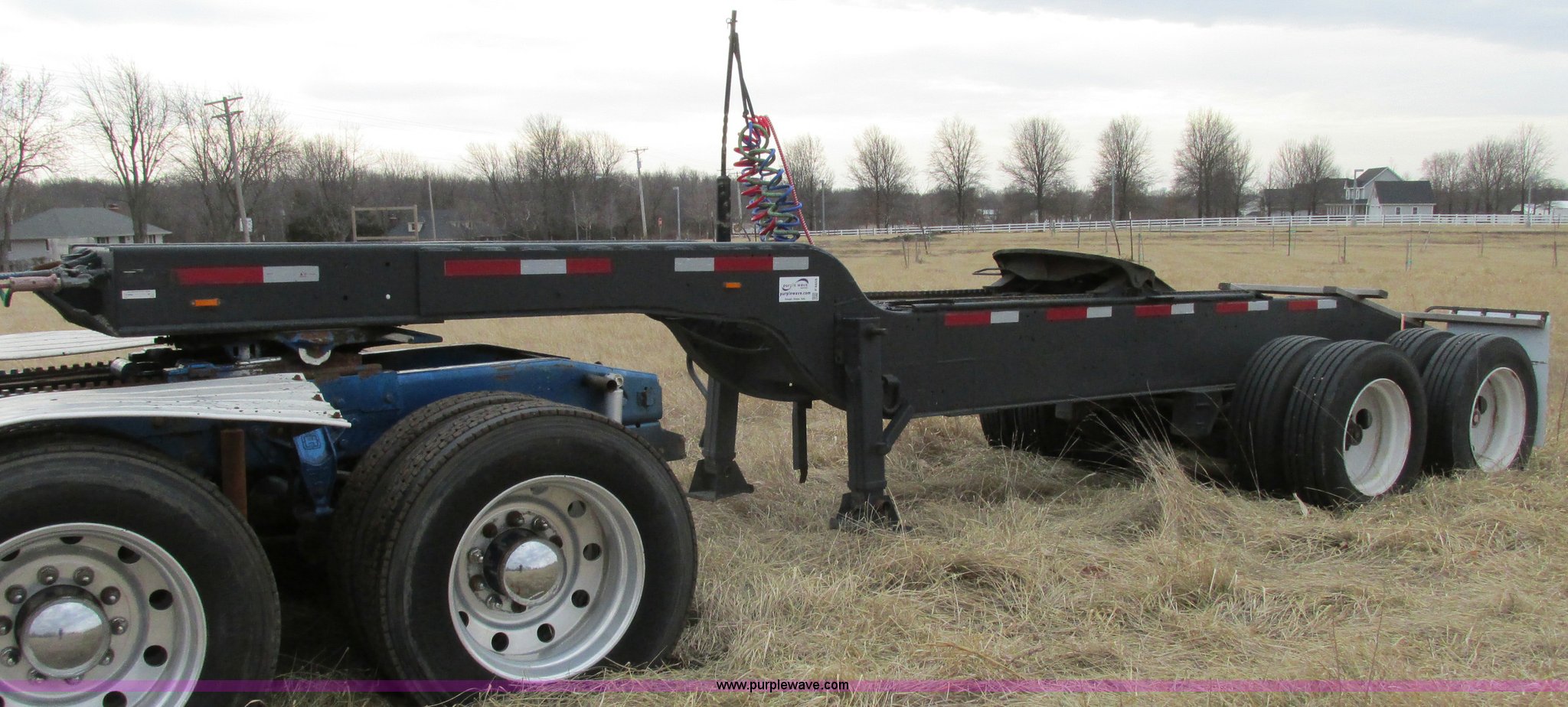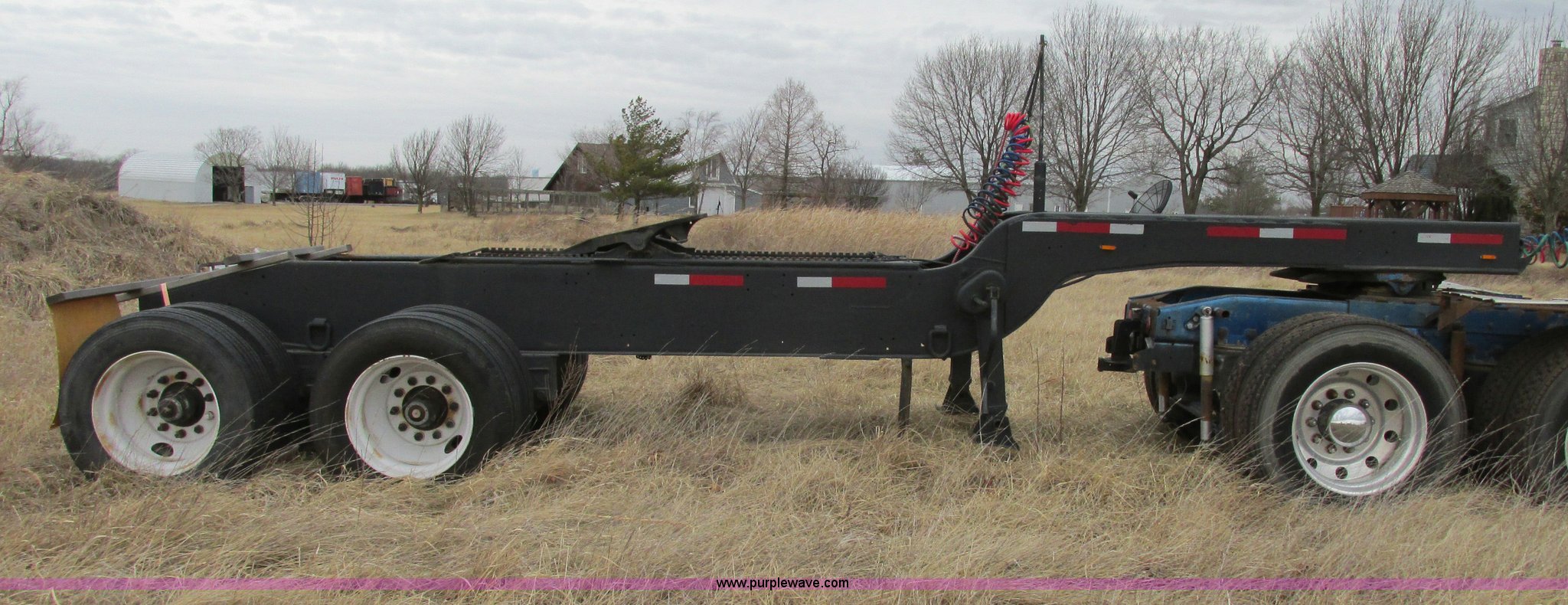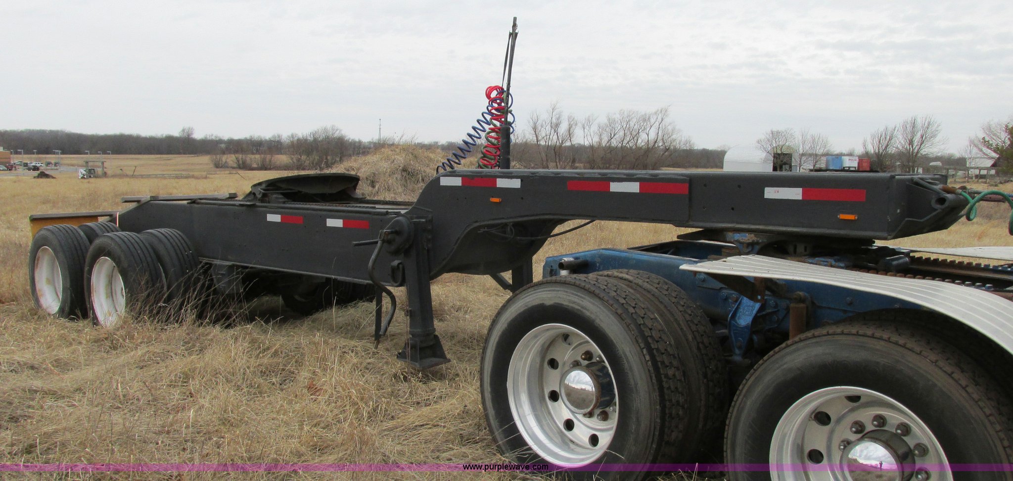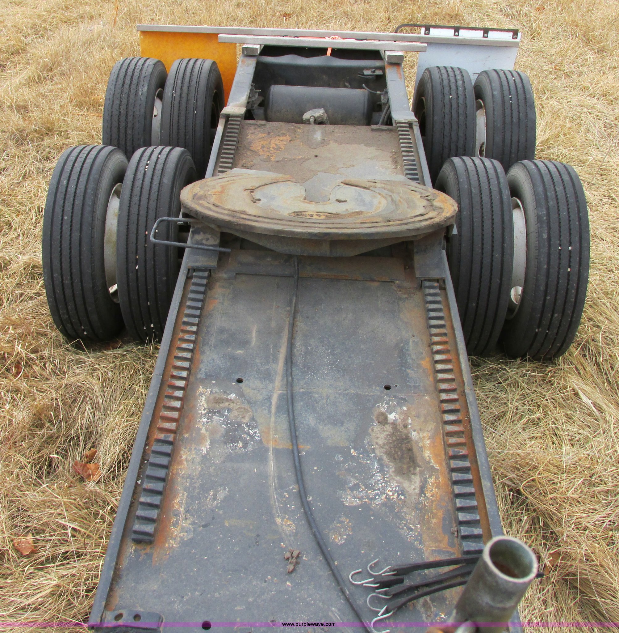 Purple Wave is selling a used Trailer Other in Missouri. This item is a 1980 shop built heavy haul jeep trailer with the following: 24' overall length, 102"L neck, Sliding fifth wheel plate, 84" adjustment, Tail lights, Removable mud flaps, D-ring tie downs, Air suspension, Air brakes, Steel wheels, 275/70R22.5 tires, GVWR 56,500 lbs, GAWR 18,000 lbs