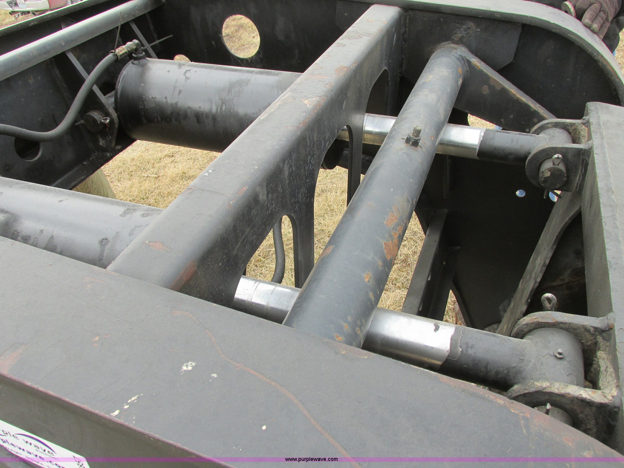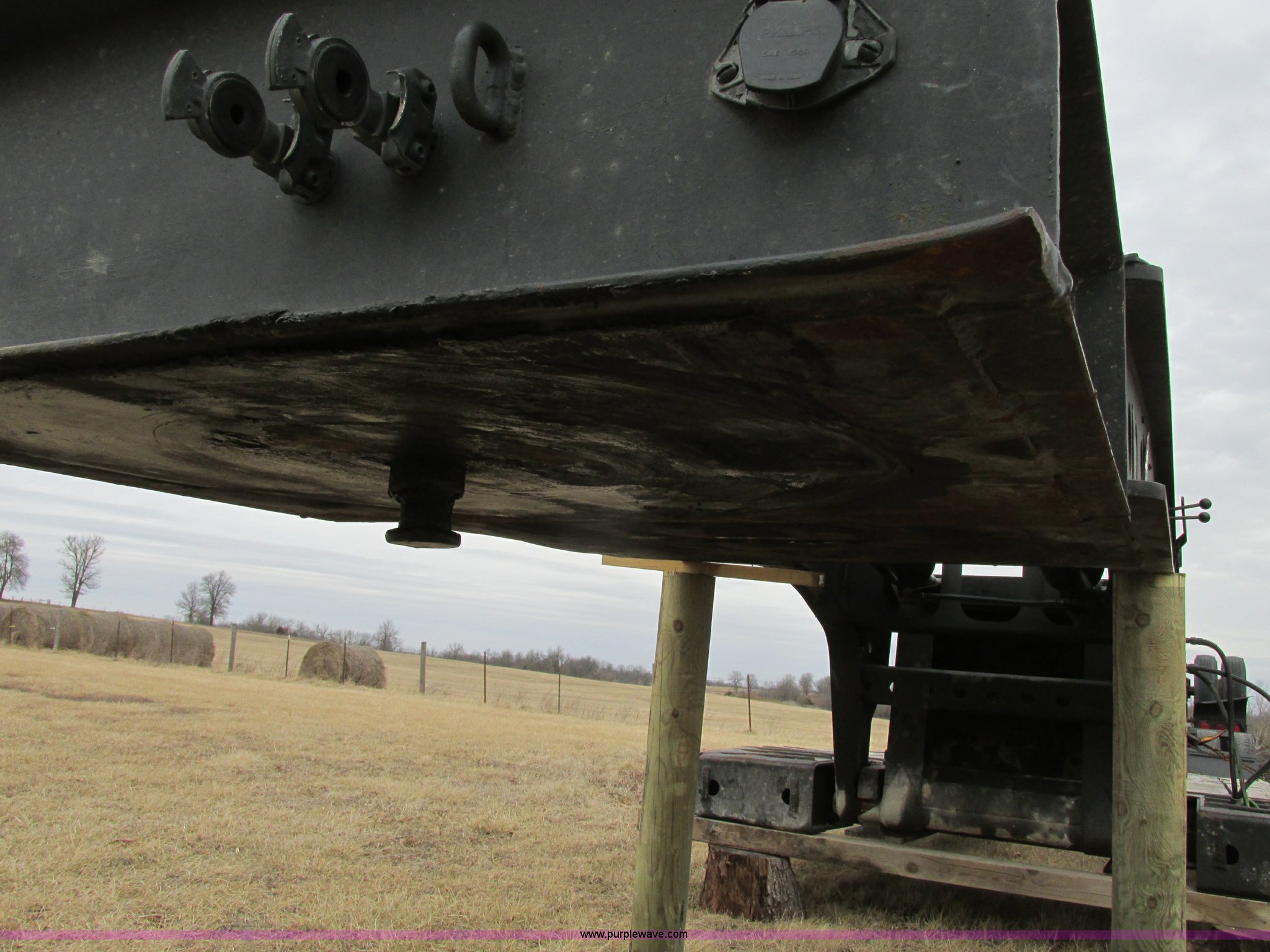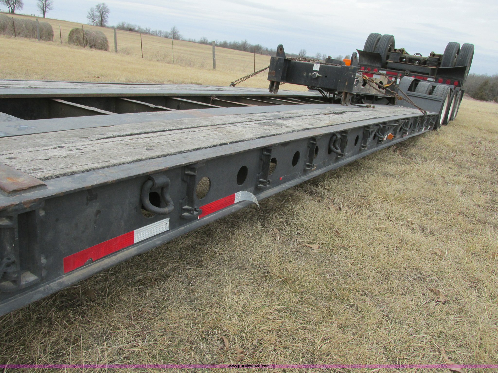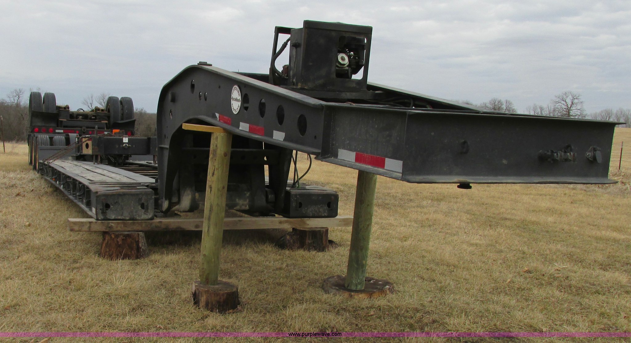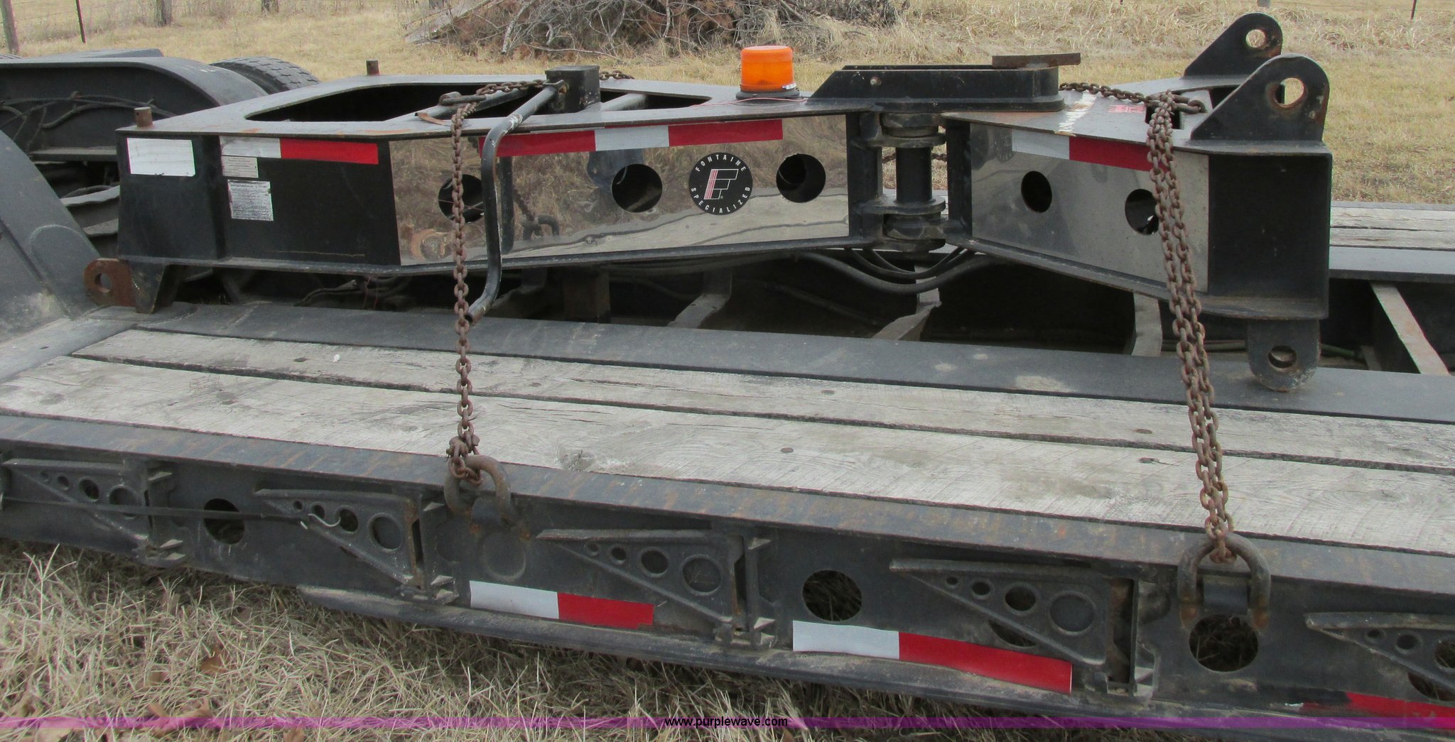 Purple Wave is selling a used Equip. Trailer in Missouri. This item is a 2001 Fontaine TL50NEB triple axle trailer with stinger with the following: 15'L neck, 25'L deck, 14' over rear wheel, 55'L without stinger, 69'L with stinger, 102"W, Oak wood plank, 12" outriggers, 2007 stinger, Serial Z30057, Articulating, 420cc gas powered hydraulic pump, 12V electric start, Replaced April 2012, estimated 25 hrs use, Three position king pin adjustment, Air suspension, Air brakes, 255/70R22.5 tires, 245/75R22.5 stinger tires, Three hydraulic cylinders rebuilt and hydraulic pump replaced 12/2/13, Repair records available from 2001 to present