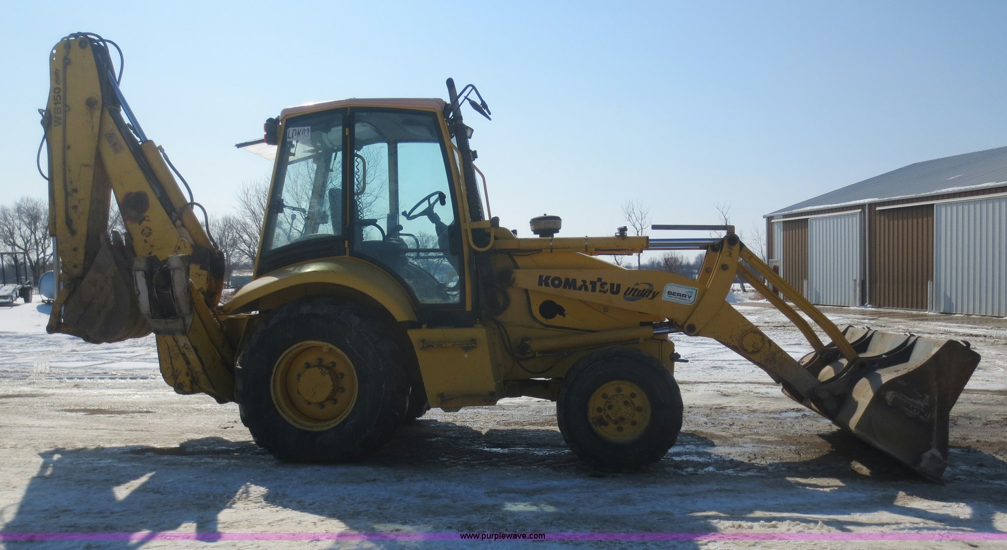 Purple Wave is selling a used Tractor Loader Backhoe in Kansas. This item is a 2003 Komatsu 150 utility backhoe with the following: 6,870 hours on meter, Yanmar S4D106-1FA 4.412L four cylinder turbo diesel engine, 99 HP, Shuttle shift transmission, 4F-4R gears, Four wheel drive, Differential lock, Enclosed cab, AC and heat, Windshield wipers, Two stick control, Front and rear work lights, 90"W loader bucket, Bolt-on cutting edge, Extendable stick, 24"W backhoe bucket, 14-17.5 NHS front tires, 19.5L-24 rear tires, Cracked front glass, Cracked rear plexiglass, Serial 150F10295, Unit# LDK03