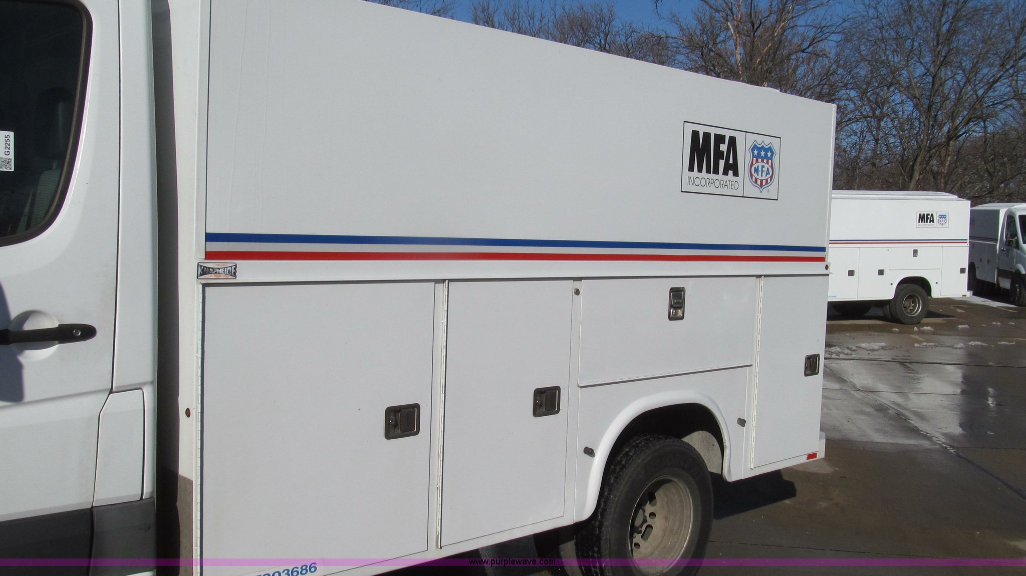 2007 Freightliner Sprinter 3500 service truck. 323,275 miles on odometer, Mercedes 3.0L V6 diesel engine 154 HP, Automatic transmission, AC and heat, Tilt, AM/FM/CD, Power windows, Cloth/vinyl interior, Extending side mirrors, Knapheide KC132MD38J service bed KUV enclosed, Interior lighting, Side boxes, Walk-in enclosed storage, Interior shelving, Rubber floor mat, Electronic master key fob, Dual rear doors, Rear step bumper, Serial 20090119-0139658, Dash mounted back up camera, Backup alarm, 215/85R16 tires, GVWR 11,030 lbs, Service records available, Driver's seat torn, Unit# 2. WDPPF345579341493. MFA Inc.. 201 Ray Young Drive. Columbia, MO 65201