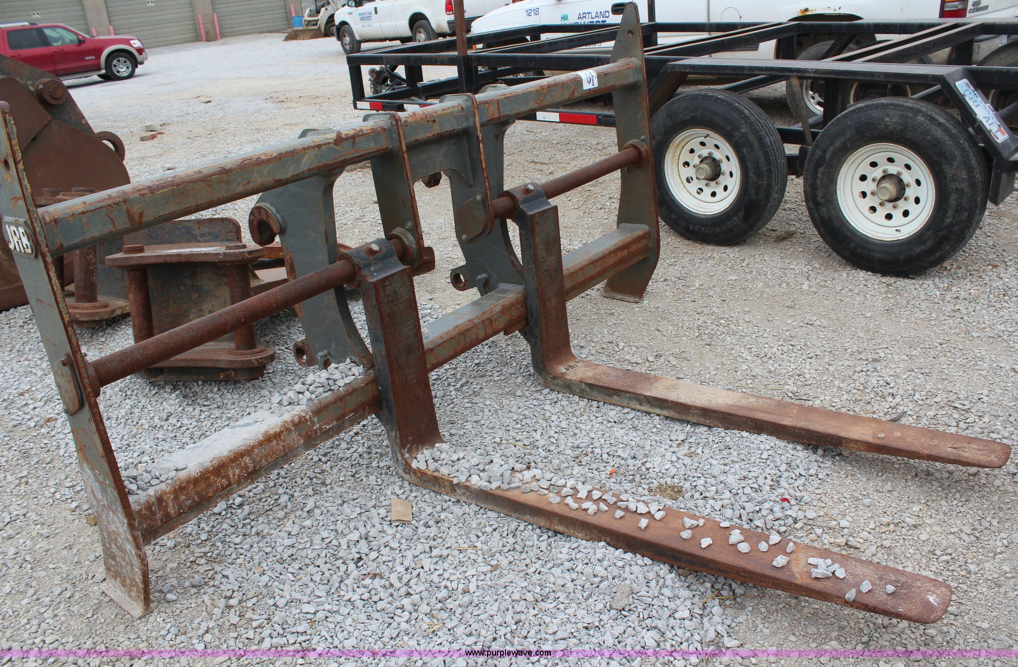 JRB WA320 forks attachment. 60"L x 6"W, 8'W carriage, Serial D206-180655-171. Heartland Midwest. 15795 S Mahaffie. Olathe, KS 66062