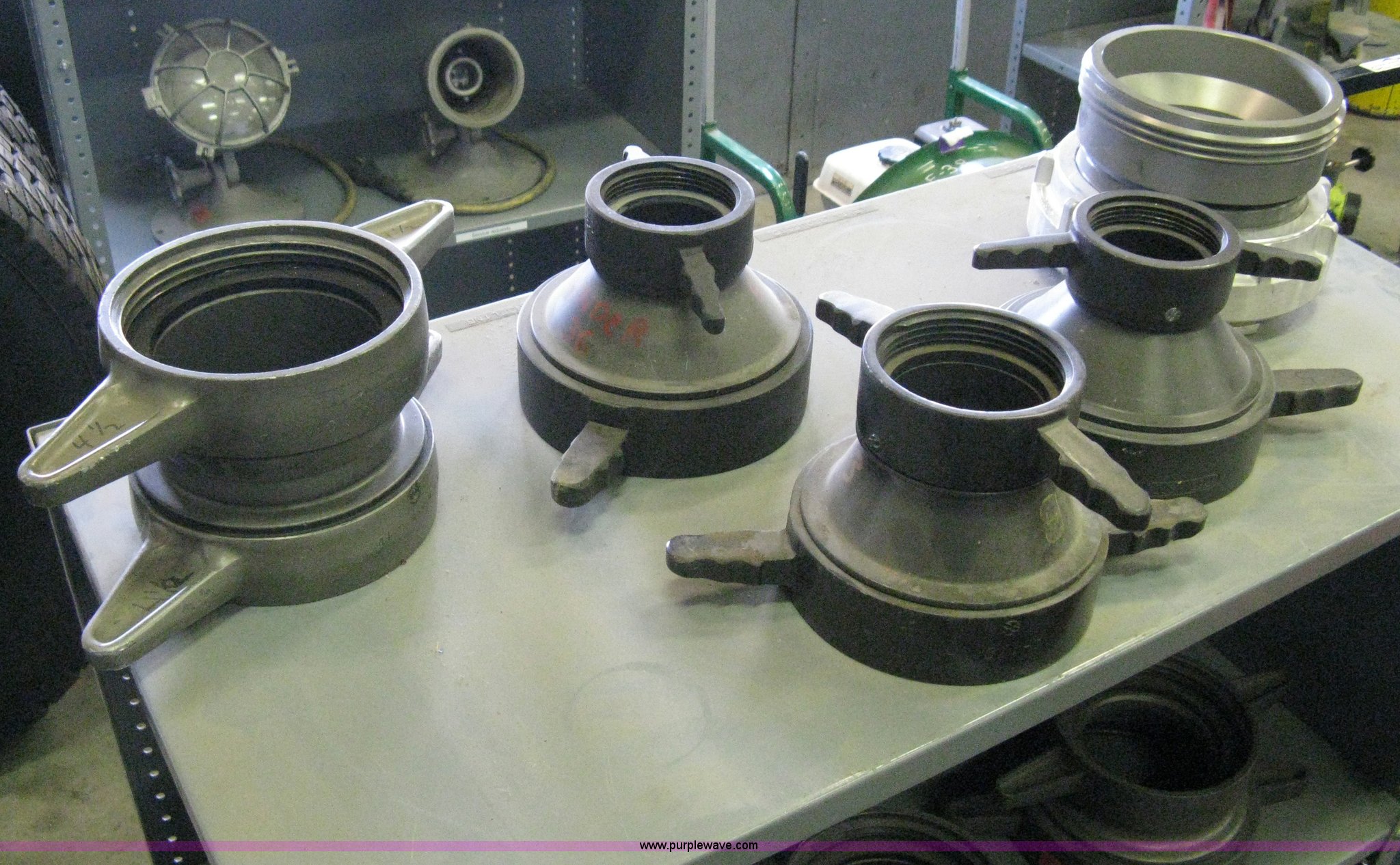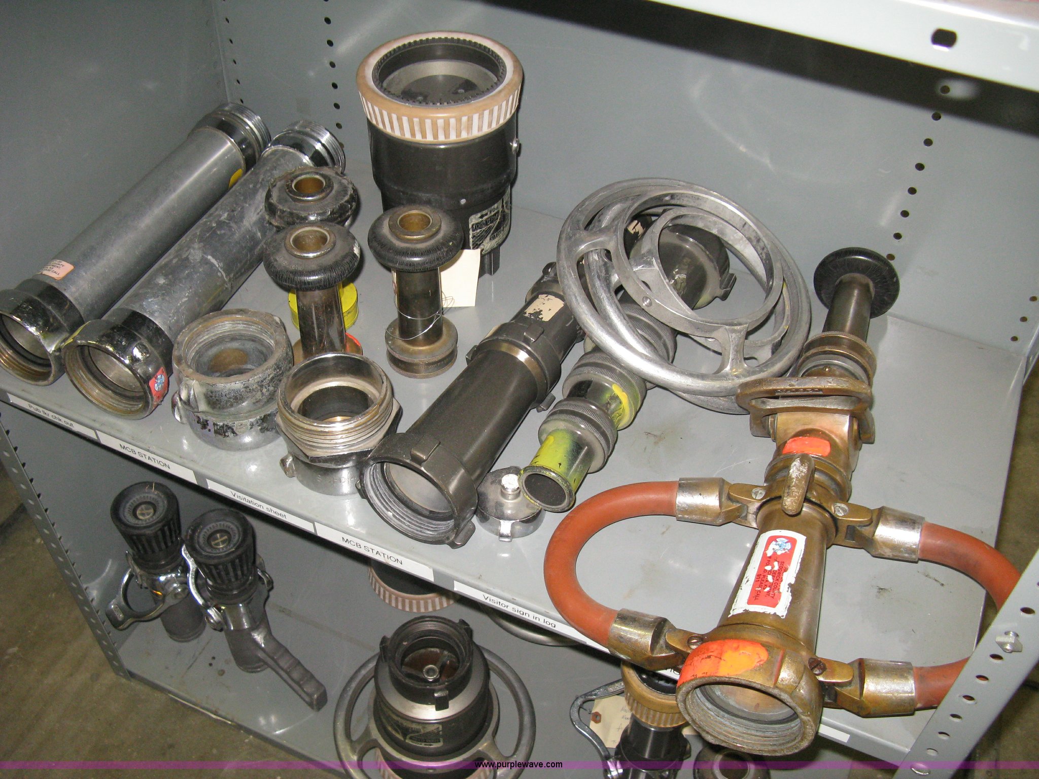 Purple Wave is selling a used Tools in Kansas. This item is a Assorted fire house/apparatus appliances with the following: (8) suction hose strainers, Assorted nozzles/tips/couplers, 2.5" and 1.5", (5) hose clamps, (2) hose drainers, (3) Y couplers, Triple Y couplers, Deck/ground base unit, (14) assorted size hose adapters, (5) pot lamps, 120V, Shelf not included