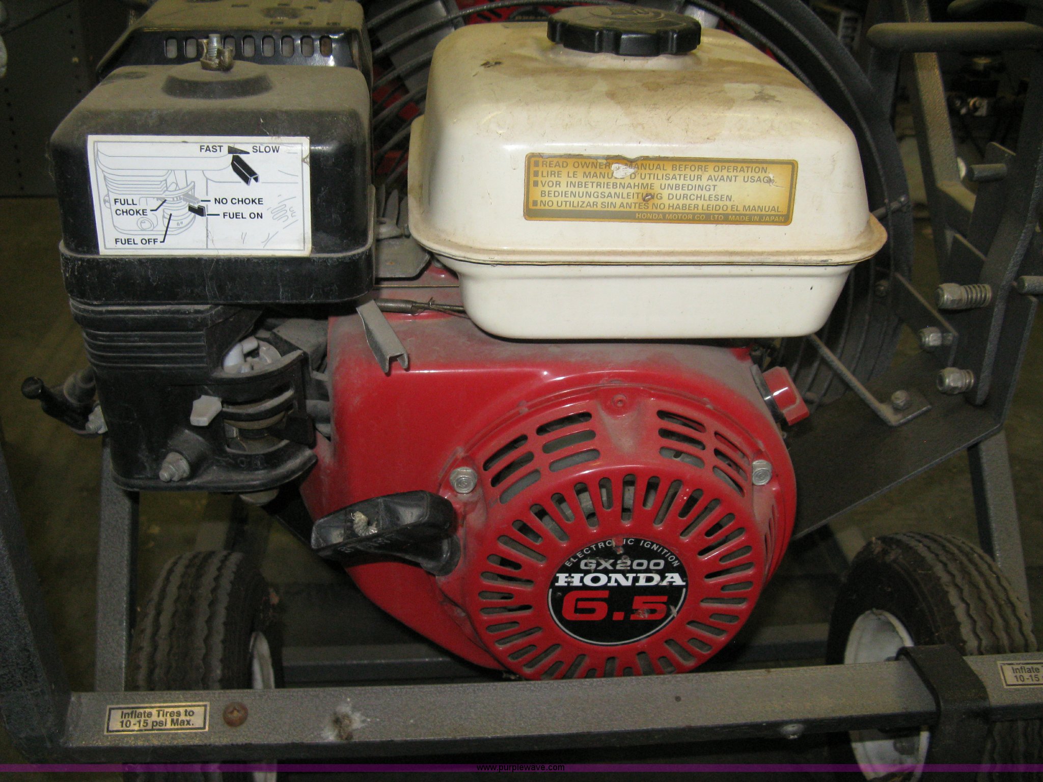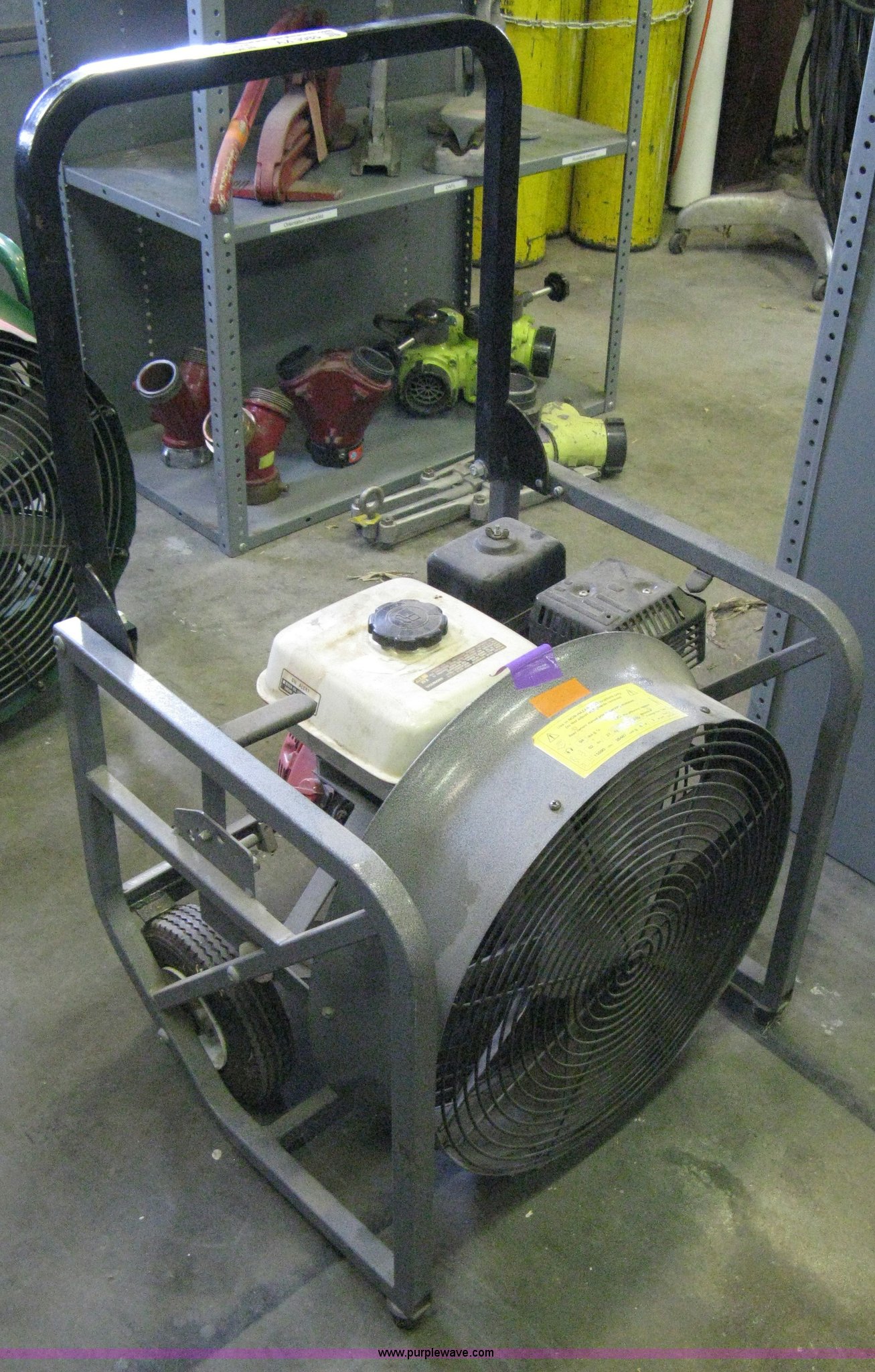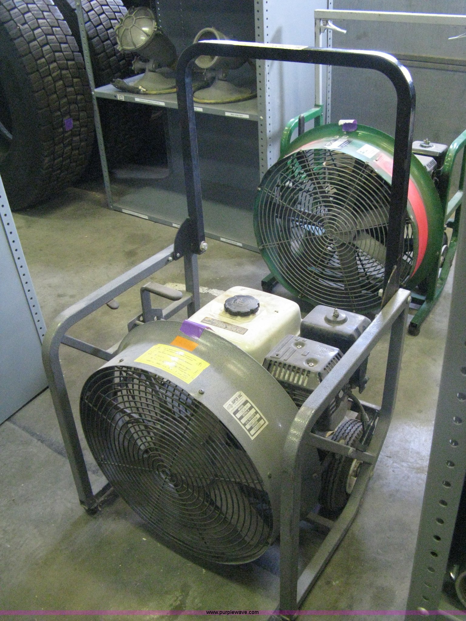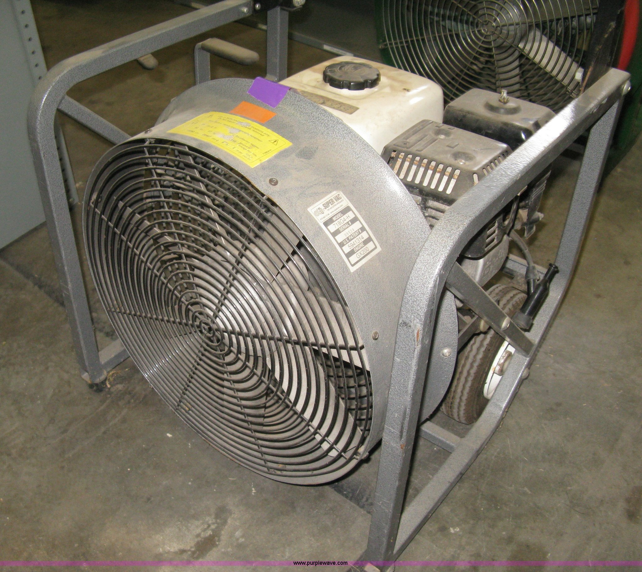 Purple Wave is selling a used Tools in Kansas. This item is a (2) positive pressure fans with the following: Super Vac 720G4H, Honda GX160 gas engine, 5.5 HP, Rolling dolly, Unknown operating condition, Super Vac 718G4-H, Honda GX200 gas engine, 6.5 HP, Rolling dolly, Unknown operating condition