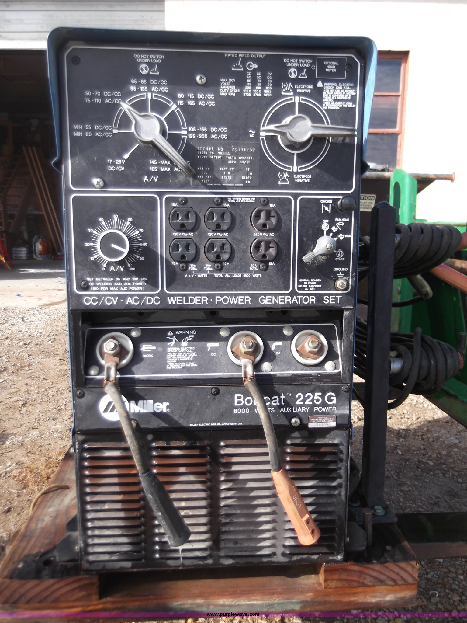 Purple Wave is selling a used Welder (Manual) in Kansas. This item is a Miller Bobcat 225G welder/generator with the following: Onan Performance 16 gas engine, 120/240V, 8,000 watt generator, CC/CV and AC/DC welder, 100' of positive and ground cable, Non-operational, Carburetor needs work, Fuel tank needs to be cleaned out, Has not been used for three years, Serial KC314959, Unit# 2706