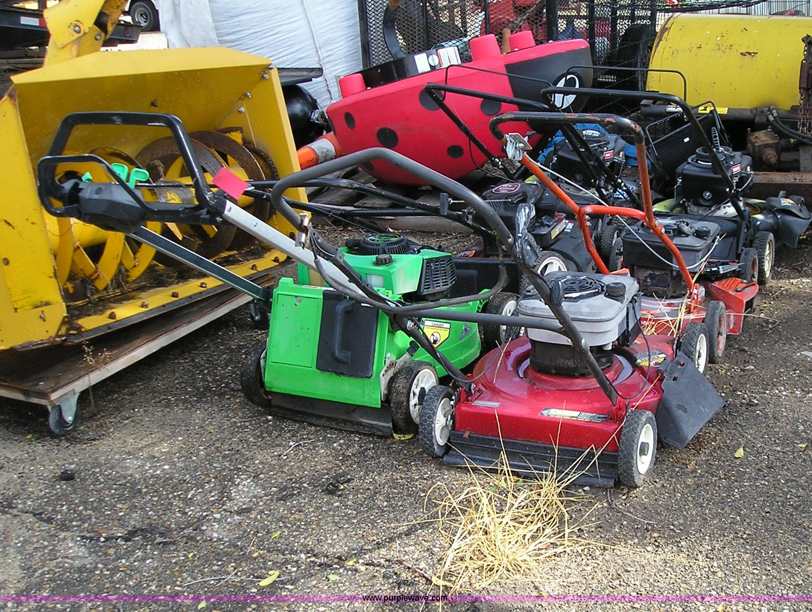 Purple Wave is selling a used Lawn and Garden in Kansas. This item is a Assorted equipment with the following: (6) push mowers, Some need repair, Hustler mower hood, Natural gas fuel tank with hood, Unit# 32