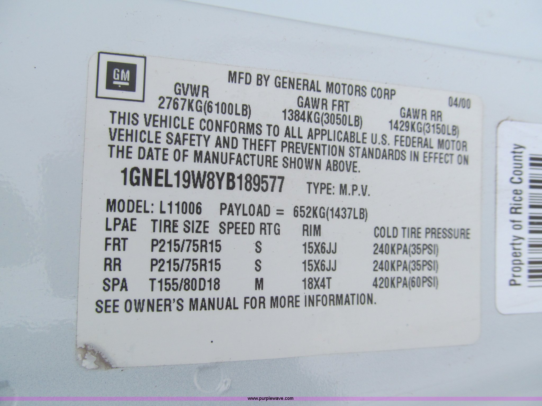 2000 Chevrolet Astro van. 196,542 actual miles, 4.3L V6 OHV 12V gas engine, Automatic transmission, All wheel drive, AC and heat, Tilt, AM/FM, Power windows and locks, Cloth interior, Internal cage Removable side door window cage, 215/75R15 tires, Interior cosmetic damage. 1GNEL19W8YB189577. Rice County Sheriff. 1482 U.S. 56. Lyons, KS 67554