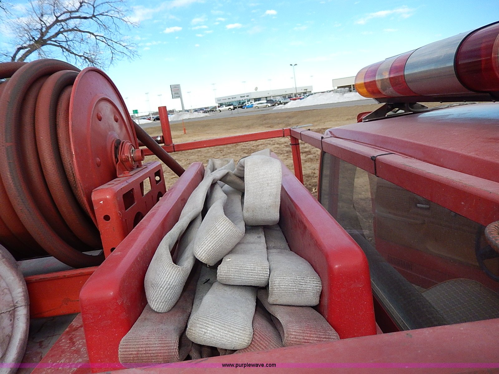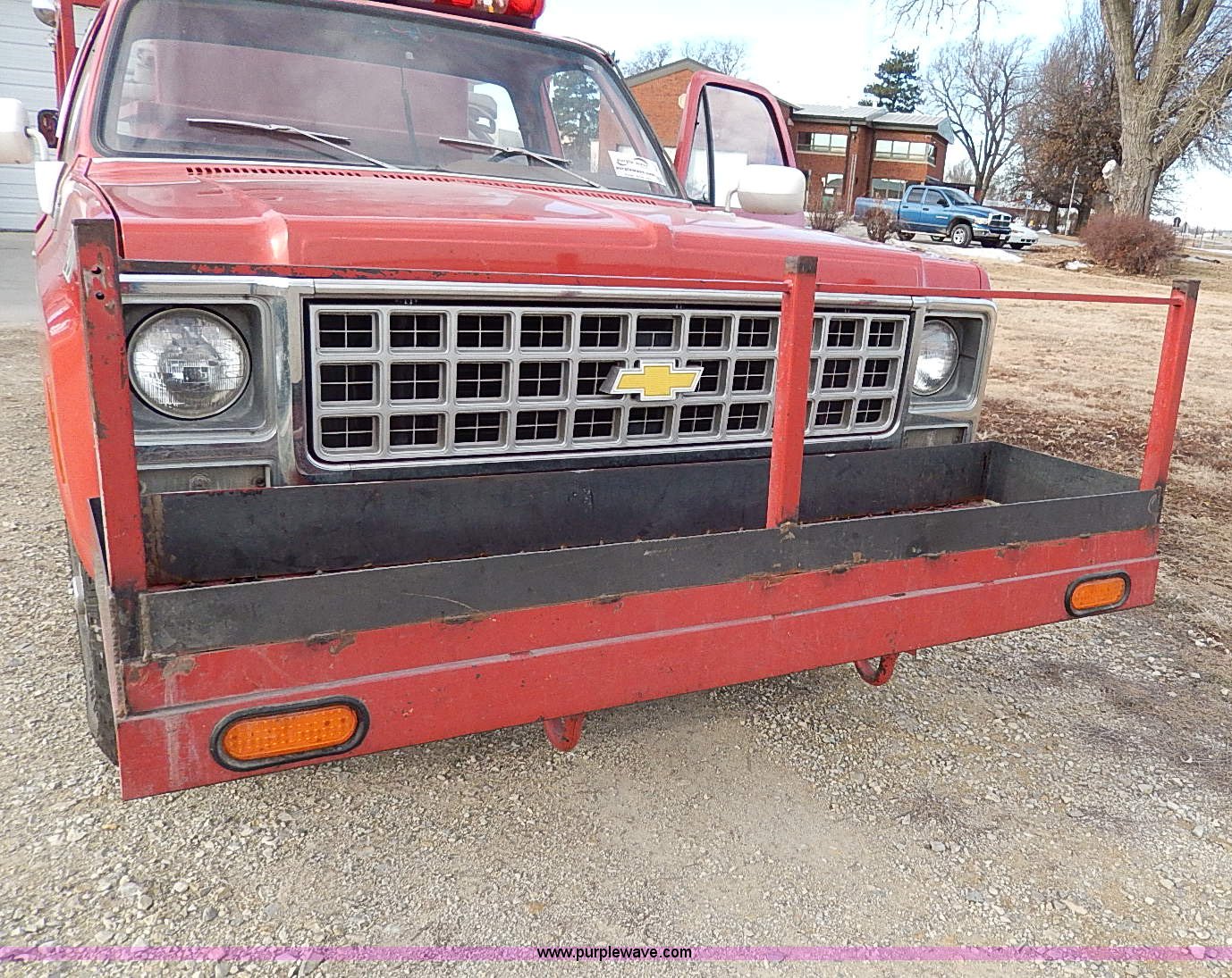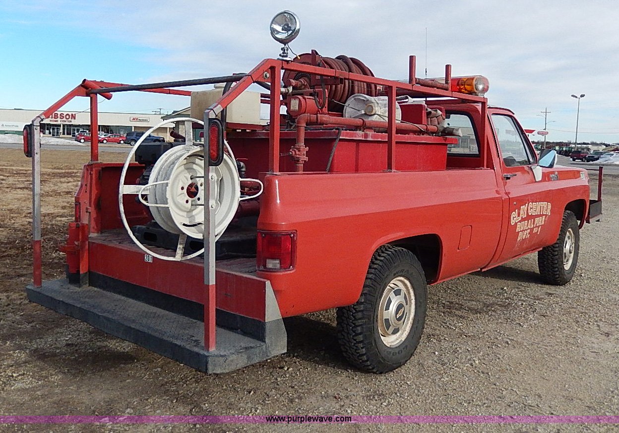 Purple Wave is selling a used Fire Truck or Emergency Vehicle in Kansas. This item is a 1980 Chevrolet C20 Custom Deluxe fire truck with the following: 9,294 miles on odometer, Eight cylinder gas engine, Four speed manual transmission, Four wheel drive, Heat, Manual windows and locks, Vinyl interior, CB radio is not included, 74" x 20" front walk way, Light bar, 150'L x 1.5" diameter water hose, 300 gallon fiberglass water tank, Briggs & Stratton 16 HP gas engine, Blizzard Wizard foam mixer, (4) assorted nozzles, 235/85R16 tires, Recently replaced battery and pressure gauge