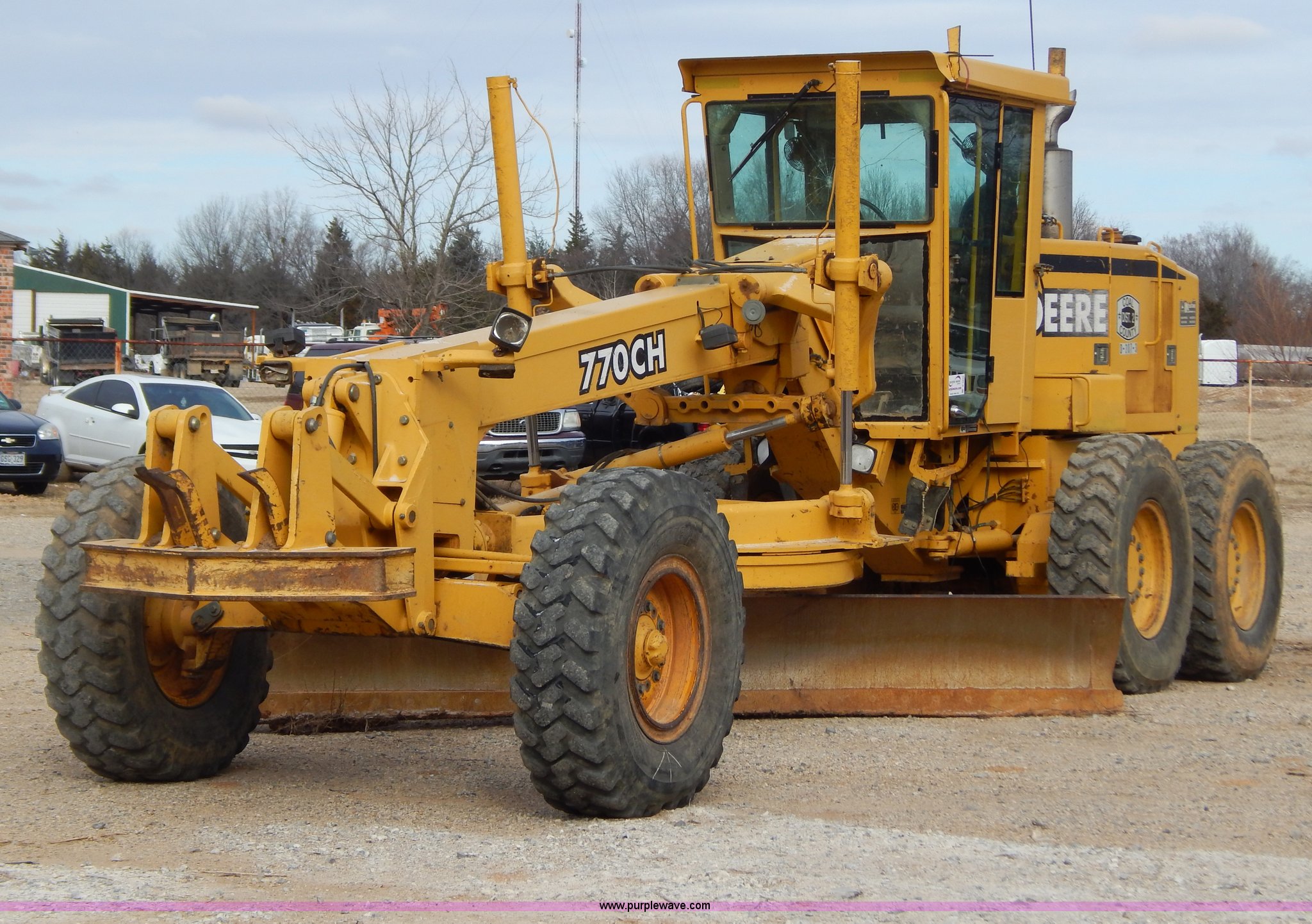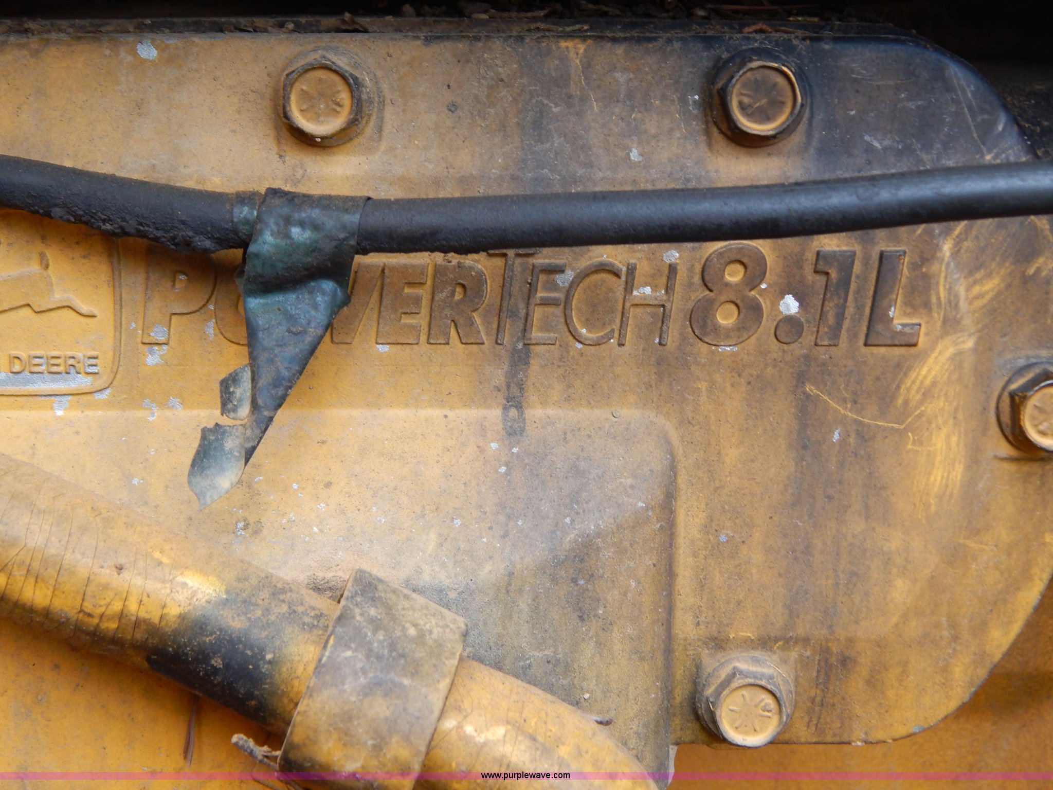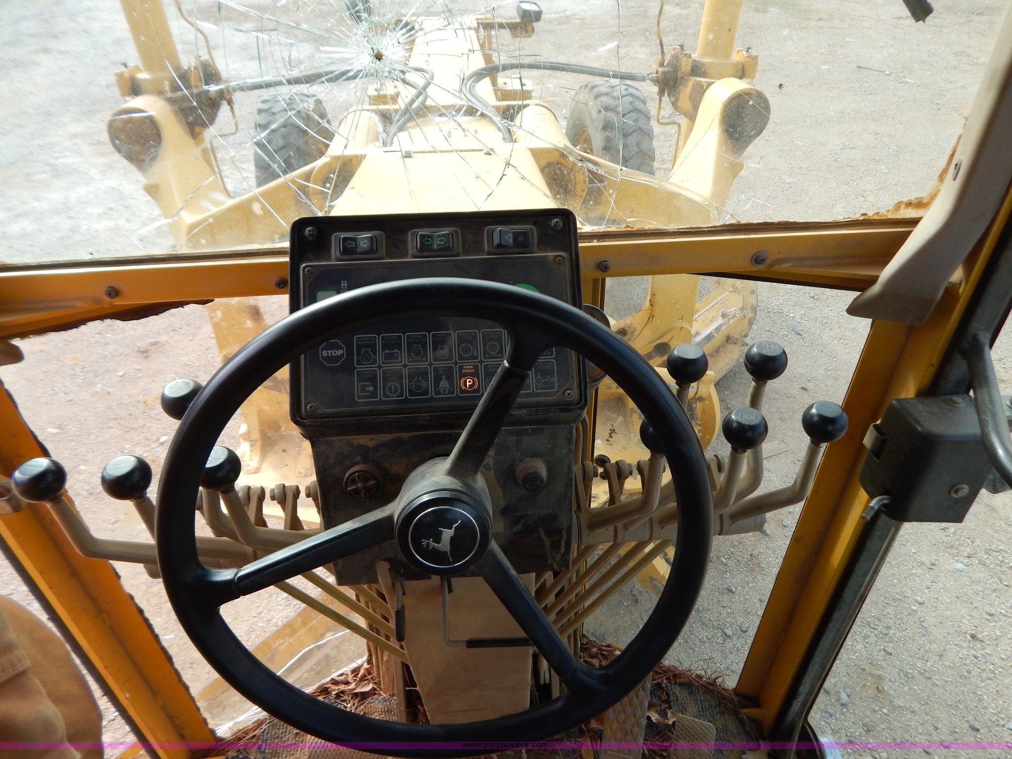 Purple Wave is selling a used Motor Grader in Oklahoma. This item is a with the following: 8,773 hours on meter, John Deere Power Tech 8.1L six cylinder diesel engine, Serial RG6081H121402, Powershift transmission, 8F-8R gears, Four wheel drive, Locking differential, EROPS, AC and heat, AM/FM, Suspension seat, Block heater, 14' moldboard, Tip control, Side shift, Front mounted three tooth scarifier, Rear receiver hitch, 2" ball, 14.00R24 tires, Serial DW770CH578354