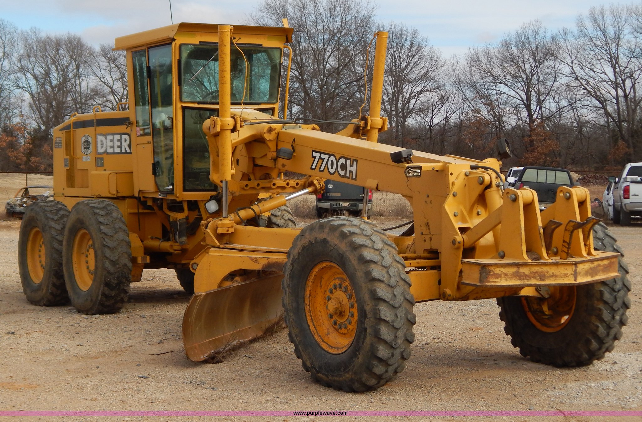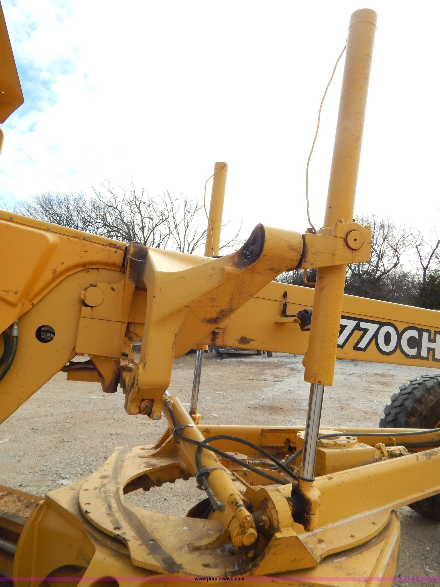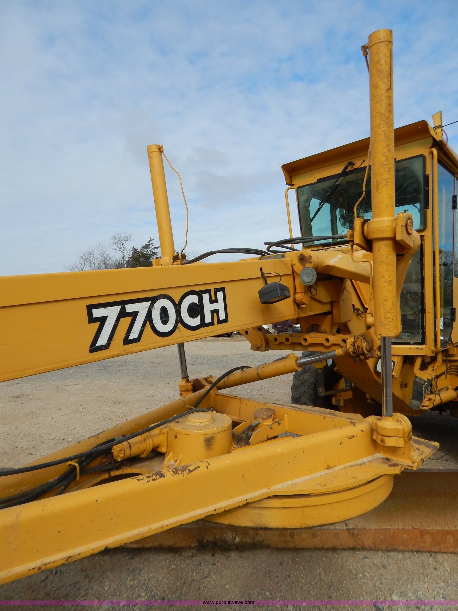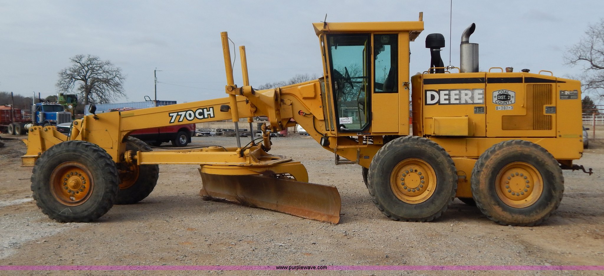 2001 John Deere 770CH articulated motor grader. 8,773 hours on meter, John Deere Power Tech 8.1L six cylinder diesel engine Serial RG6081H121402, Powershift transmission 8F-8R gears, Four wheel drive, Locking differential, EROPS, AC and heat, AM/FM, Suspension seat, Block heater, 14' moldboard Tip control, Side shift, Front mounted three tooth scarifier, Rear receiver hitch 2" ball, 14.00R24 tires, Serial DW770CH578354. View equipment video. 2700 S. Mississippi. Atoka, OK 74525