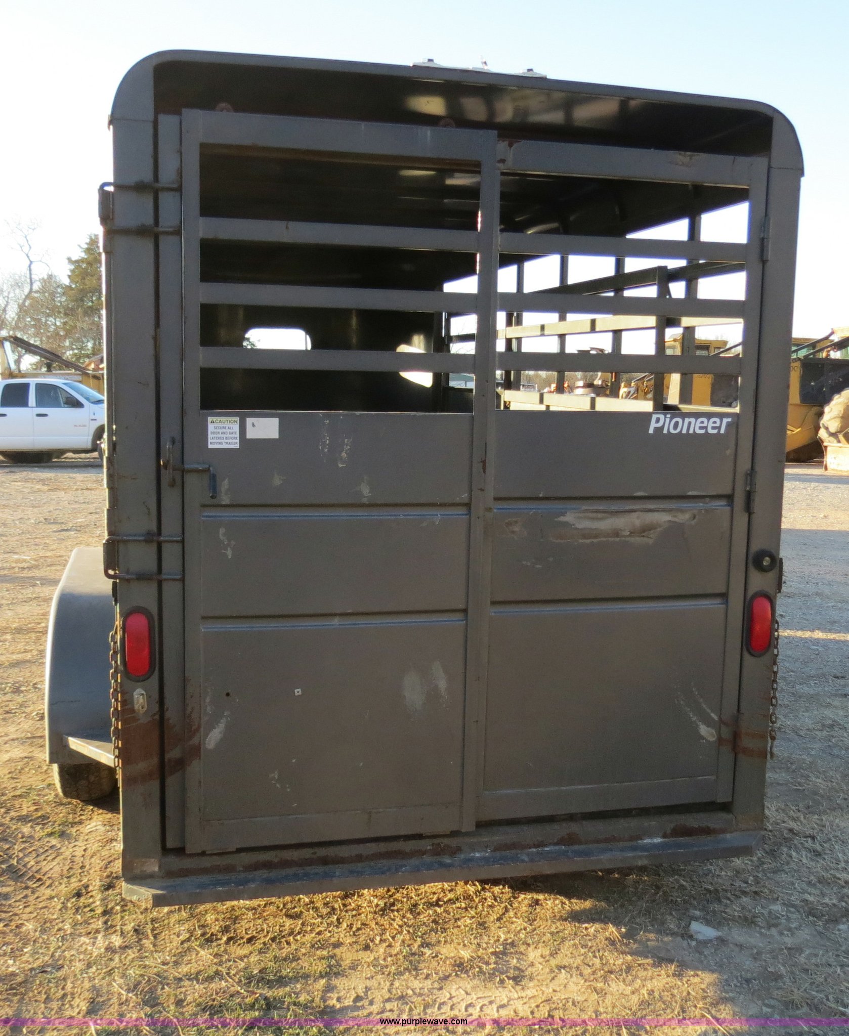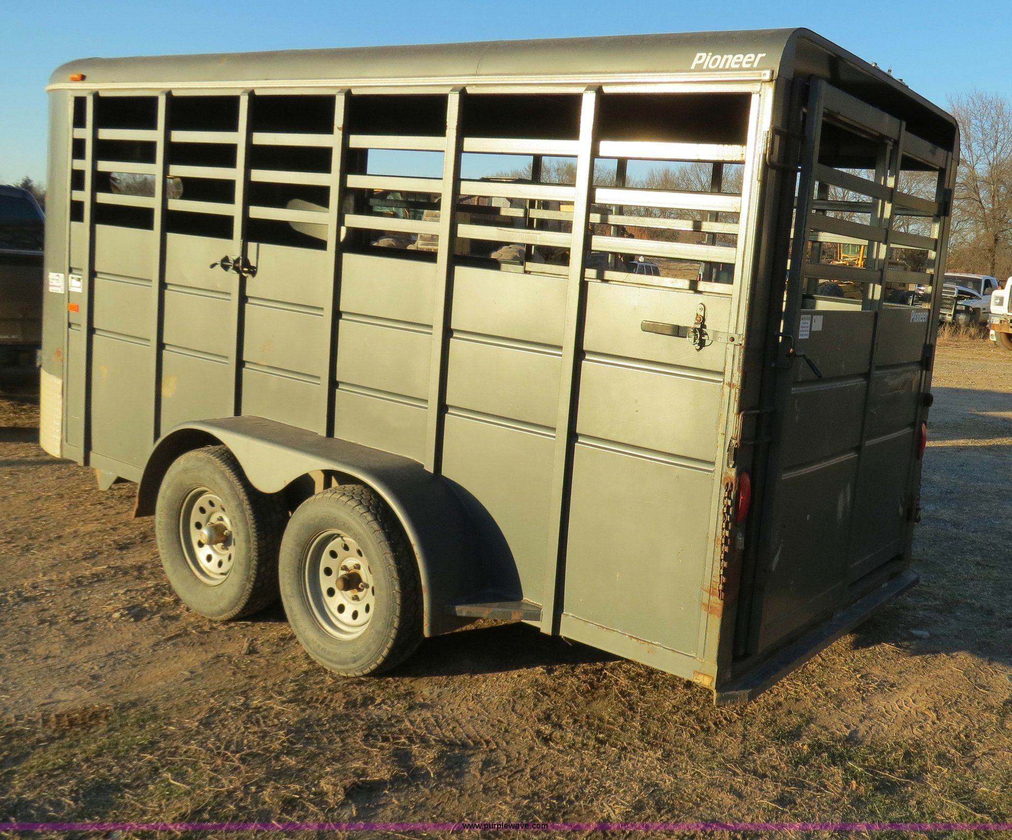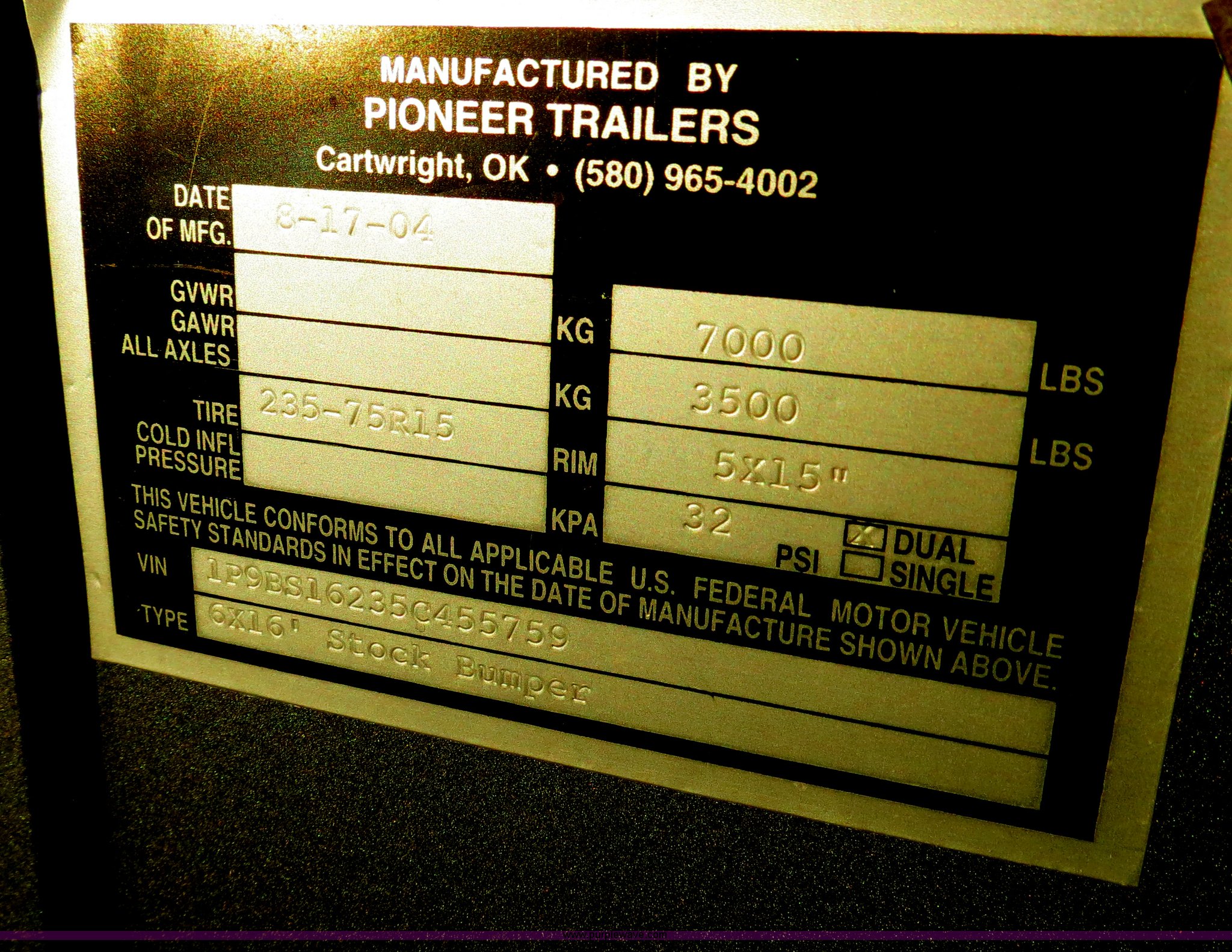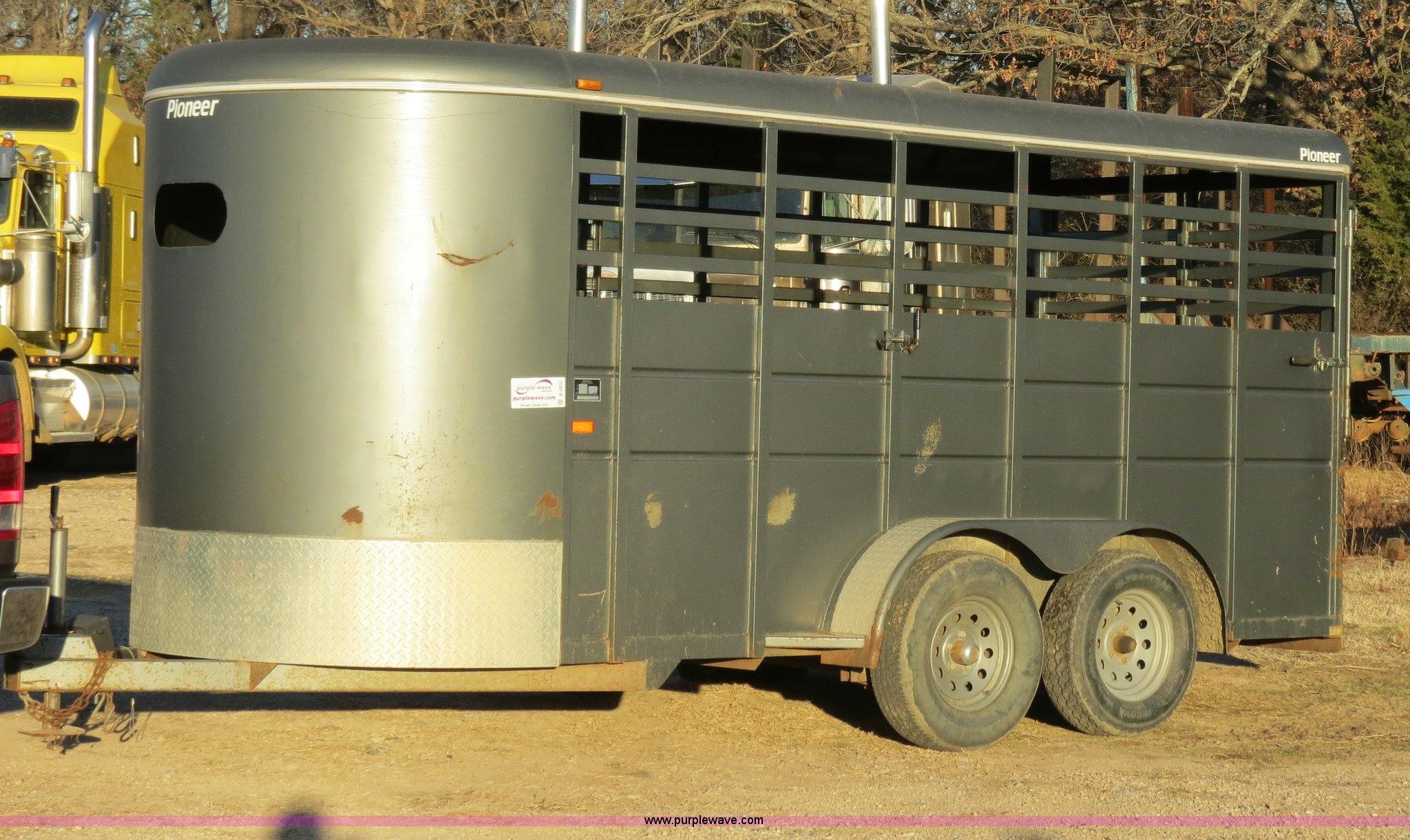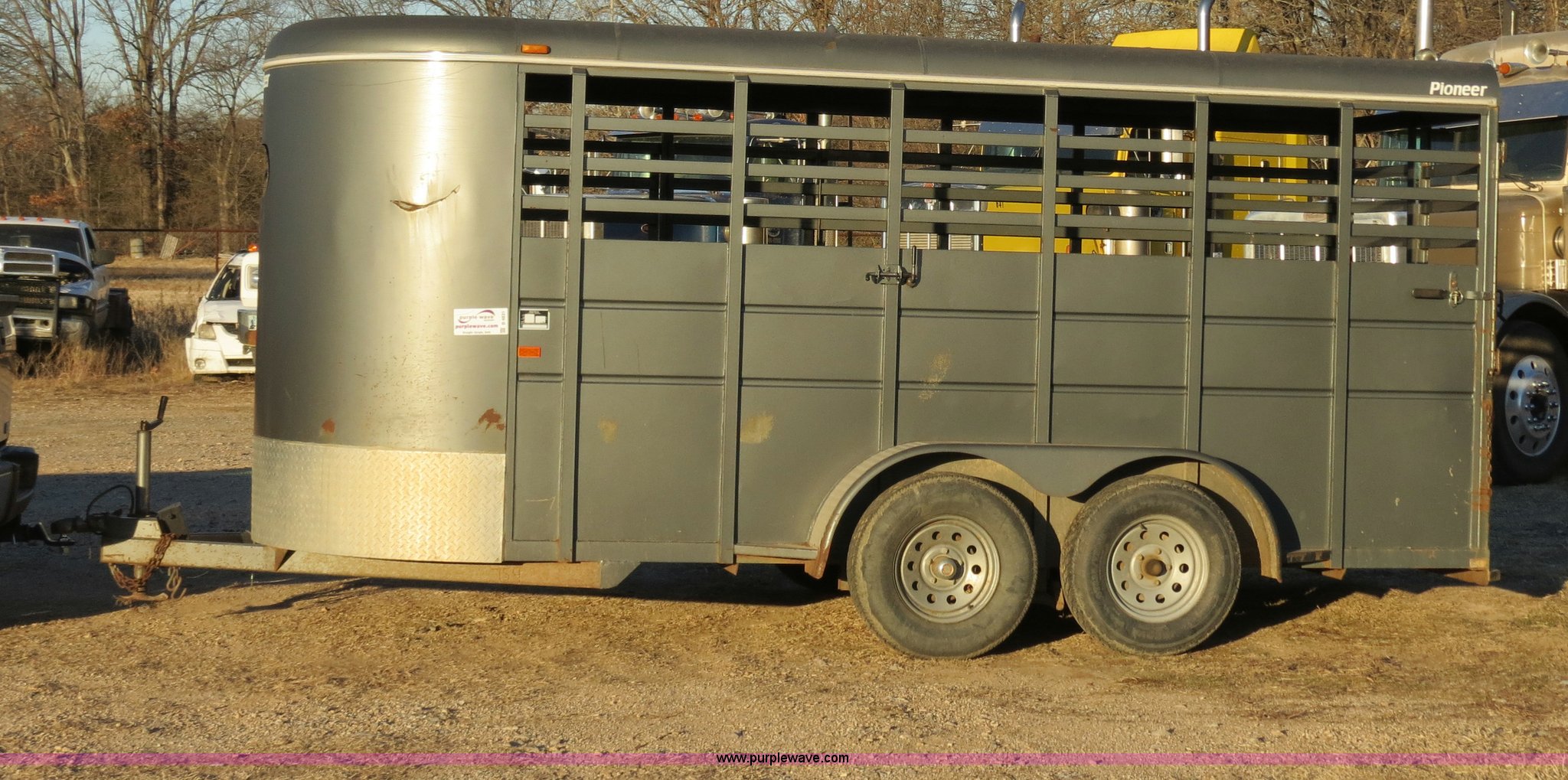 2004 Pioneer tandem axle stock trailer. 16'L x 6'W, Middle divider, Rubber floor mats, Front side door, Sliding rear door, 2" ball hitch, Six pin trailer wiring, Jack, Spare tire rack, 235/75R15 tires, GVWR 7,000 lbs, GAWR 3,500 lbs. Title distribution may be delayed up to 14 days from verification of funds. 1P9BS16235C455759. 2700 S. Mississippi. Atoka, OK 74525