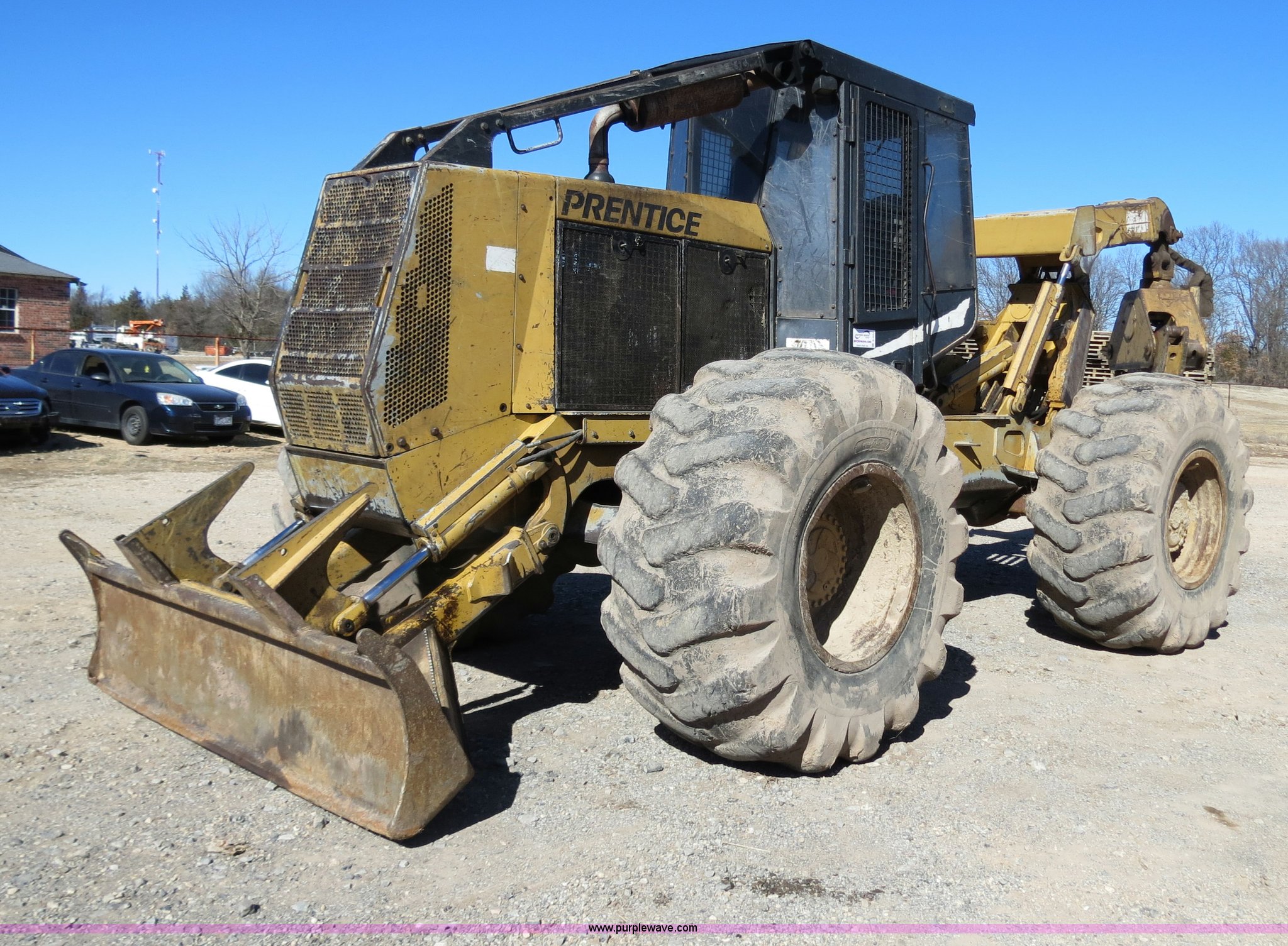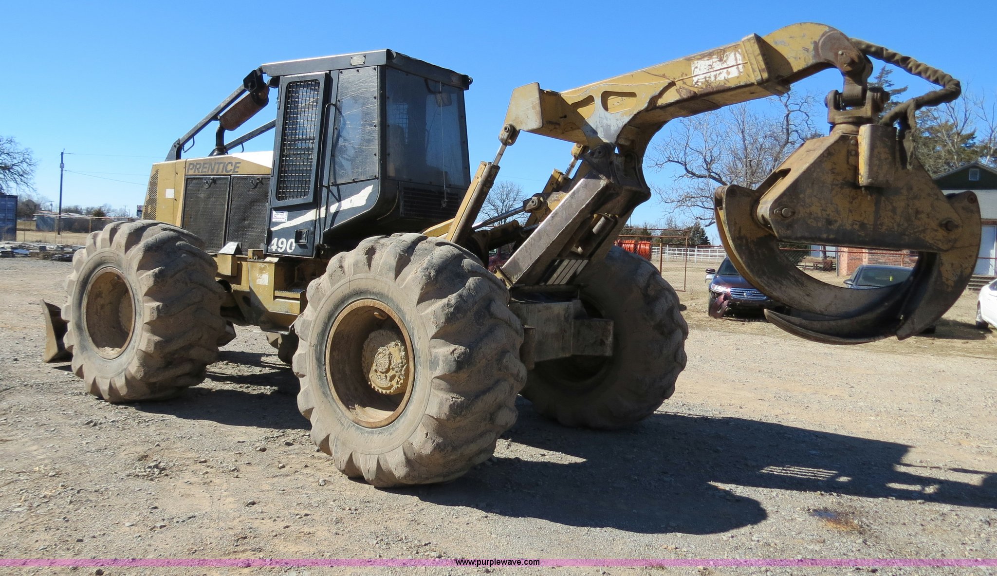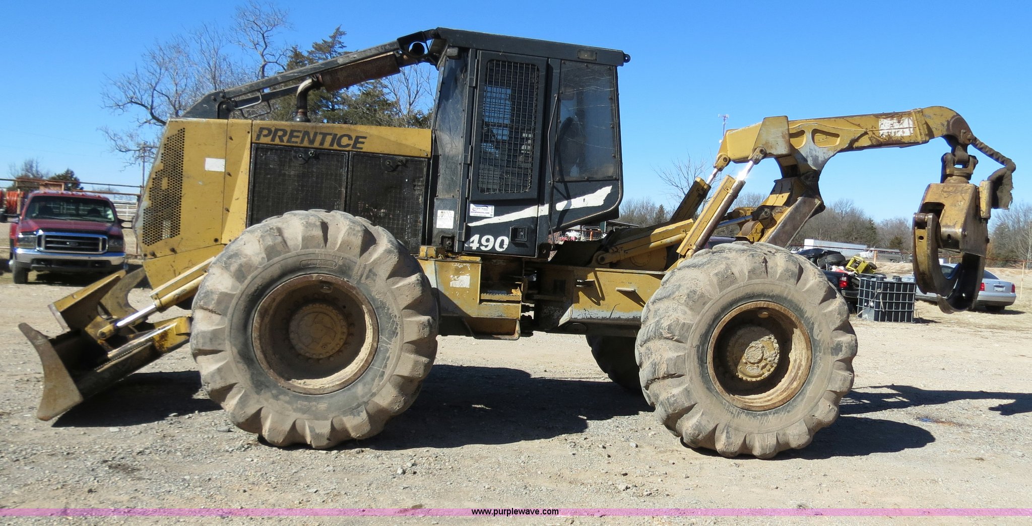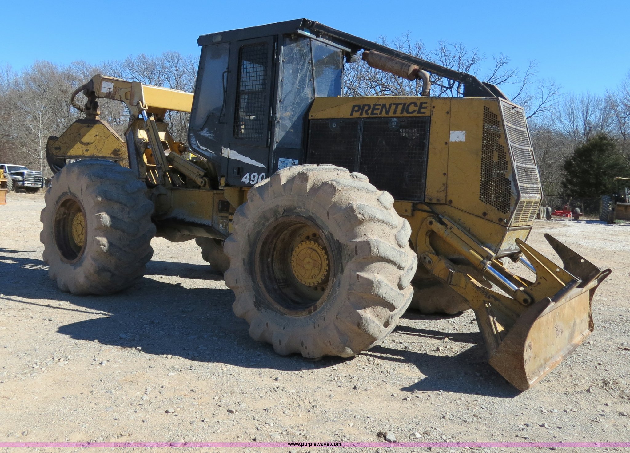 2003 Prentice 490 skidder. 390 hours on meter, Cummins B5.9-C 5.9L six cylinder turbo diesel engine, Spicer APC70 powershift transmission, Enclosed cab, AM/FM/cassette, Suspension seat, Sweeps, Window screens , Work lights, 99"W blade, Dual function arch, Winch 1" diameter cable, 30.5 x 32 tires, Serial SK15090. View equipment video. 2700 S. Mississippi. Atoka, OK 74525