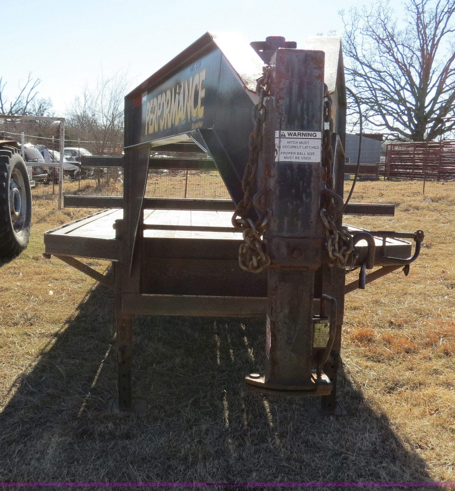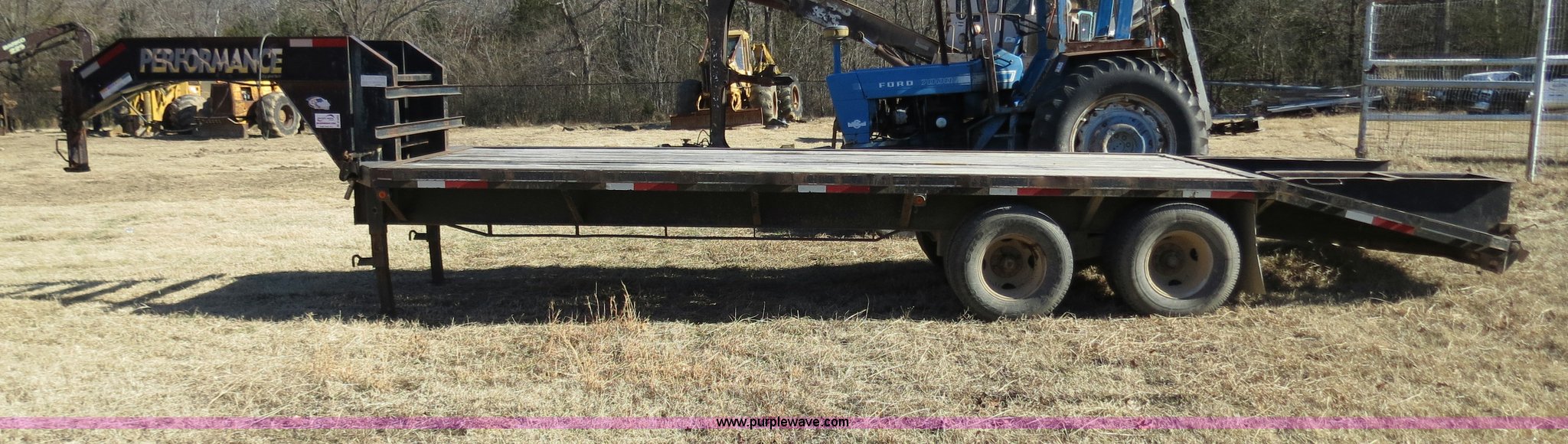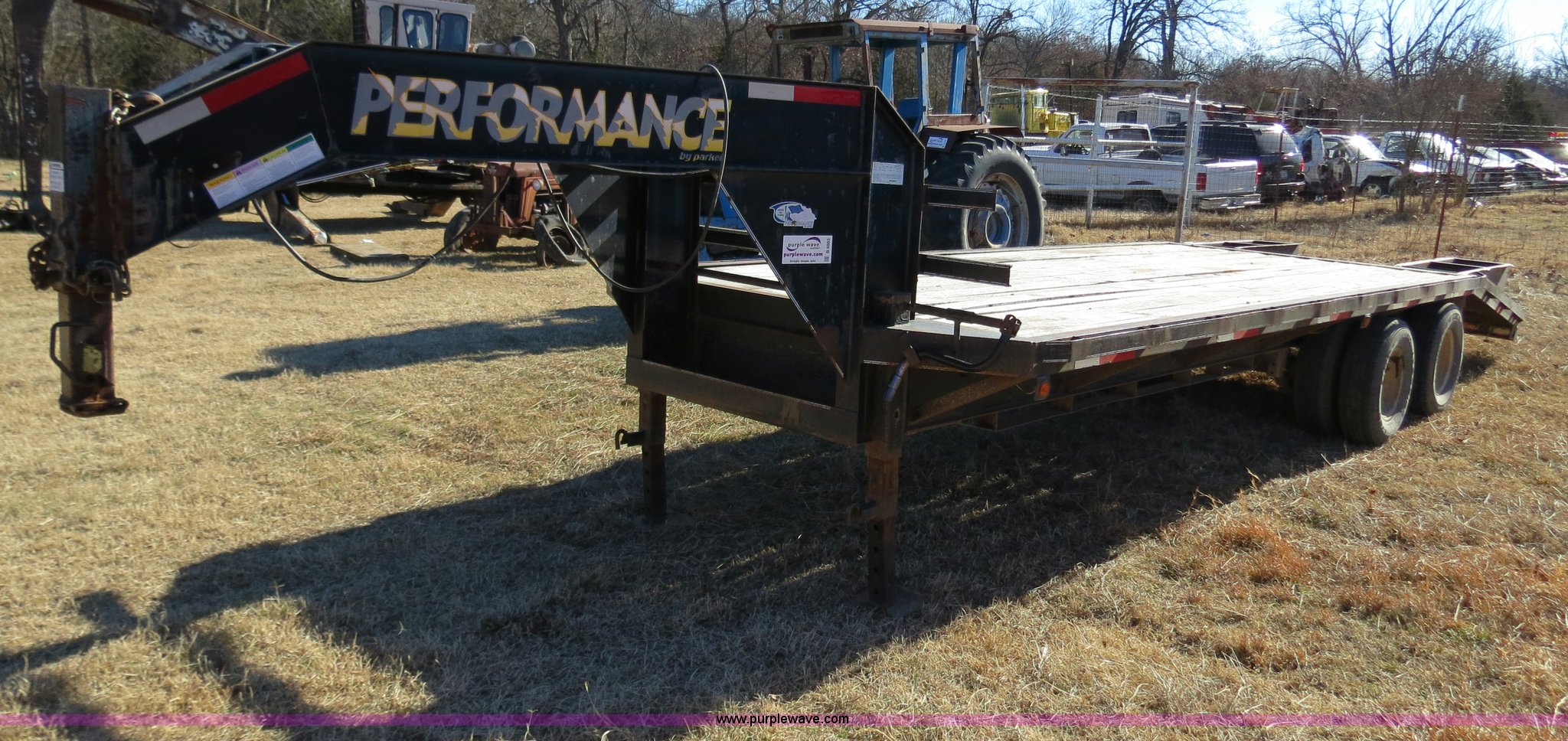 2003 Performance 24' gooseneck flatbed trailer. 19'L x 96"W deck, 5'L dovetail, Fold down ramps, Seven pin electrical plug-in, Dual landing gear, Rear receiver hitch, Spring suspension, Dual tandem axles, ST235/80R16 tires, GVWR 17,120 lbs, GAWR 10,000 lbs. Title distribution may be delayed up to 14 days from verification of funds. 13ZGF242531000086. 2700 S. Mississippi. Atoka, OK 74525