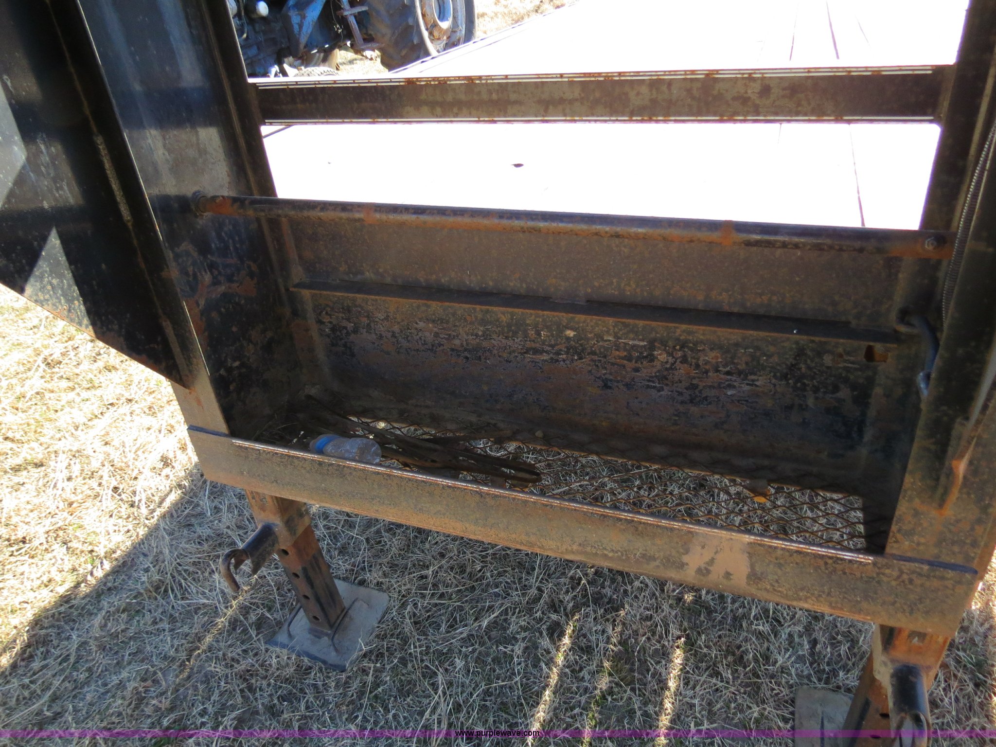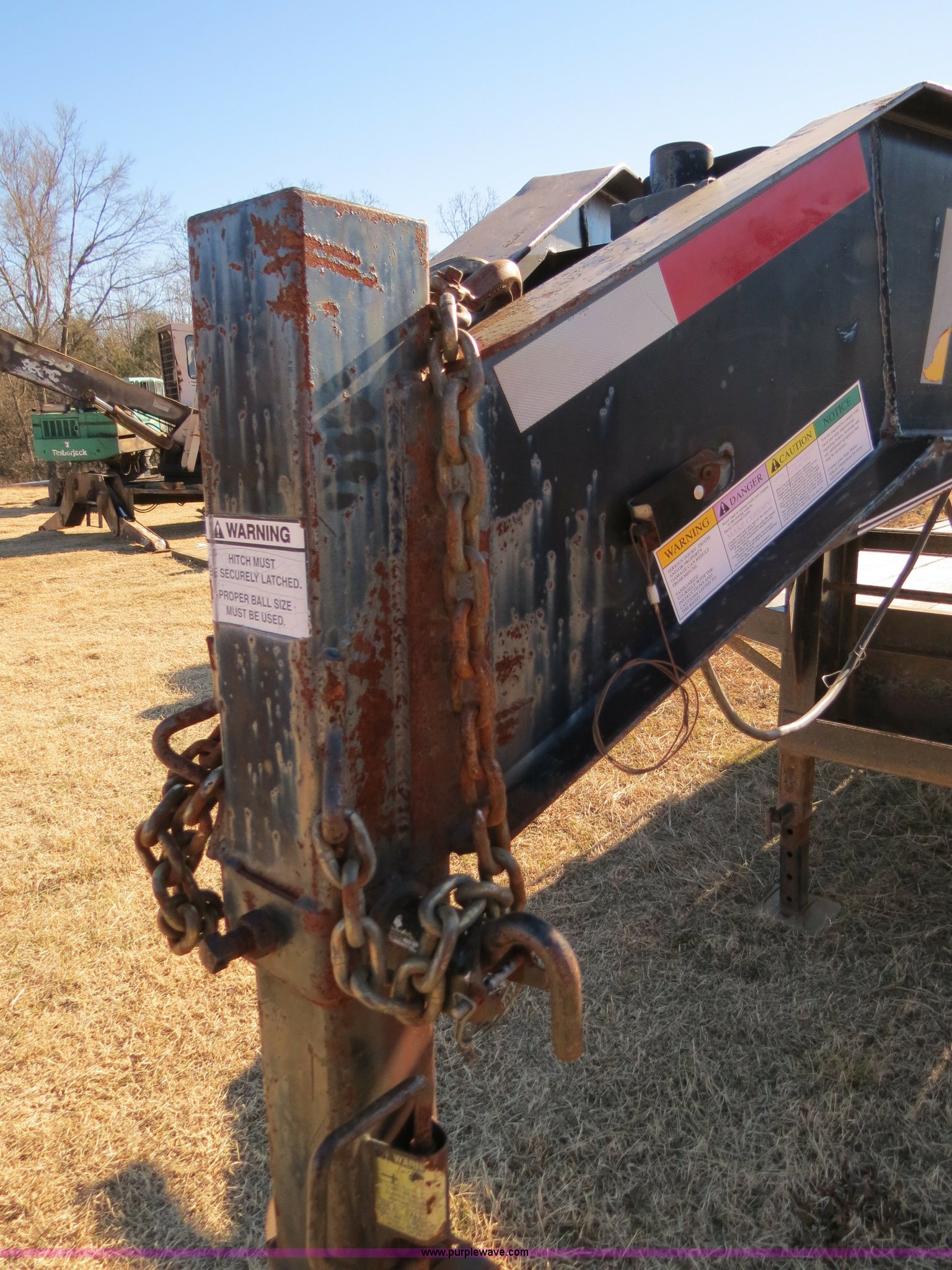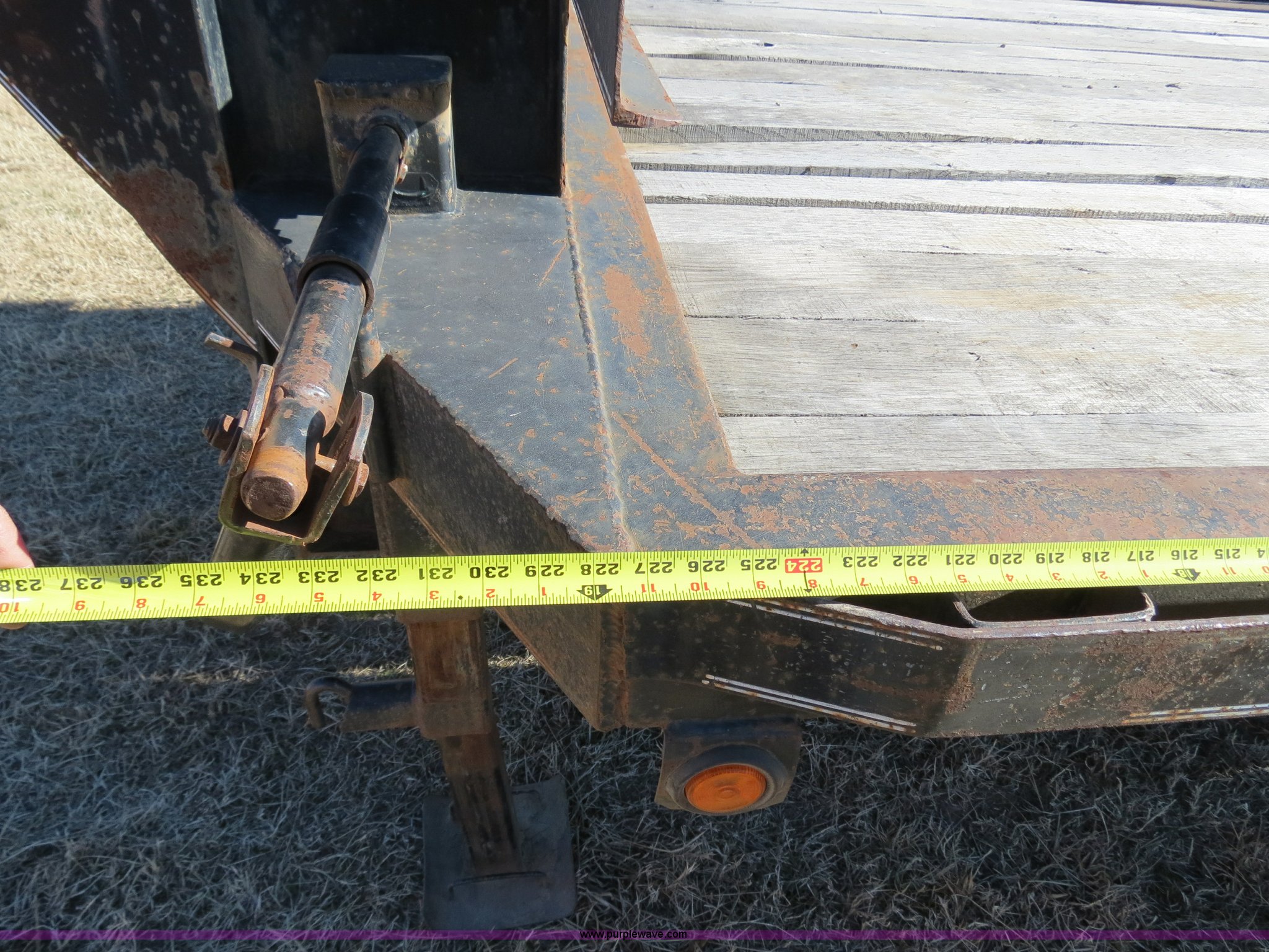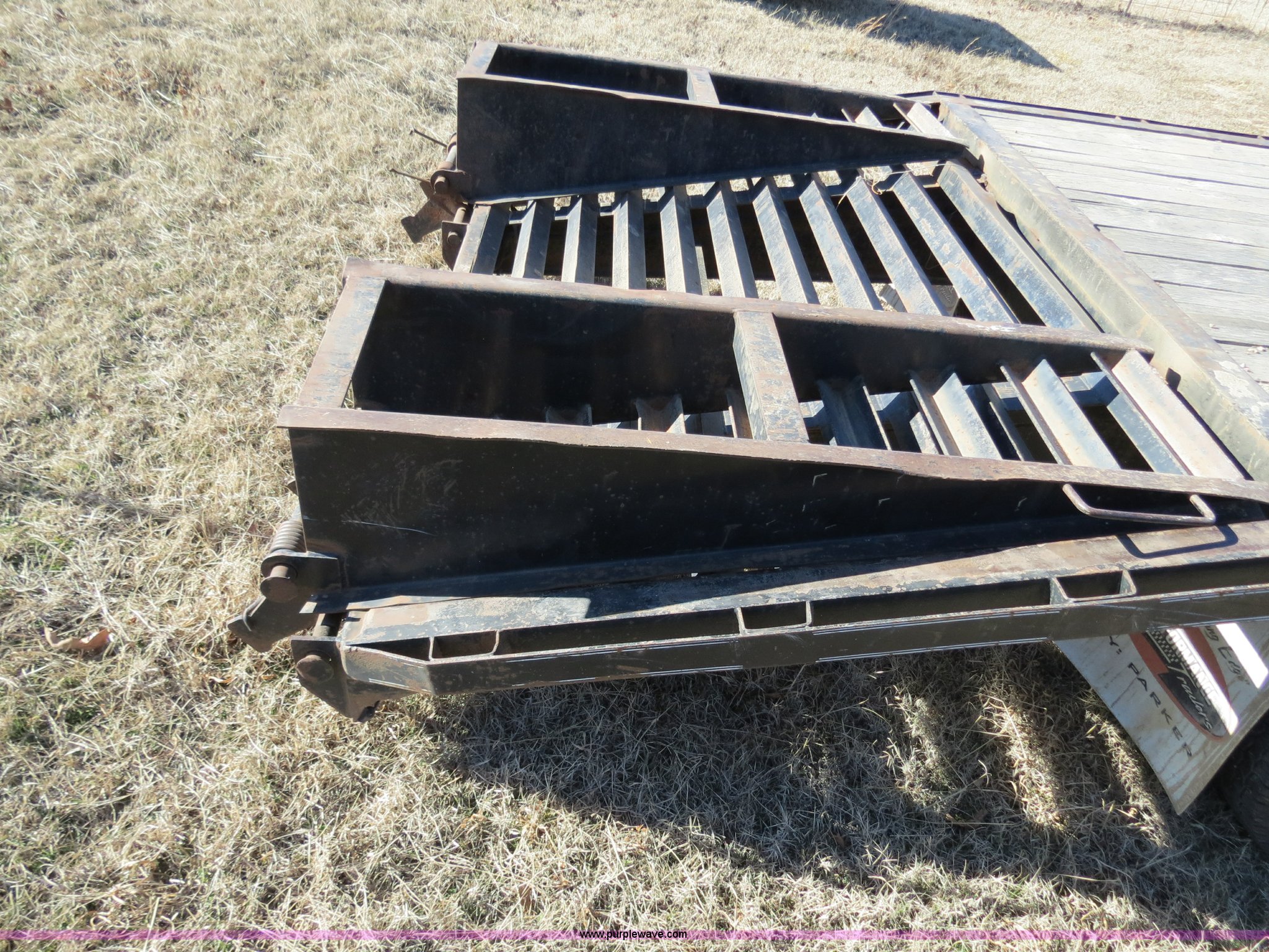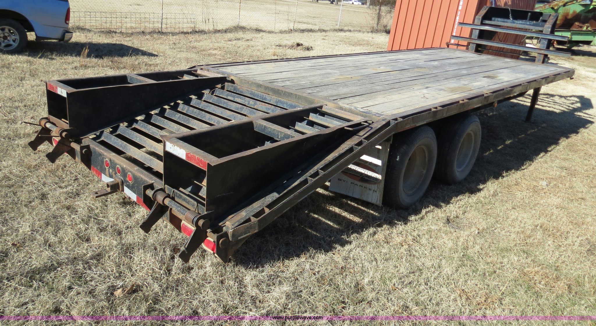 Purple Wave is selling a used Equip. Trailer in Oklahoma. This item is a with the following: 19'L x 96"W deck, 5'L dovetail, Fold down ramps, Seven pin electrical plug-in, Dual landing gear, Rear receiver hitch, Spring suspension, Dual tandem axles, ST235/80R16 tires, GVWR 17,120 lbs, GAWR 10,000 lbs