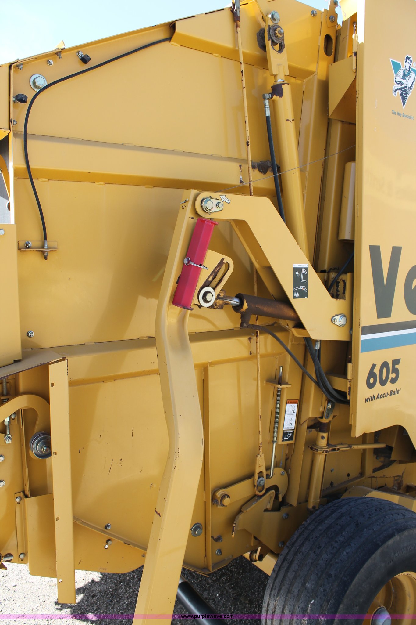 Purple Wave is selling a used Round Baler in Texas. This item is a Vermeer 605 XL round baler with the following: 5' x 6' bale capacity, Accu-bale, 1000 PTO, Net wrap, Bale kicker, Gathering wheels, Transport lights, (5) bale forming belts, Monitor, 31 x 13.50-15 tires, Serial 1VRV141M211000671