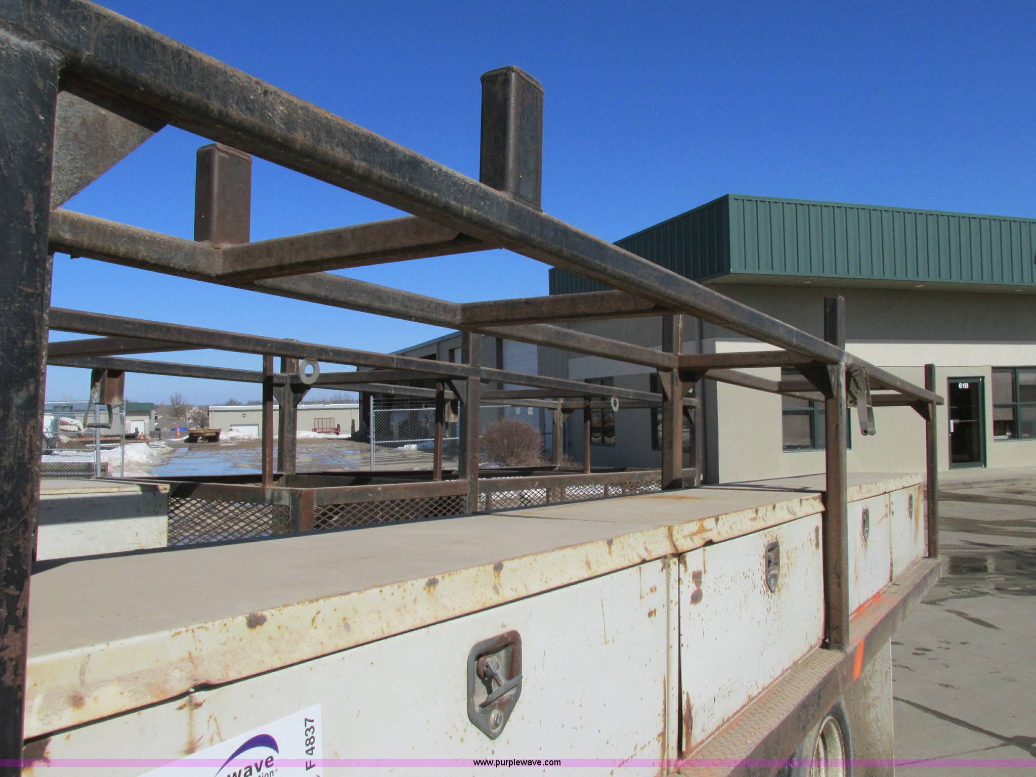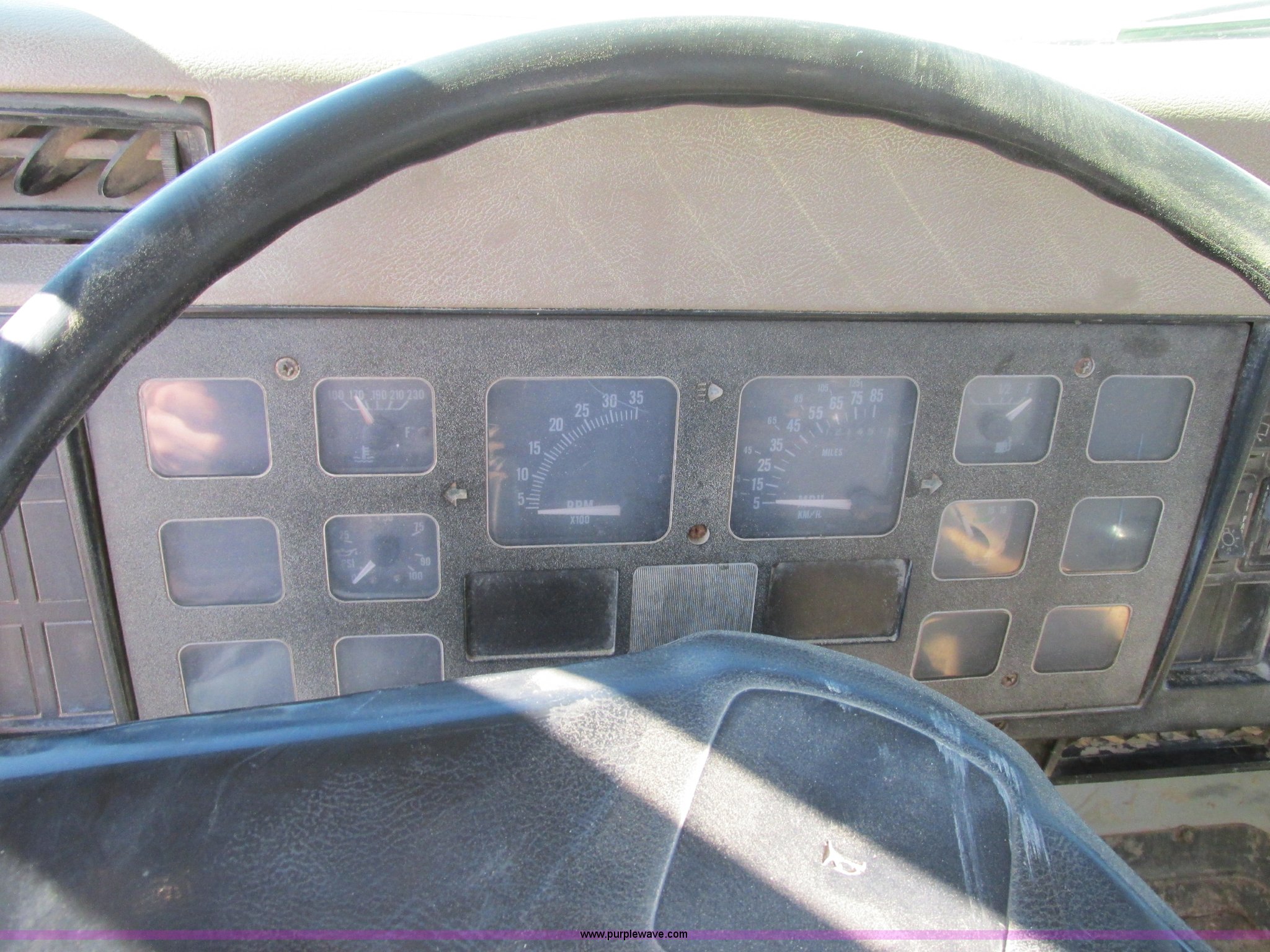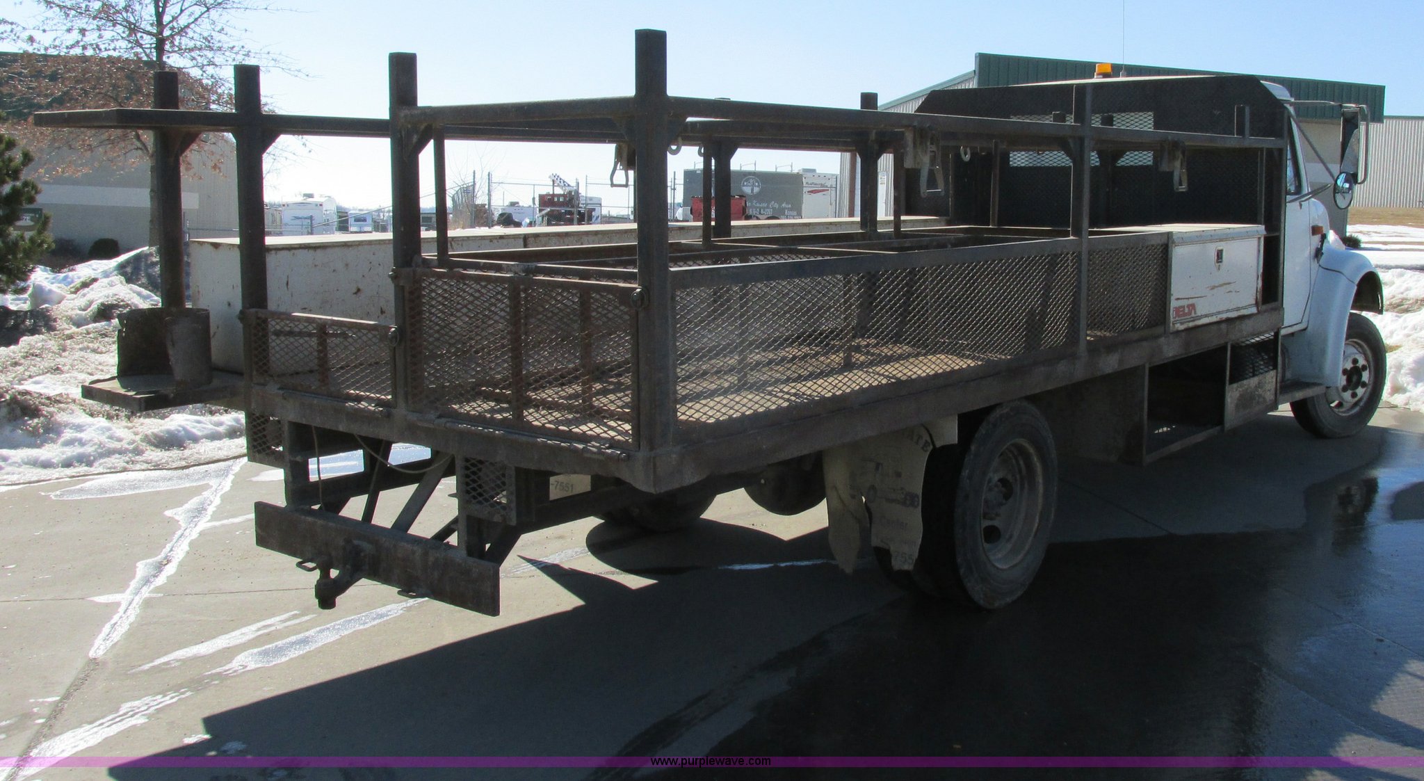 Purple Wave is selling a used Flat Bed Truck in Missouri. This item is a 1991 International 4600LP flatbed truck with the following: 121,451 actual miles, International T444 7.3L V8 diesel engine, Five speed manual transmission, AC and heat, AM/FM/cassette, Manual windows and locks, Vinyl interior, Block heater, 16.5'L flatbed, 8'W, Rebar racks on both sides, (5) toolboxes on driver's side, Toolbox and racks on passenger side, Flashing yellow beacon light, 40 gallon fuel tank, 152" wheelbase, 8R19.5 tires, 12 ply, Missing head lights, Hood damage