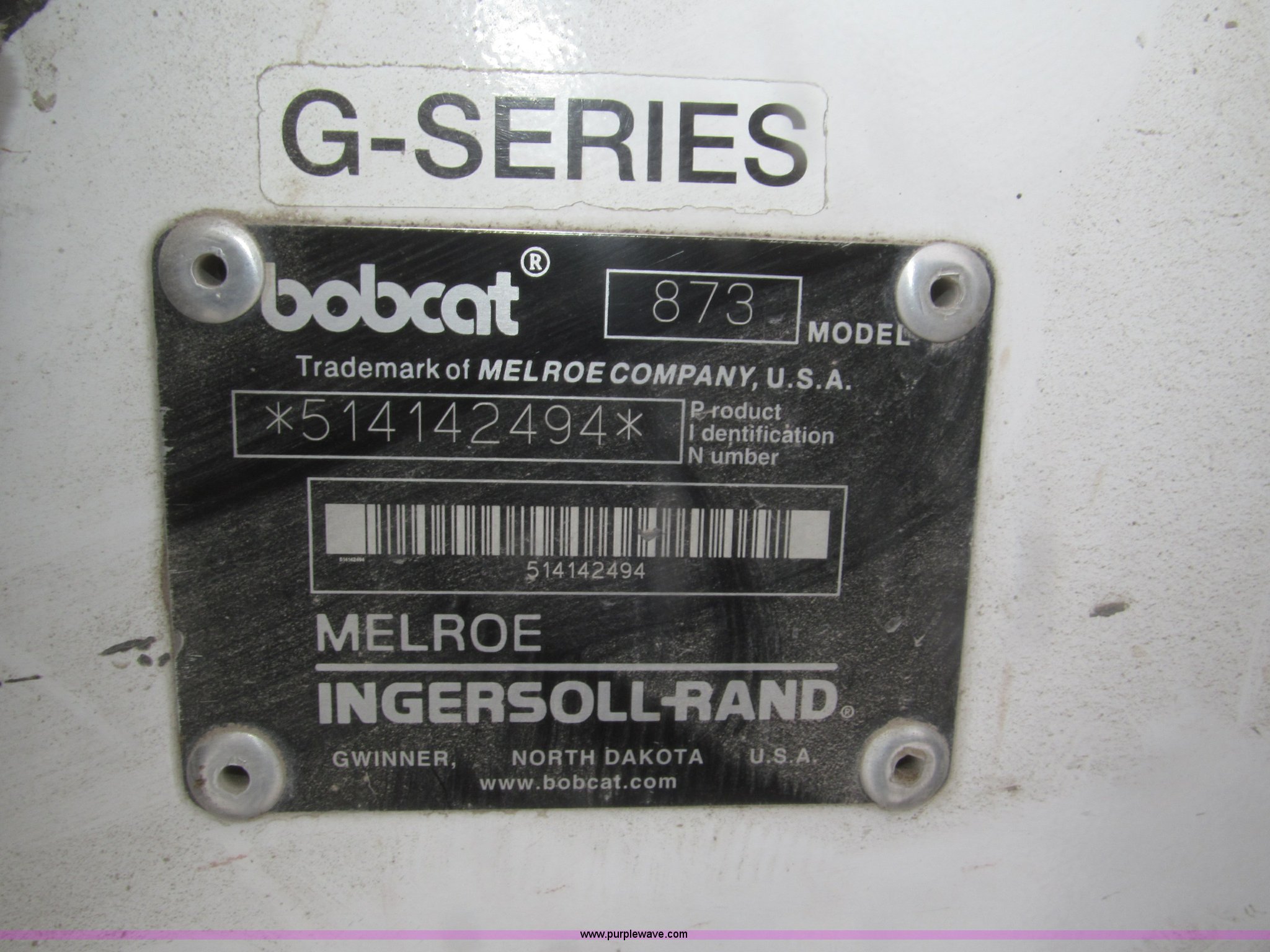 2000 Bobcat 873G skid steer. 4,459 hours on meter, Hours may vary, unit is still in use, Deutz BF4M1011F 2.92L four cylinder turbo diesel engine 73 HP, Hand and foot controls, Spring suspension seat, High flow auxiliary hydraulics, Manual quick coupler, 25 gallon fuel tank, 2,400 lbs rated operating capacity, 4,800 lbs tipping load, 74"W, 79"H, 124.3" height to bucket hinge pin, Front work lights, 12-16.5 NHS tires, Seat torn, No bucket, Serial 514142494. View repairs. View equipment video. Cather & Sons Construction. 6400 N. 70th Street. Lincoln, NE 68507