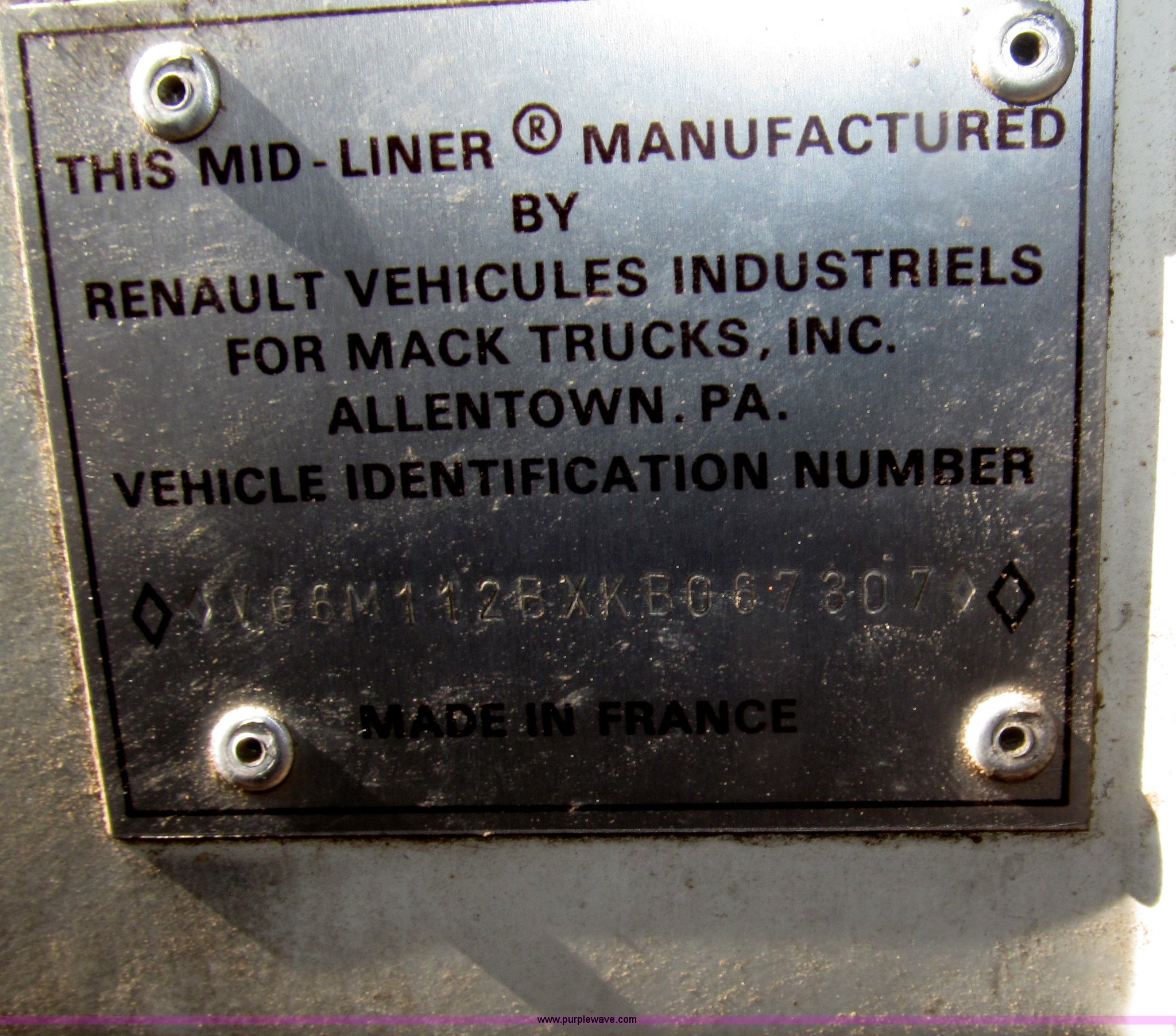 1989 Mack MS300P truck cab and chassis. 229,224 miles on odometer, Renault 8l8L six cylinder turbo diesel engine 215 HP, Turbo inter-cooler, Six speed manual transmission, AC and heat, AM/FM/cassette Unknown operating condition, Cloth interior, Block heater, 50 gallon fuel tank, Lower exhaust, 15' frame behind cab, Driver's side air tank, Spring suspension, Air brakes, 144" wheelbase, 11R22.5 tires, GVWR 33,000 lbs, FAWR 12,000 lbs, RAWR 21,000 lbs, Maintenance records available, Interior/exterior cosmetic damage, Battery removed from dash, No driver's door window, window will be replaced before auction, Fuel cap missing. VG6M112BXKB067307. View equipment video. Midwest Coatings. 2438 335th St. Missouri Valley, IA 51555