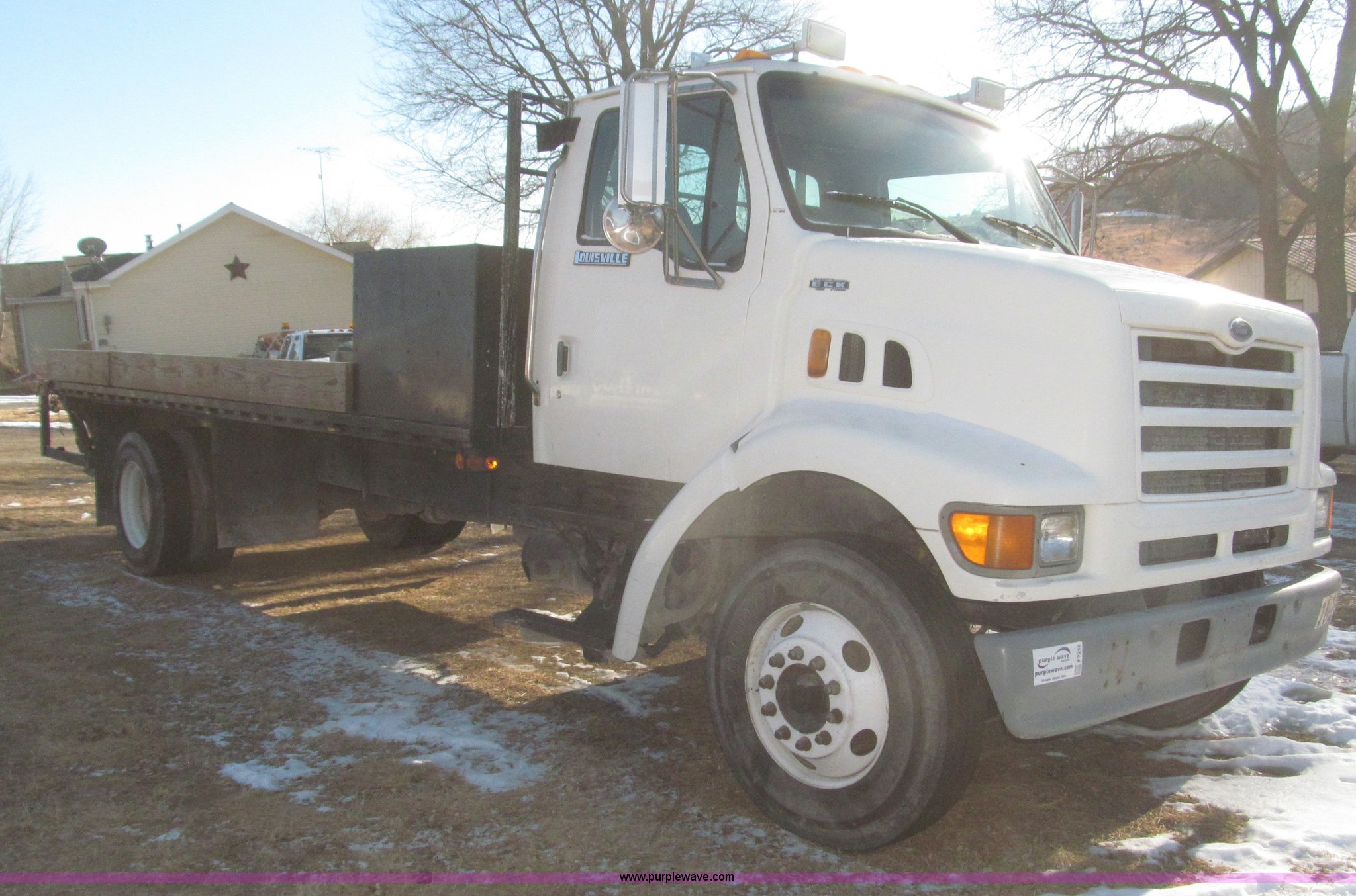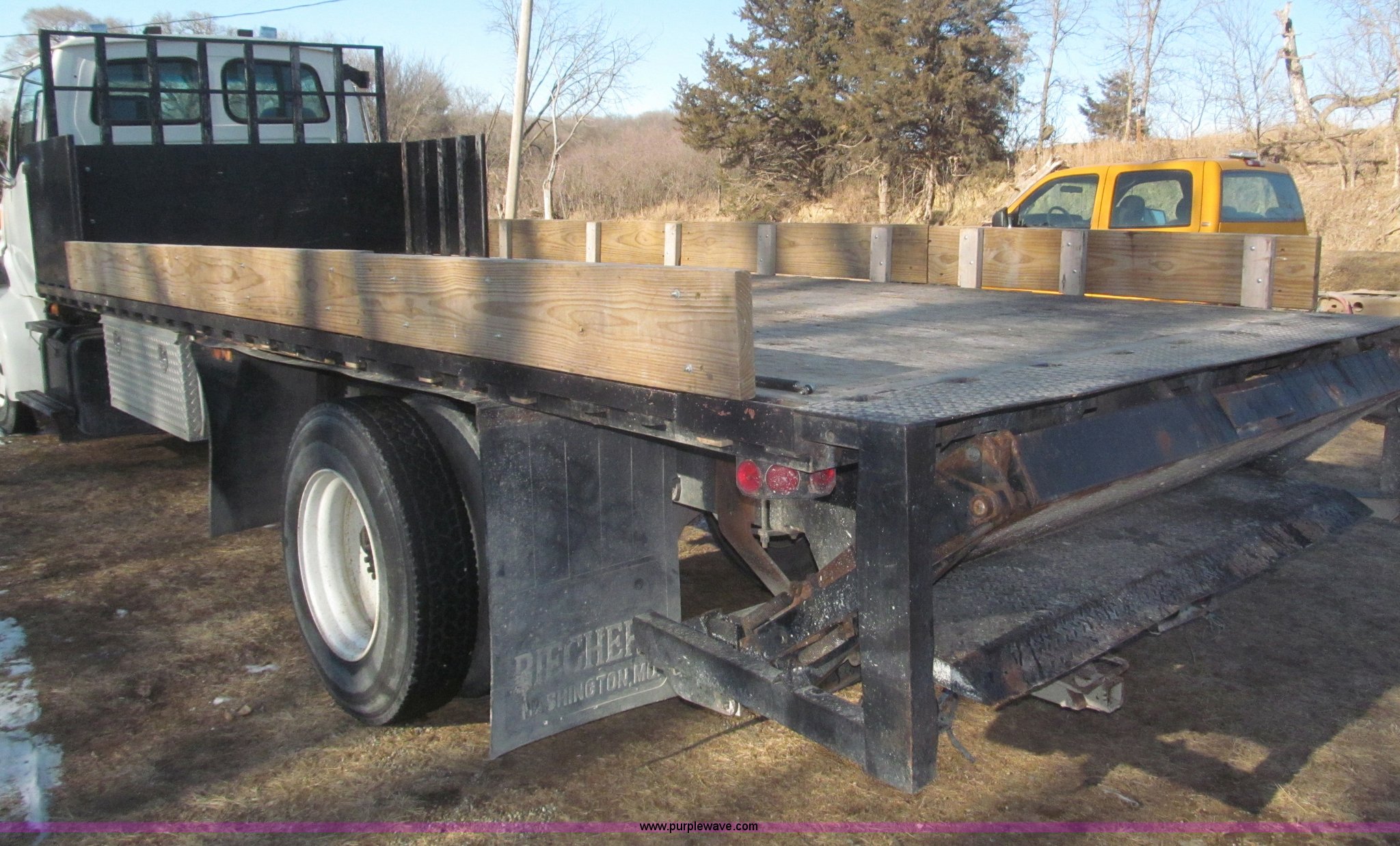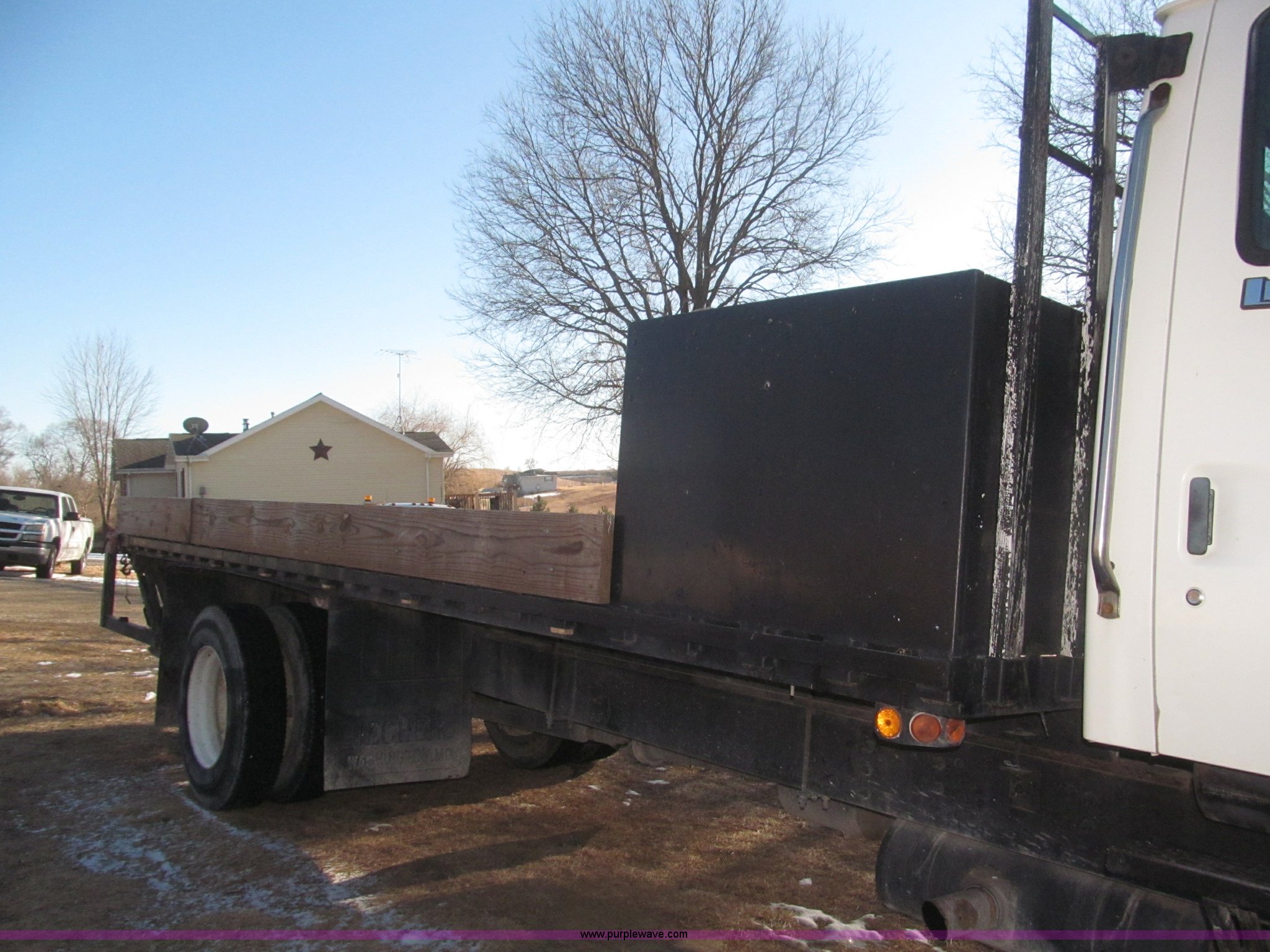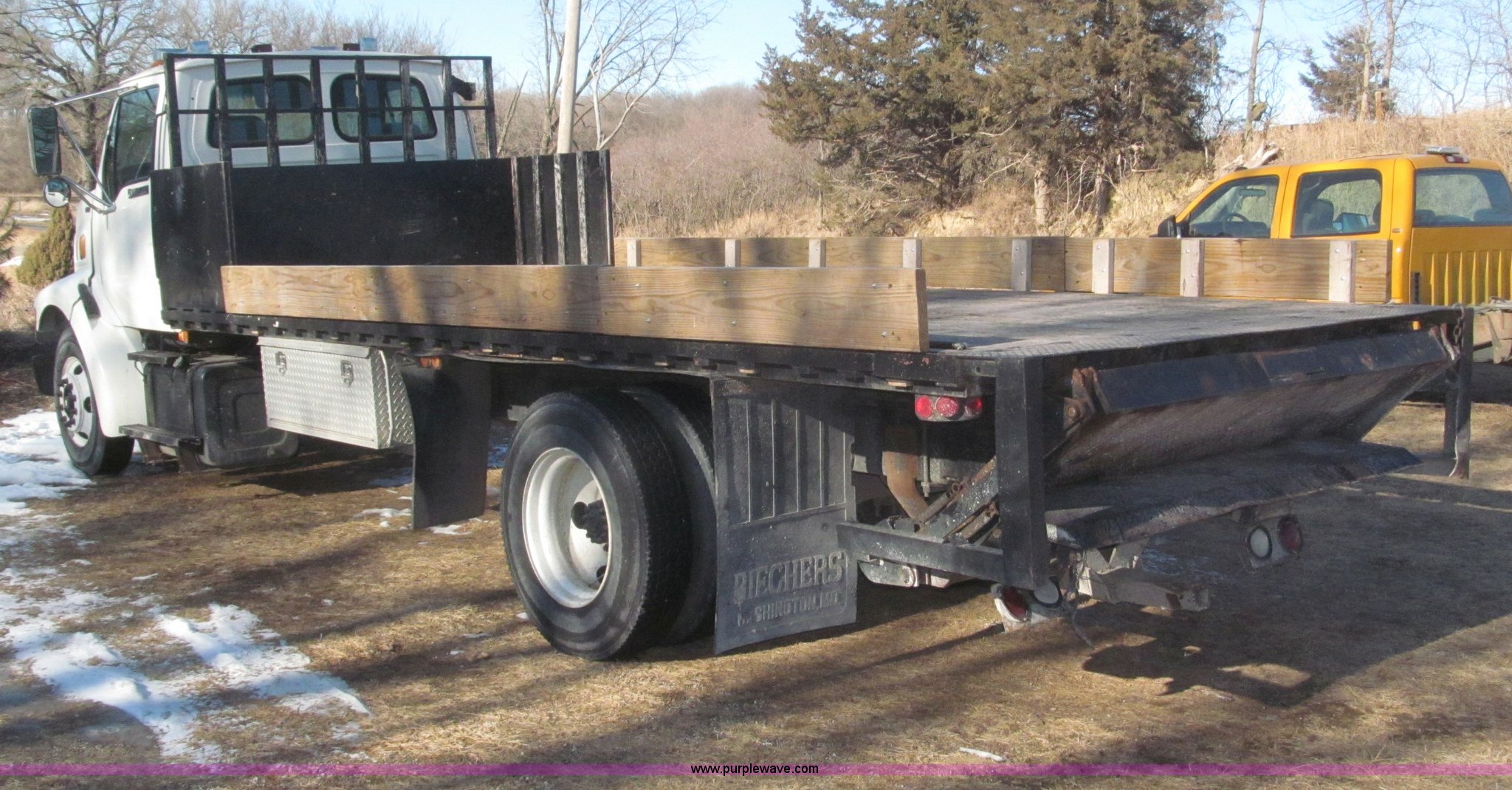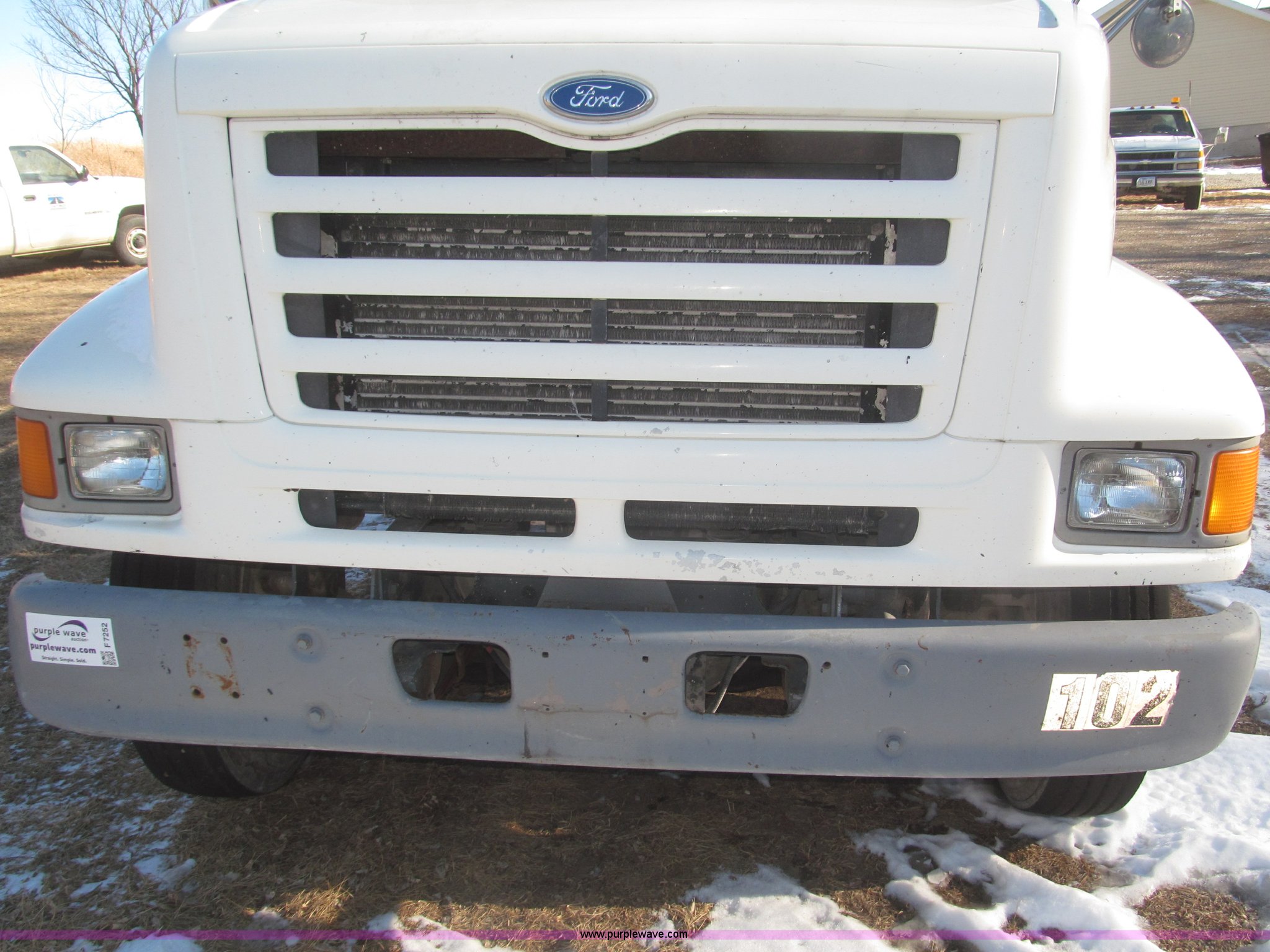 Purple Wave is selling a used Flat Bed Truck in Iowa. This item is a 1997 Ford L8501 Louisville 20' flatbed truck with lift gate with the following: 199,156 miles on odometer, Cummins ISB 5.9L L6 turbo diesel engine, Six speed manual transmission, AC and heat, AM/FM, Air suspension seat, Cloth interior, Twin rear windows, Roof mount horn, Headache rack, Block heater, Wood flatbed, 20'L x 94"W x 49.5"H, Lift gate, Removable side boards, Stake pockets, Aluminum toolbox, 48"W x 18"H x 18"D, 50 gallon fuel tank, 2" receiver hitch, Spring suspension, Air brakes, Mudflaps, 216" wheelbase, 10R22.5 tires, GVWR 26,000 lbs, FAWR 8,500 lbs, RAWR 17,500 lbs, Maintenance records available, Cracked windshield