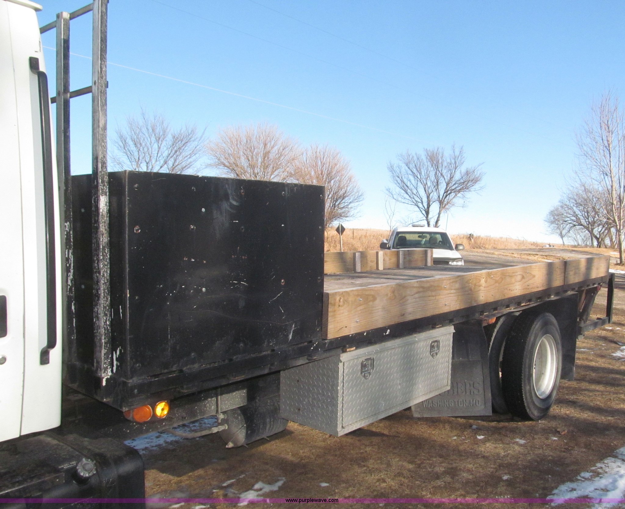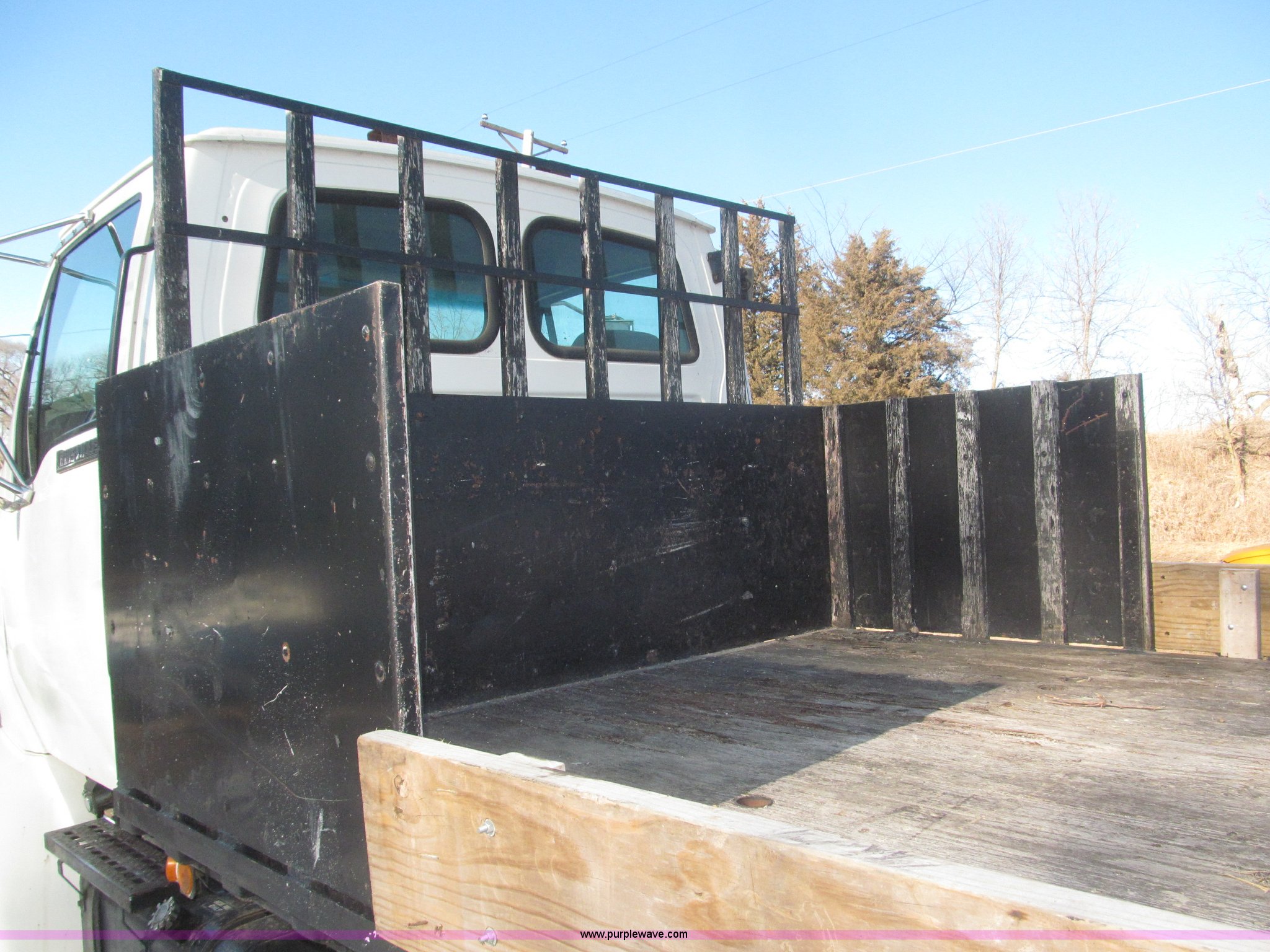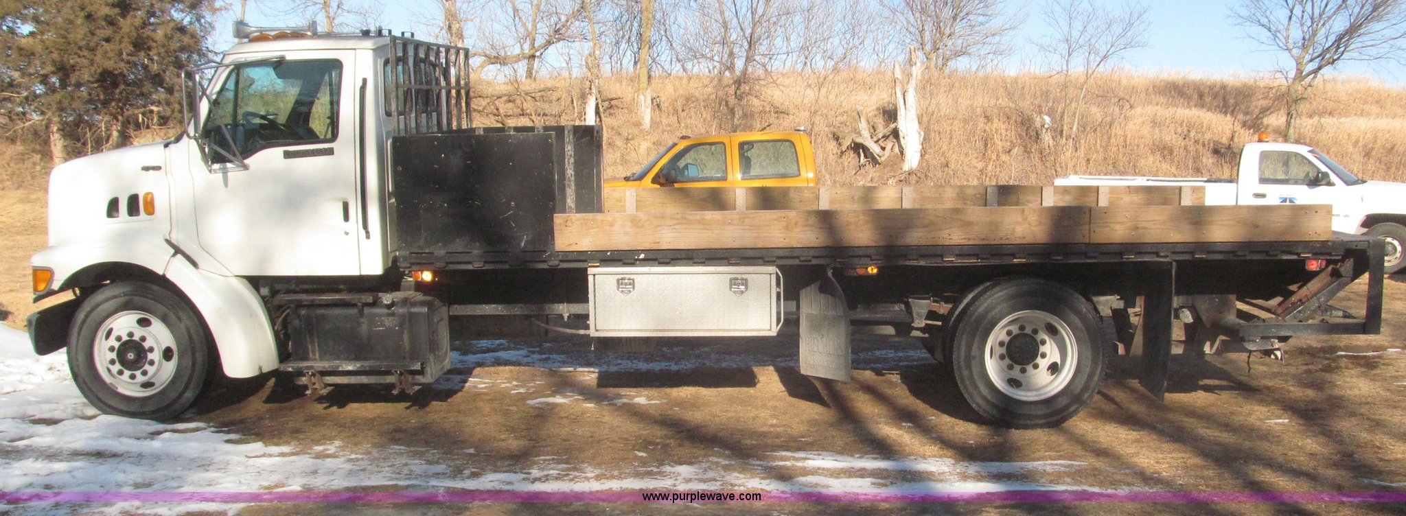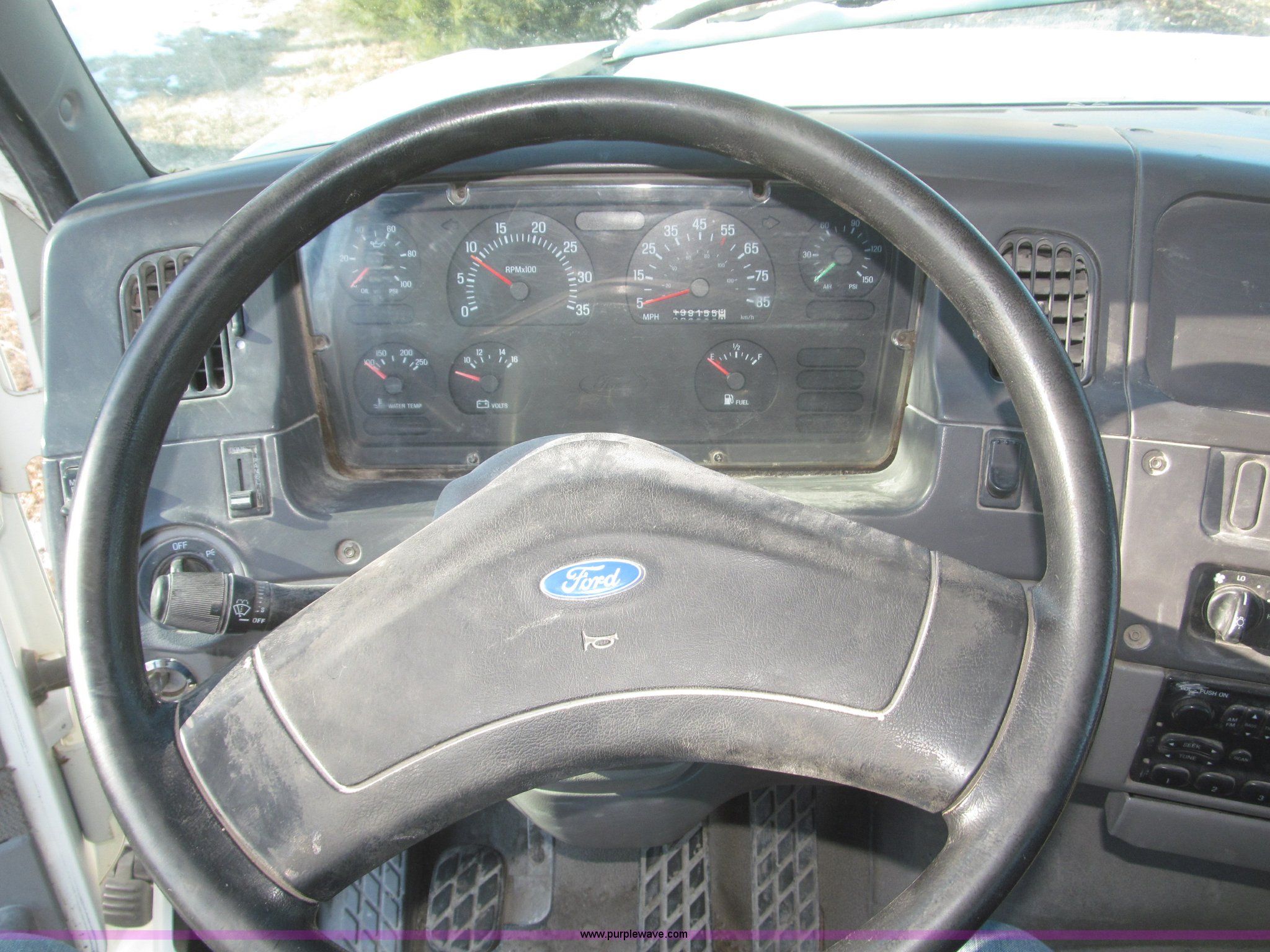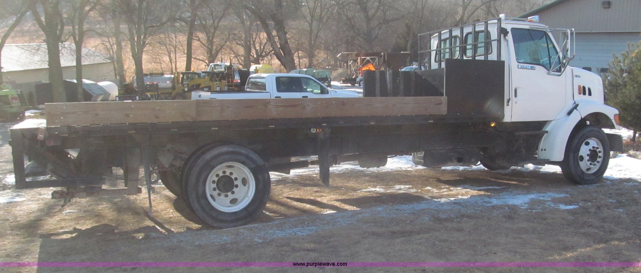Purple Wave is selling a used Flat Bed Truck in Iowa. This item is a 1997 Ford L8501 Louisville 20' flatbed truck with lift gate with the following: 199,156 miles on odometer, Cummins ISB 5.9L L6 turbo diesel engine, Six speed manual transmission, AC and heat, AM/FM, Air suspension seat, Cloth interior, Twin rear windows, Roof mount horn, Headache rack, Block heater, Wood flatbed, 20'L x 94"W x 49.5"H, Lift gate, Removable side boards, Stake pockets, Aluminum toolbox, 48"W x 18"H x 18"D, 50 gallon fuel tank, 2" receiver hitch, Spring suspension, Air brakes, Mudflaps, 216" wheelbase, 10R22.5 tires, GVWR 26,000 lbs, FAWR 8,500 lbs, RAWR 17,500 lbs, Maintenance records available, Cracked windshield