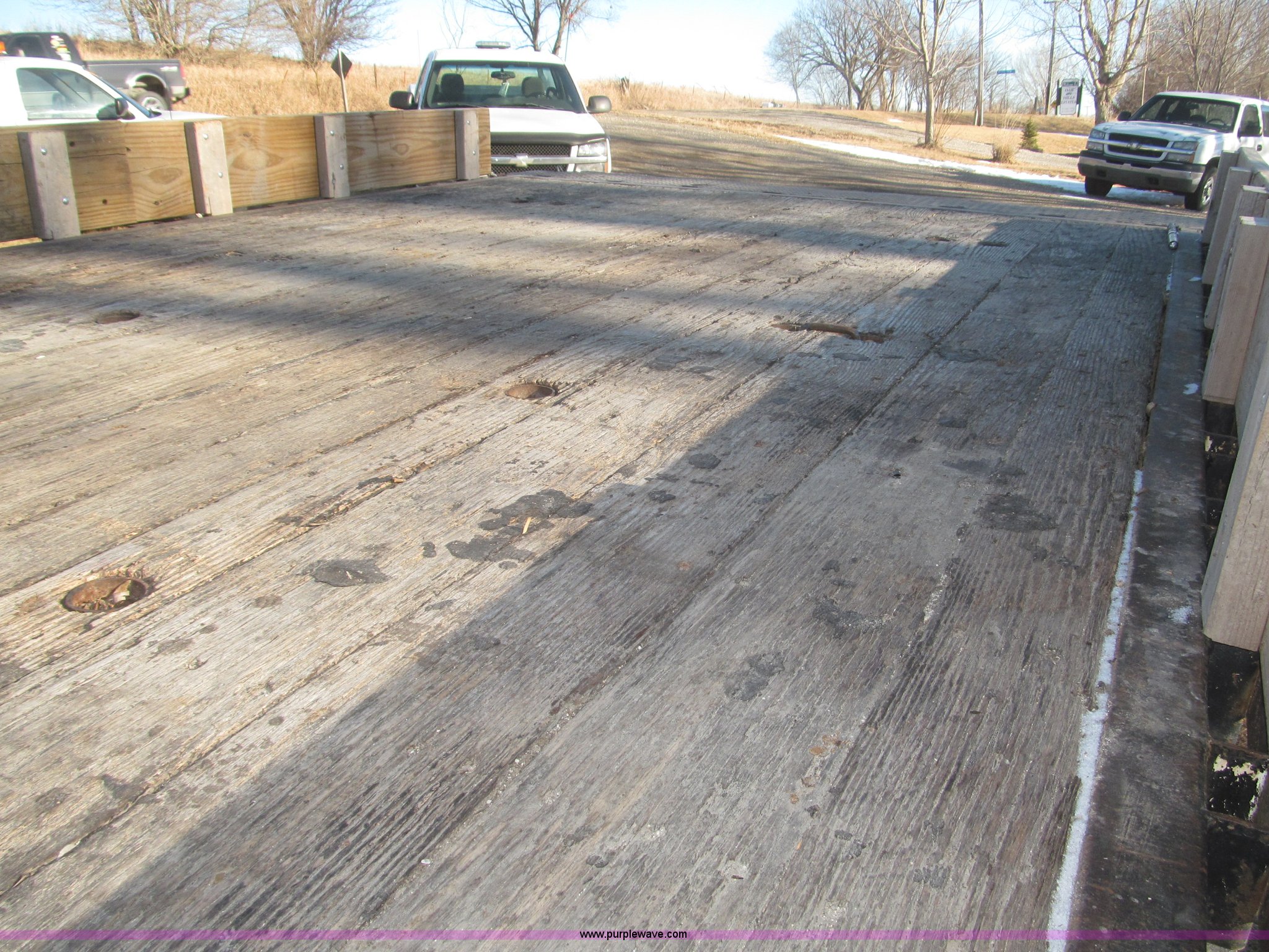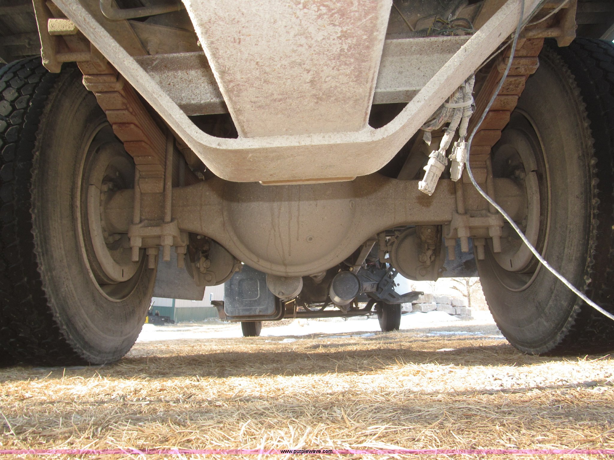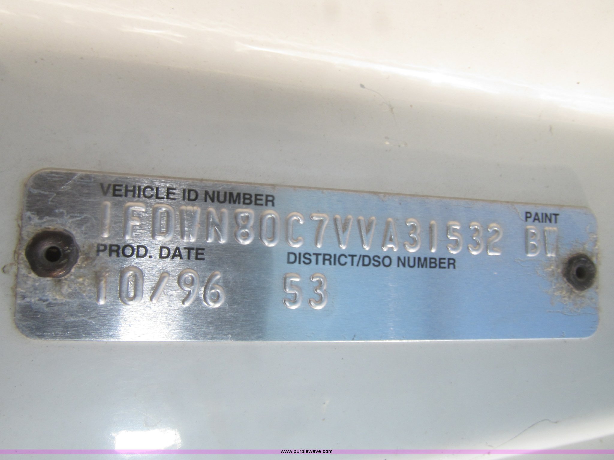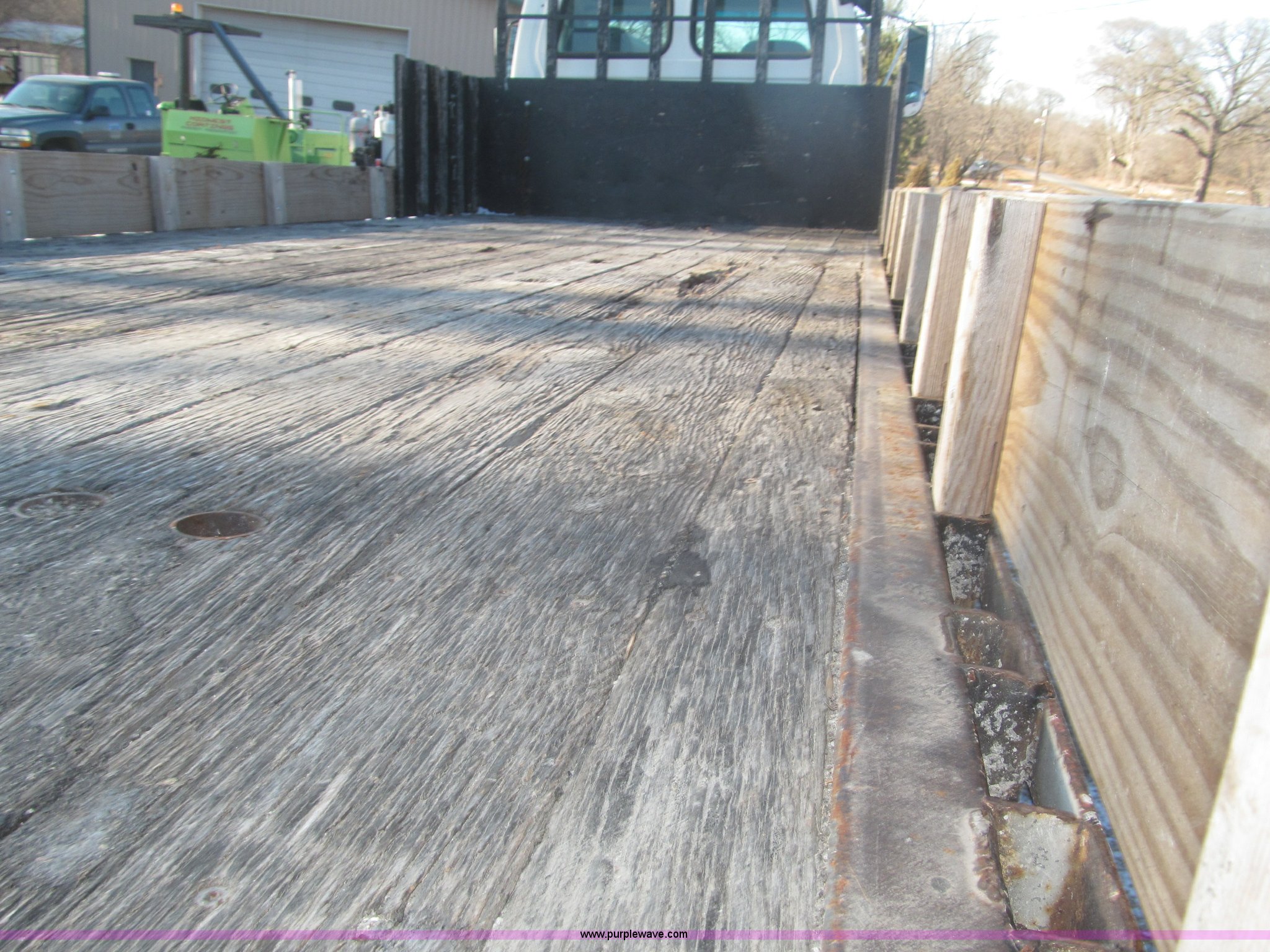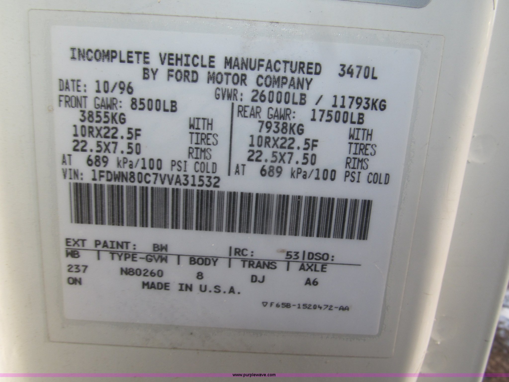 1997 Ford L8501 Louisville 20' flatbed truck with lift gate. 199,156 miles on odometer, Cummins ISB 5.9L L6 turbo diesel engine, Six speed manual transmission, AC and heat, AM/FM, Air suspension seat, Cloth interior, Twin rear windows, Roof mount horn, Headache rack, Block heater, Wood flatbed 20'L x 94"W x 49.5"H, Lift gate, Removable side boards, Stake pockets, Aluminum toolbox 48"W x 18"H x 18"D, 50 gallon fuel tank, 2" receiver hitch, Spring suspension, Air brakes, Mudflaps, 216" wheelbase, 10R22.5 tires, GVWR 26,000 lbs, FAWR 8,500 lbs, RAWR 17,500 lbs, Maintenance records available, Cracked windshield. 1FDWN80C7VVA31532. View equipment video. Midwest Coatings. 2438 335th St. Missouri Valley, IA 51555
