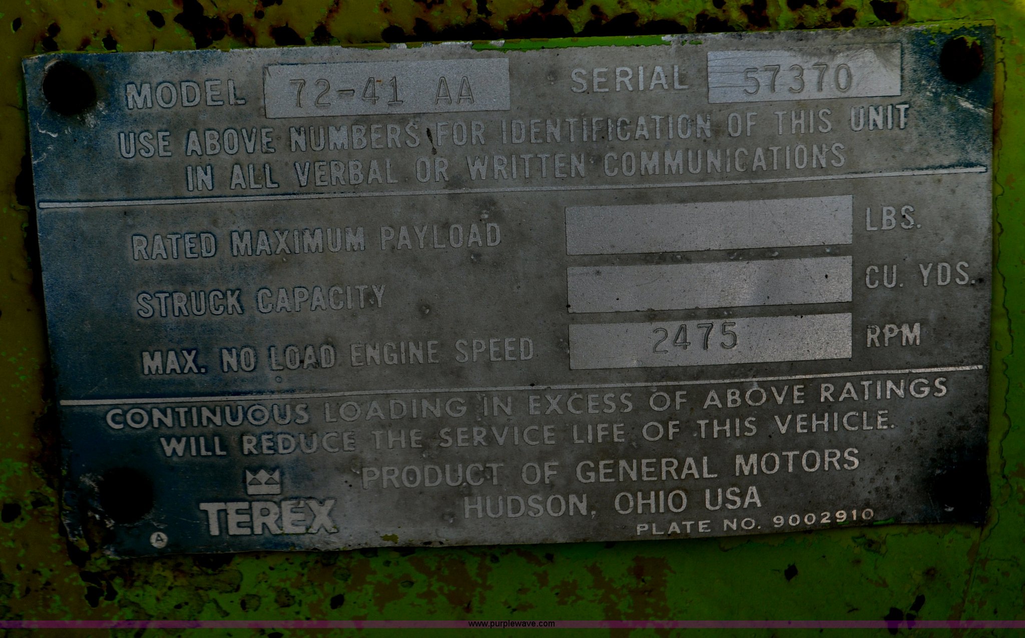 Purple Wave is selling a used Wheel Loader in South Dakota. This item is a 1973 Terex 72-41 AA loader with the following: 569 hours on meter, Detroit Diesel 471 four cylinder diesel engine, Powershift transmission, 3F-3R gears, Work lights, 114" pin-on bucket, 23.5-25 tires, 30,305 lbs. base operating weight, Service records available, Serial 57370, Unit# 423