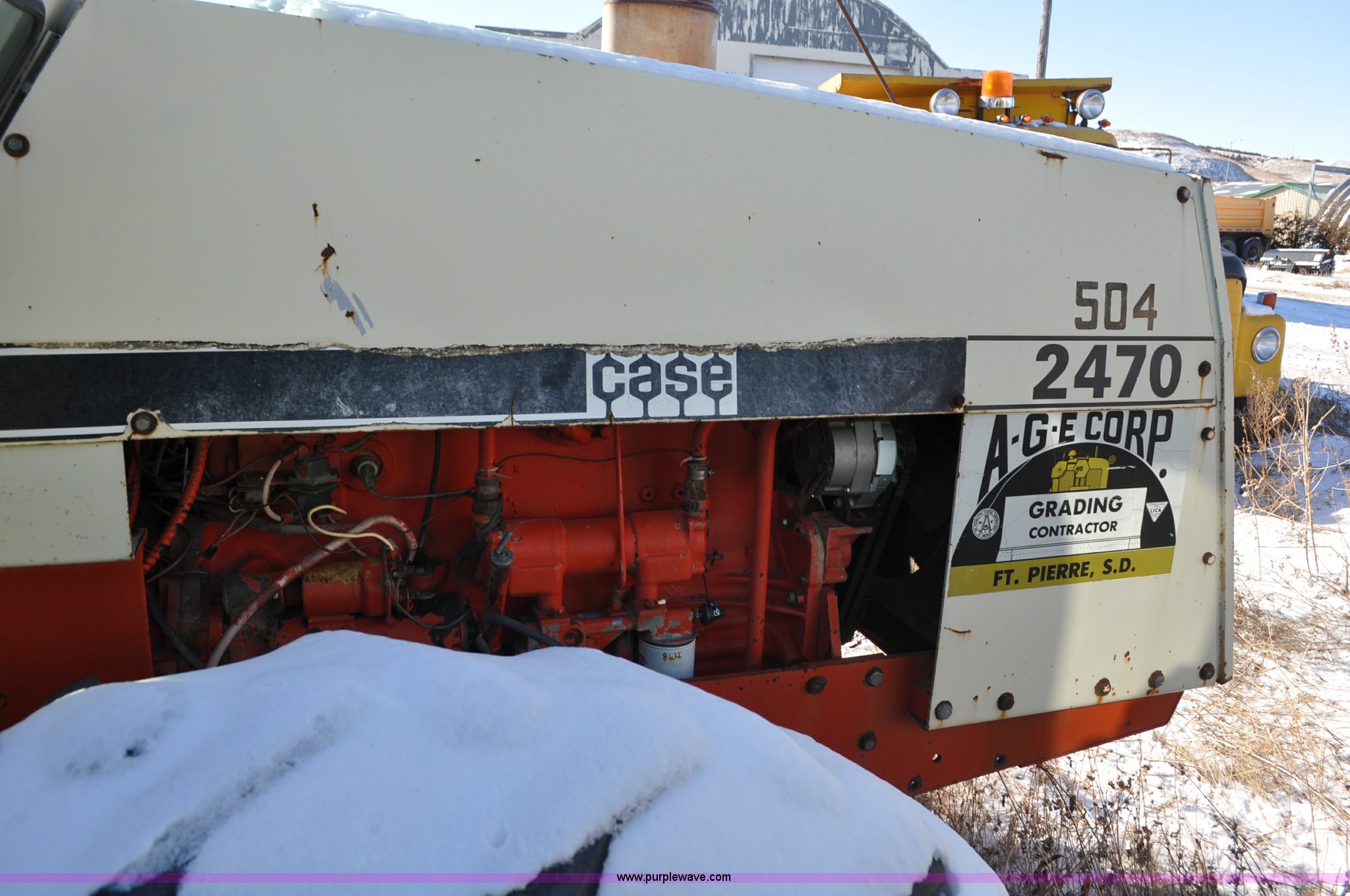 1973 Case 2470 4WD tractor. 6,855 hours on meter, Case 504 six cylinder diesel engine 154 HP, Partial powershift transmission 12F-2R gears, Spring suspension seat, All wheel steer, Draw bar, (2) rear hydraulic remotes, 110 gallon fuel capacity, 23.1-30 tires, Non-operational, parts only, Service records available, Serial 8711814, Unit# 504. A-G-E Corporation. 704 West Highway 14&34. Ft. Pierre, SD 57532