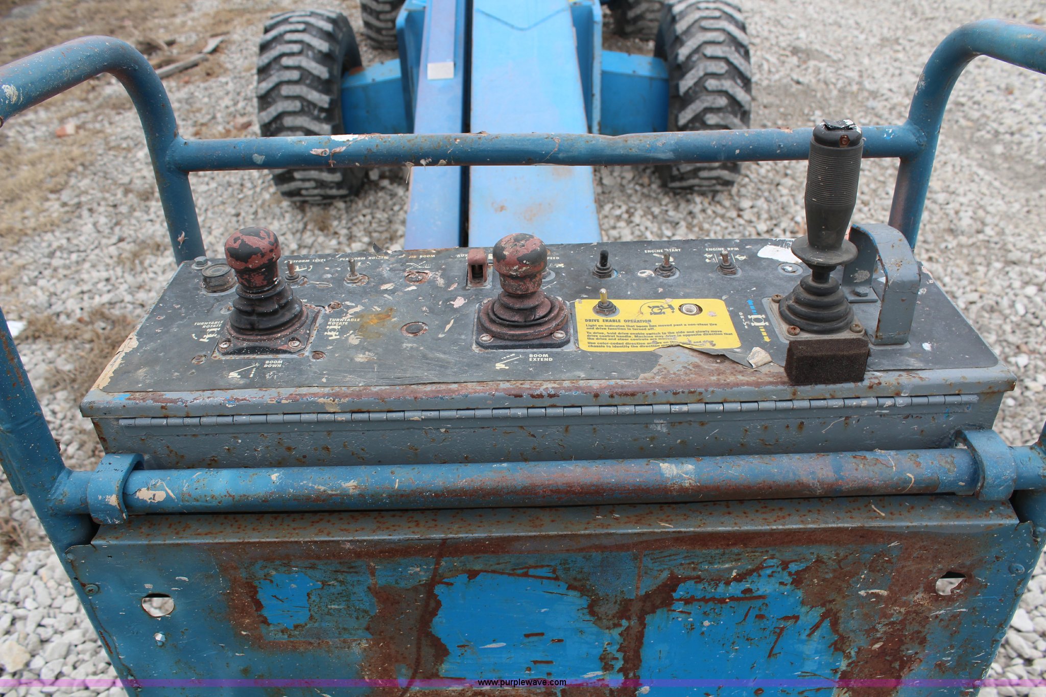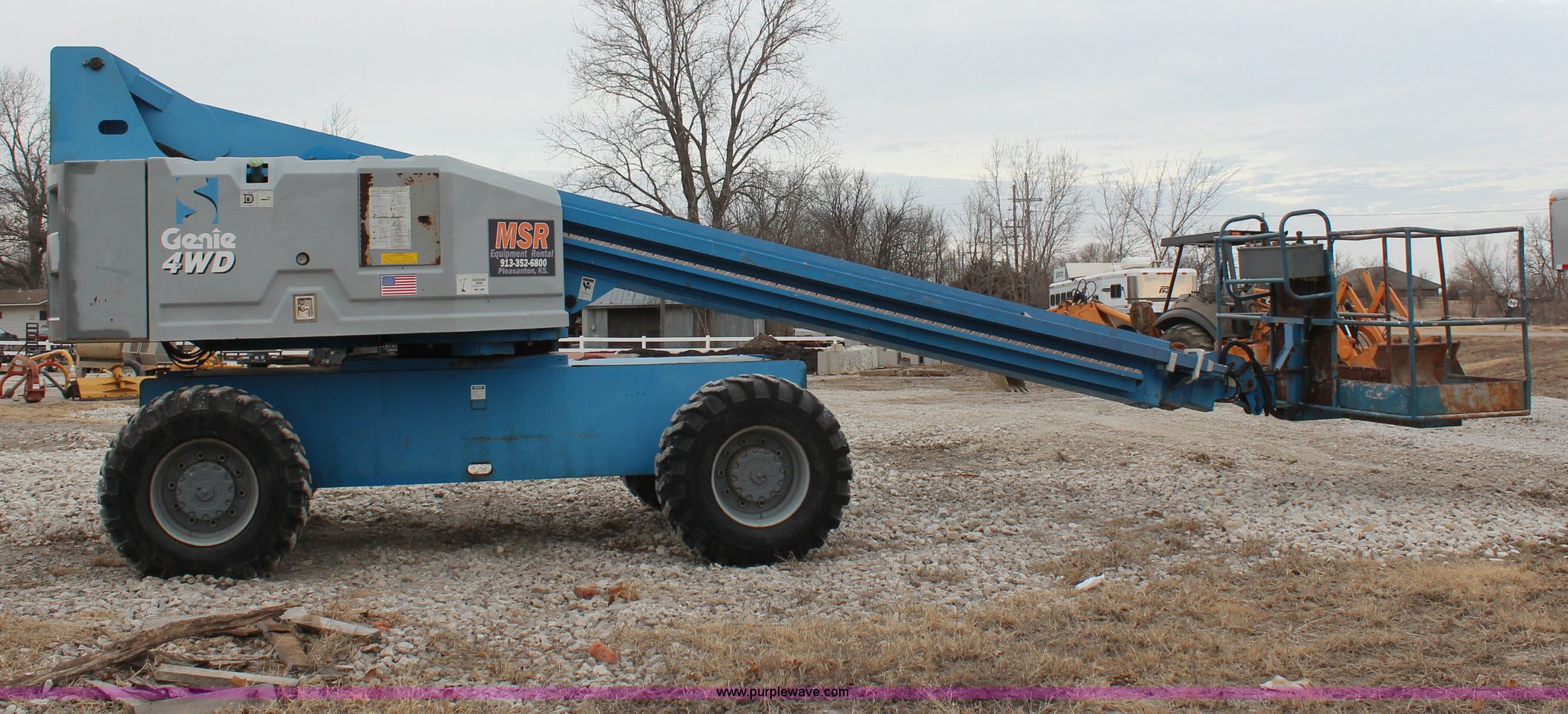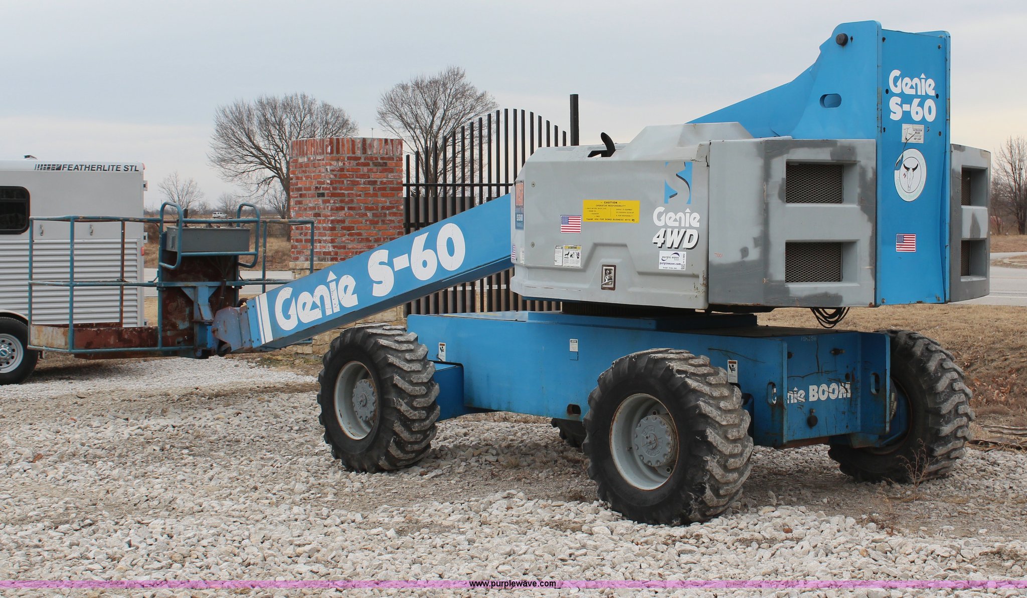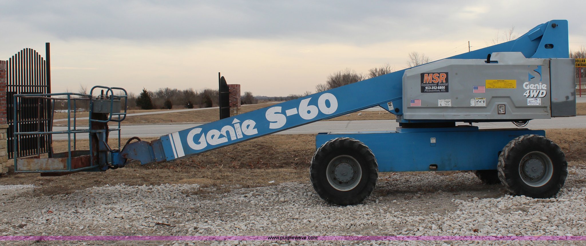 Purple Wave is selling a used Boom Lift in Kansas. This item is a 1997 Genie S60 boom lift with the following: 4,807 hours on meter, Hours may vary, still in use, Deutz air-cooled diesel engine, Four wheel drive, 60' max platform height, 51'3" max platform reach, 8' bucket, 500 lbs maximum capacity, 15-19.5 tires, Serial 1916